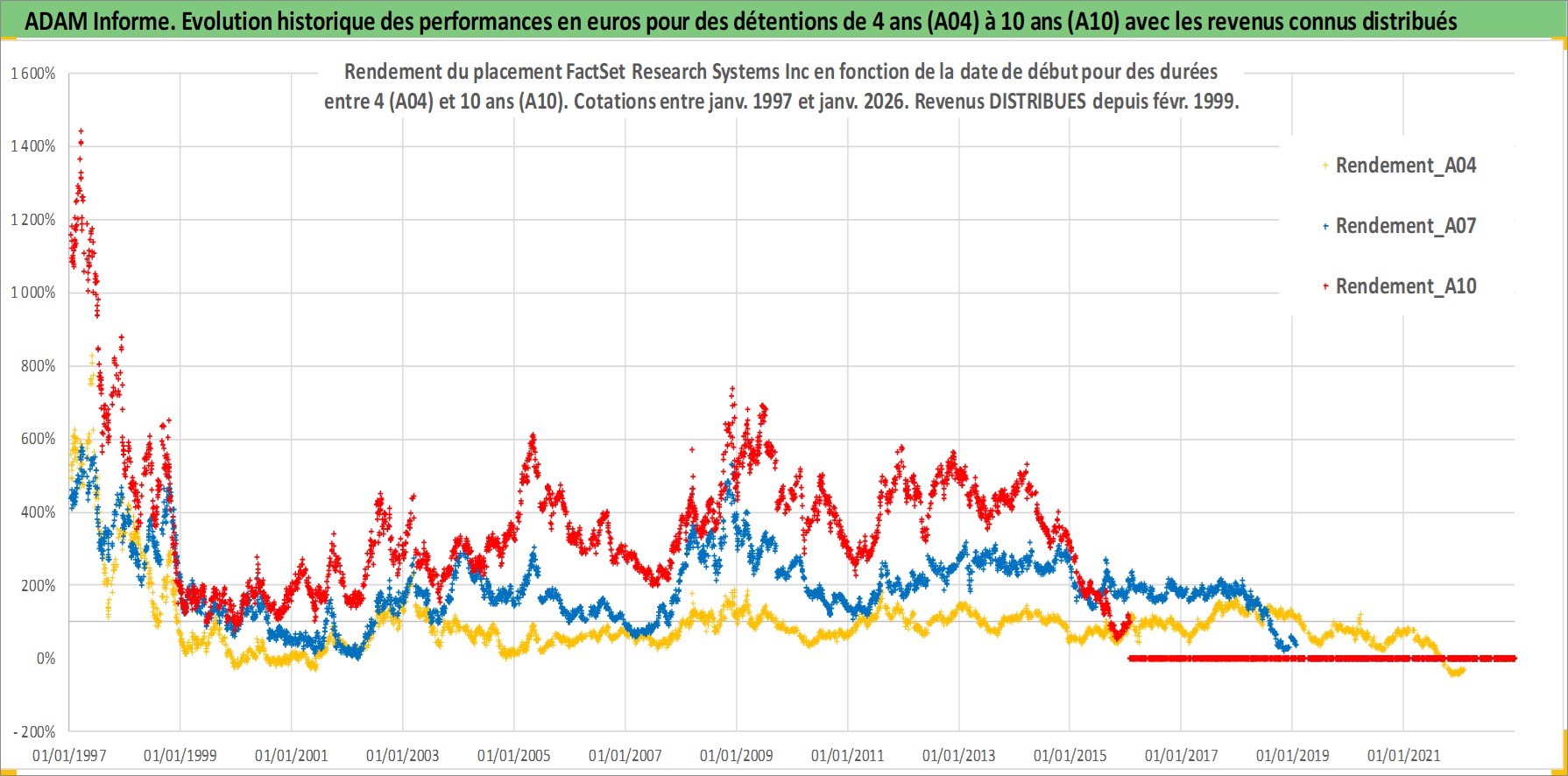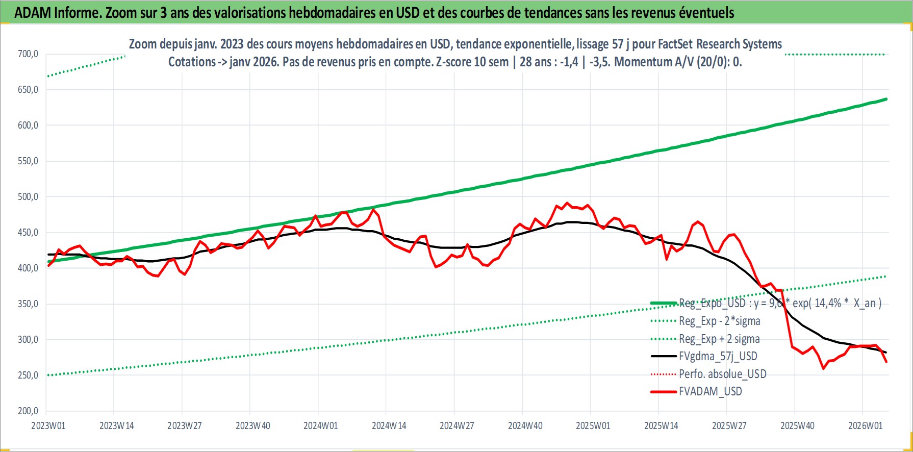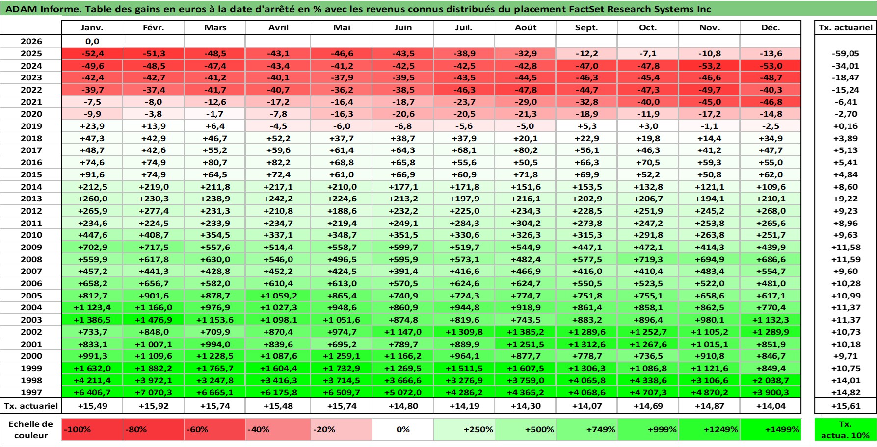 Site dédié aux investisseursPage dédiée sur site financeAnalyse des valorisations hebdomadaires de l'action FactSet Research Systems Inc. Cet actif est cote en USD. Les valorisations sont en contrevaleur EURO et couvrent les semaines 1997W01 a 2026W05. Les revenus de cet actif financier sont pris en compte depuis la semaine 1999W08. La note globale ESG de cet actif est estimee a 10.0 (apres rebasage entre 0 et 20).