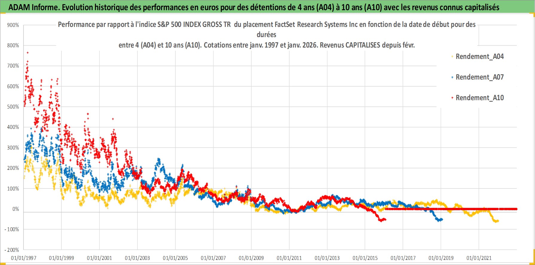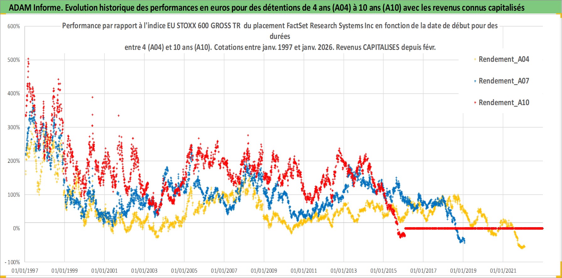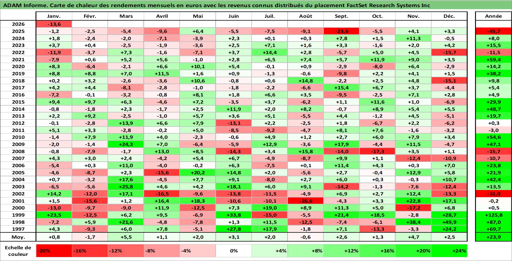 Site dédié aux investisseursPage dédiée sur site financeAnalyse des valorisations hebdomadaires de l'action FactSet Research Systems Inc. Cet actif est cote en USD. Les valorisations sont en contrevaleur EURO et couvrent les semaines 1997W01 a 2026W05. Les revenus de cet actif financier sont pris en compte depuis la semaine 1999W08. La note globale ESG de cet actif est estimee a 10.0 (apres rebasage entre 0 et 20).