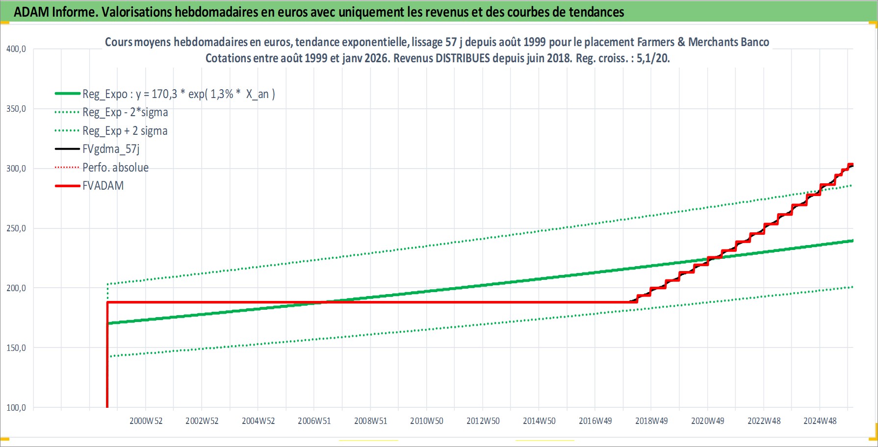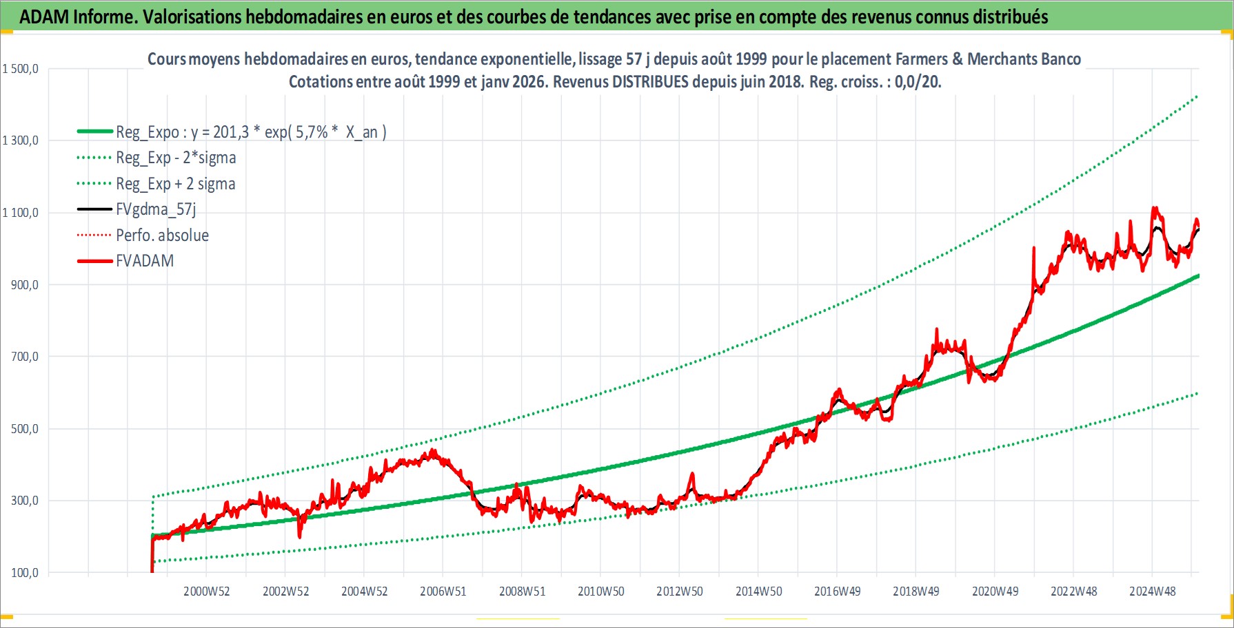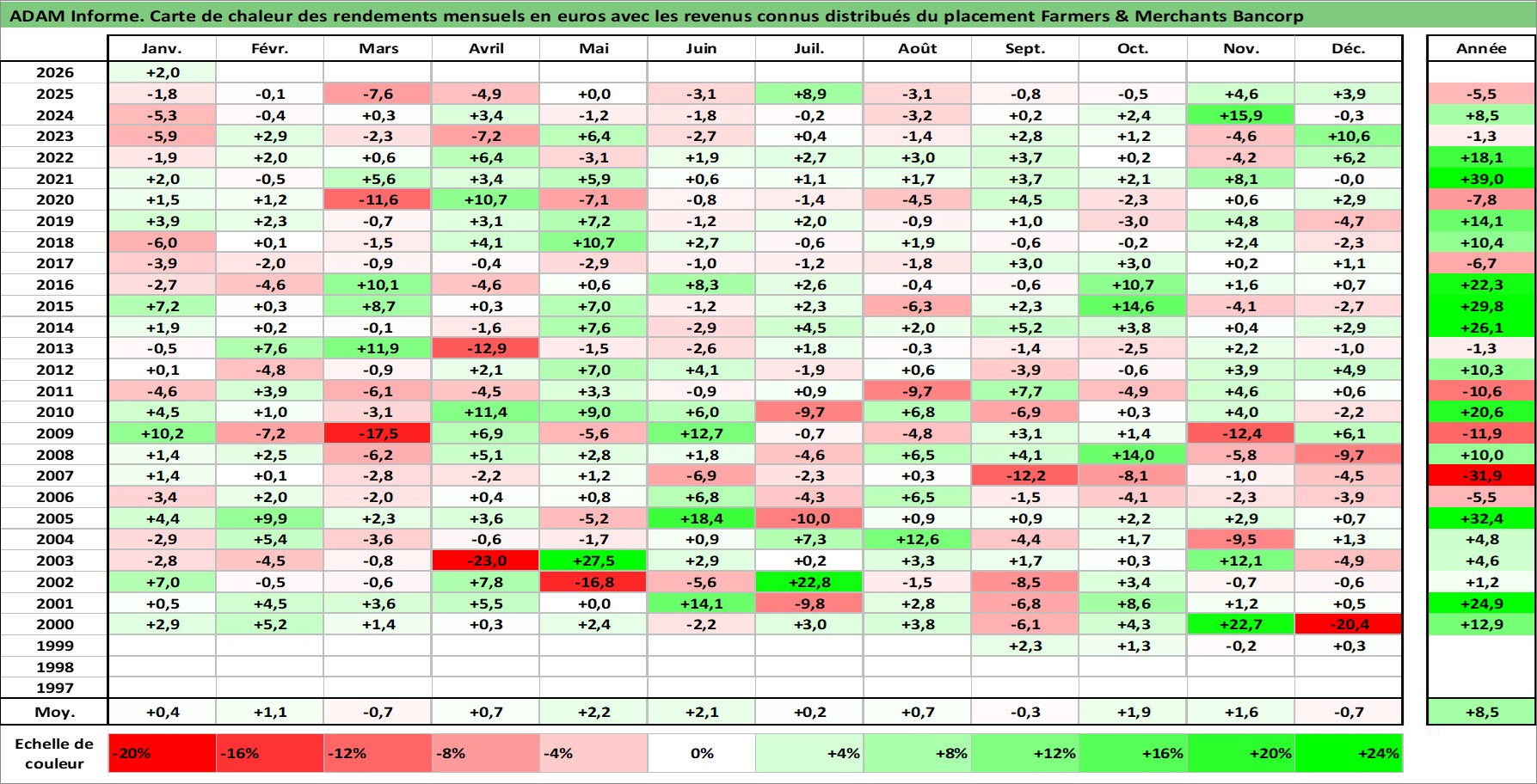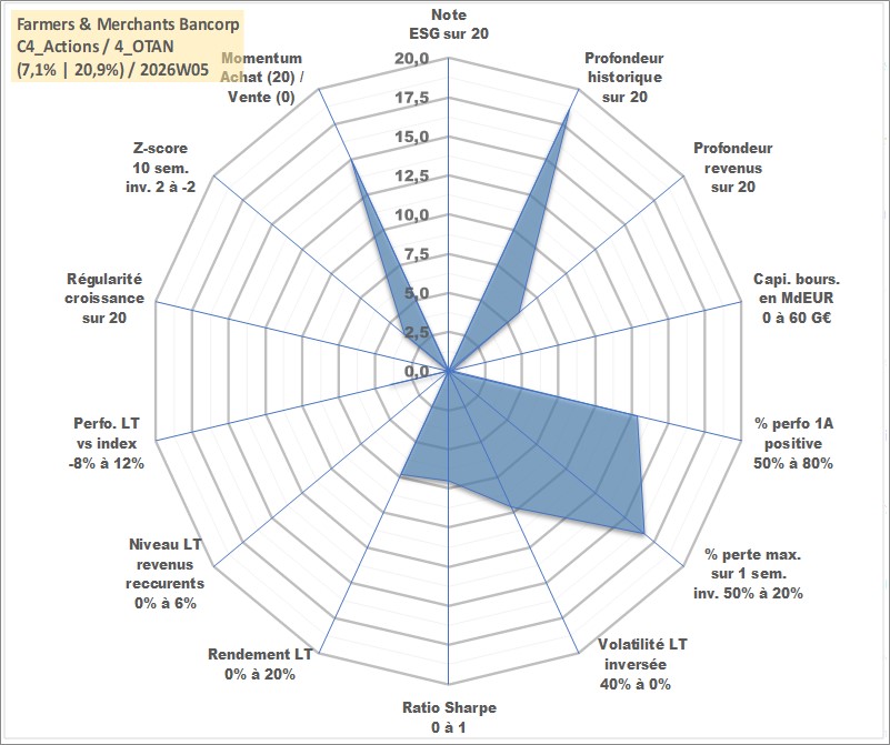 Site dédié aux investisseursPage dédiée sur site financeAnalyse des valorisations hebdomadaires de l'action Farmers & Merchants Bancorp. Cet actif est cote en USD. Les valorisations sont en contrevaleur EURO et couvrent les semaines 1999W33 a 2026W05. Les revenus de cet actif financier sont pris en compte depuis la semaine 2018W23. La note ESG de cet actif n'est pas connue.
