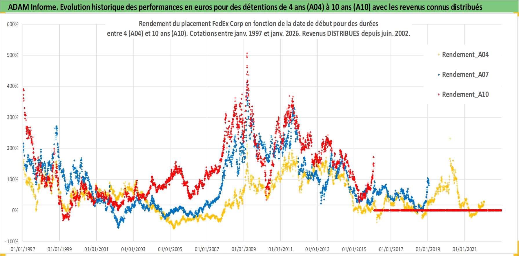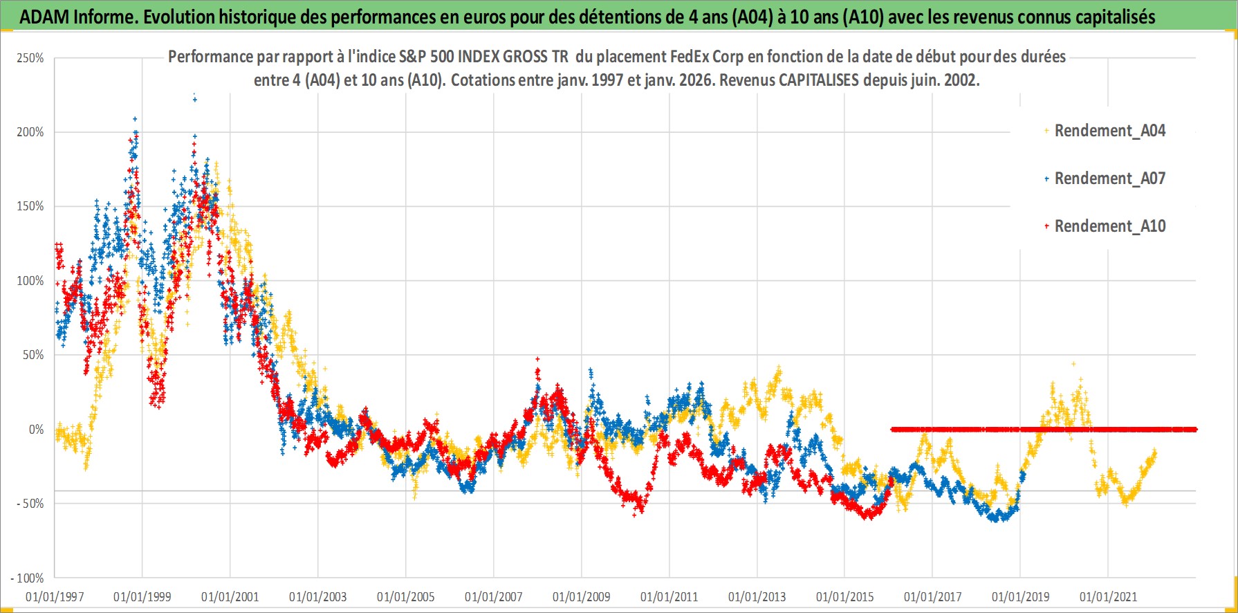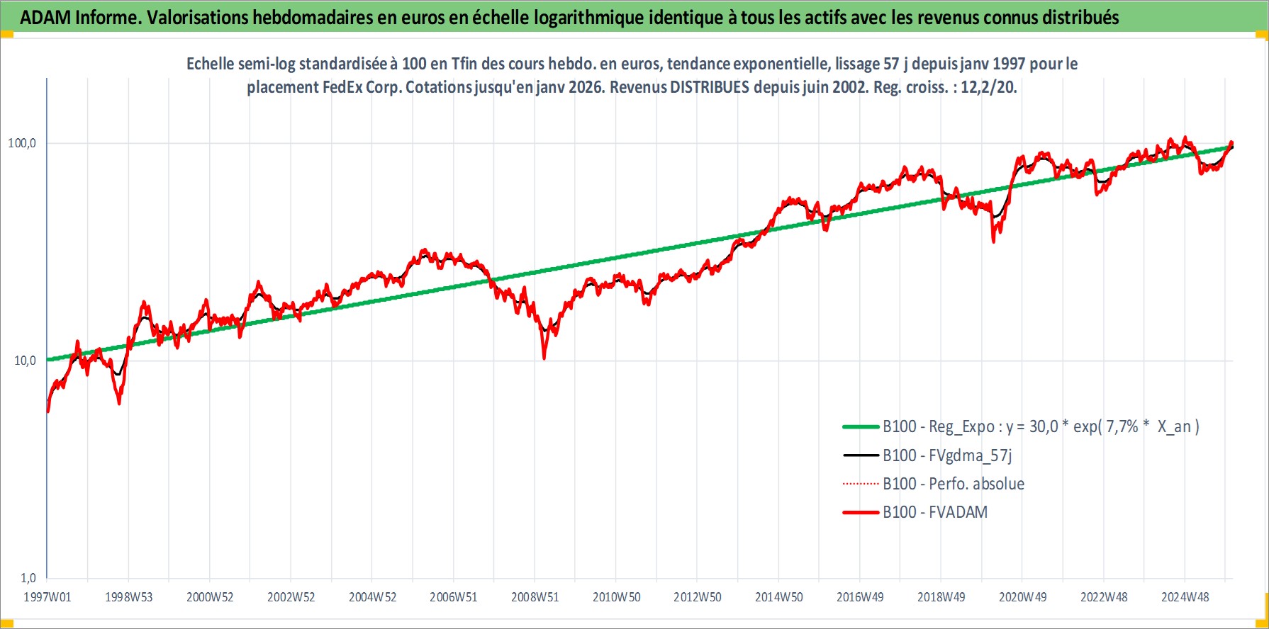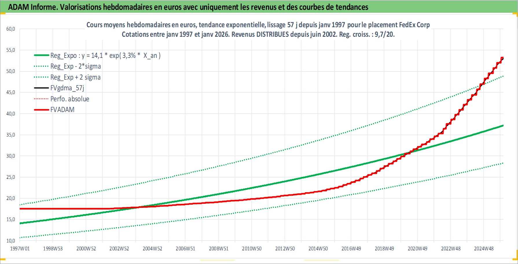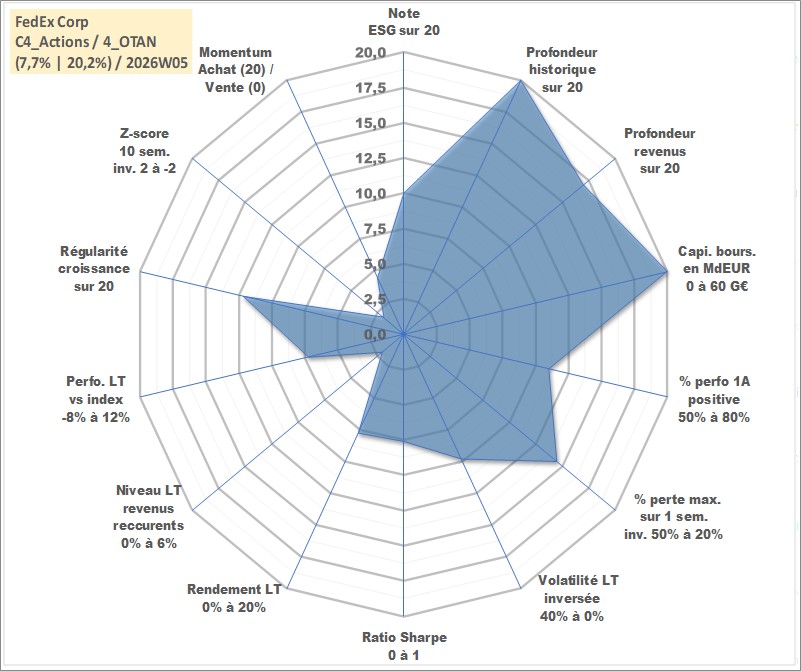 Site dédié aux investisseursPage dédiée sur site financeAnalyse des valorisations hebdomadaires de l'action FedEx Corp. Cet actif est cote en USD. Les valorisations sont en contrevaleur EURO et couvrent les semaines 1997W01 a 2026W05. Les revenus de cet actif financier sont pris en compte depuis la semaine 2002W24. La note globale ESG de cet actif est estimee a 10.0 (apres rebasage entre 0 et 20).