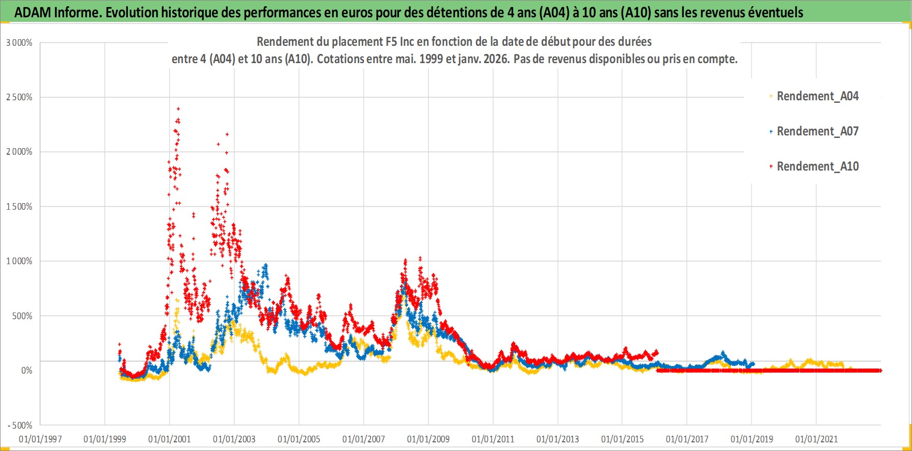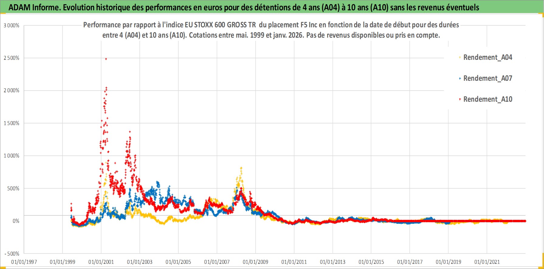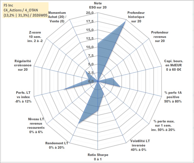 Site dédié aux investisseursPage dédiée sur site financeAnalyse des valorisations hebdomadaires de l'action F5 Inc. Cet actif est cote en USD. Les valorisations sont en contrevaleur EURO et couvrent les semaines 1999W22 a 2026W05. Les revenus de cet actif financier ne sont pas connus car non existants ou non disponibles sur le site Yahoo Finance. La note globale ESG de cet actif est estimee a 11.0 (apres rebasage entre 0 et 20).