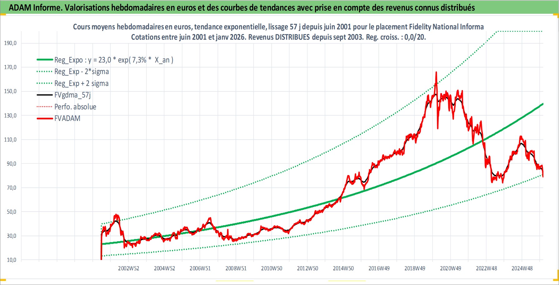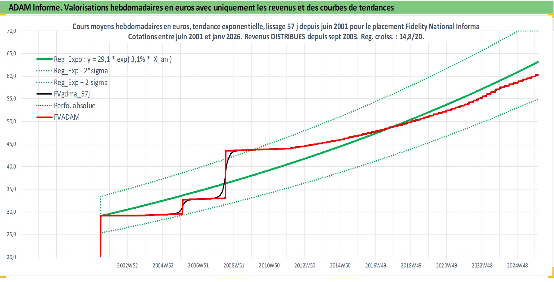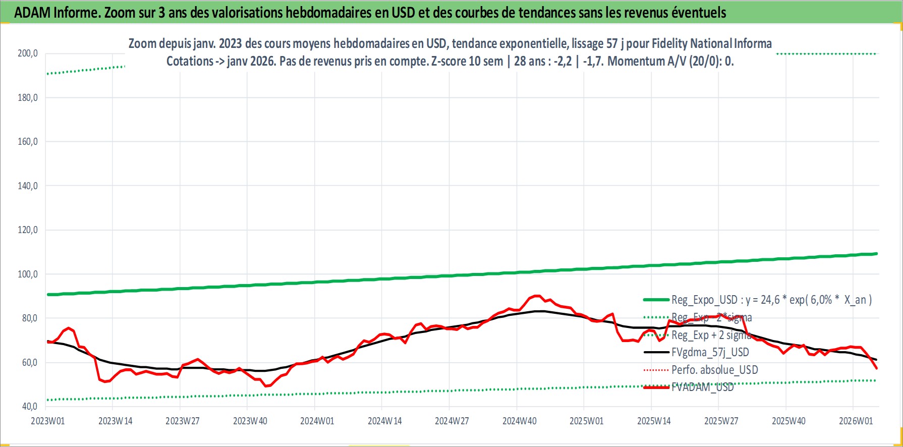 Site dédié aux investisseursPage dédiée sur site financeAnalyse des valorisations hebdomadaires de l'action Fidelity National Information Services I. Cet actif est cote en USD. Les valorisations sont en contrevaleur EURO et couvrent les semaines 2001W25 a 2026W05. Les revenus de cet actif financier sont pris en compte depuis la semaine 2003W40. La note globale ESG de cet actif est estimee a 11.0 (apres rebasage entre 0 et 20).