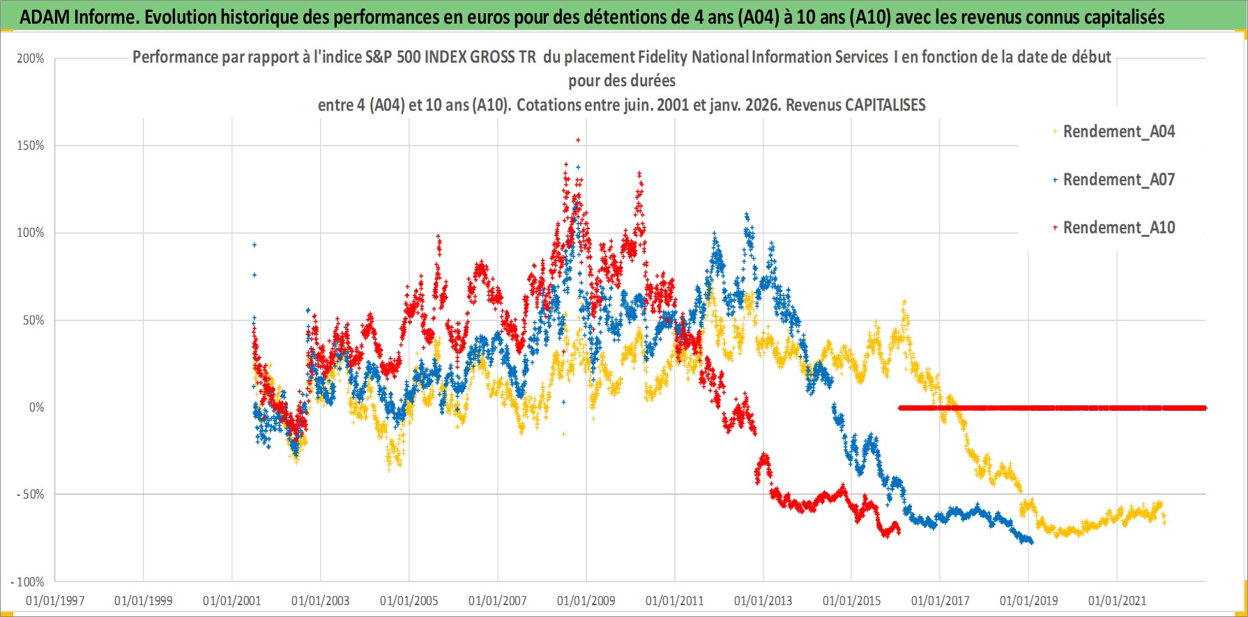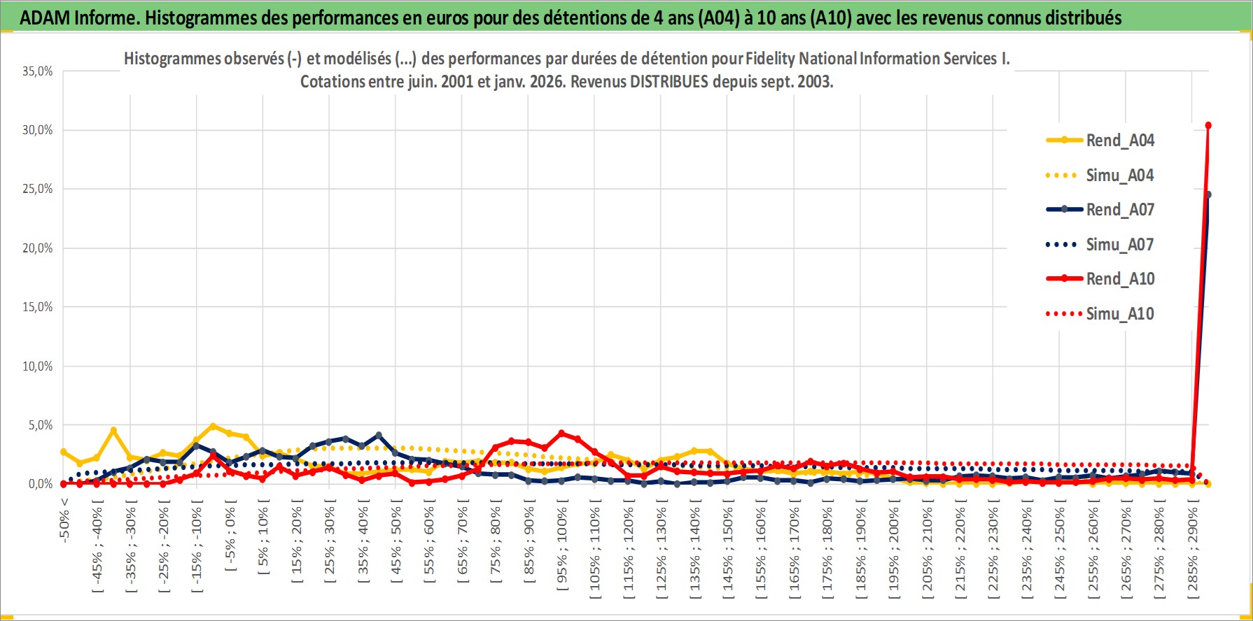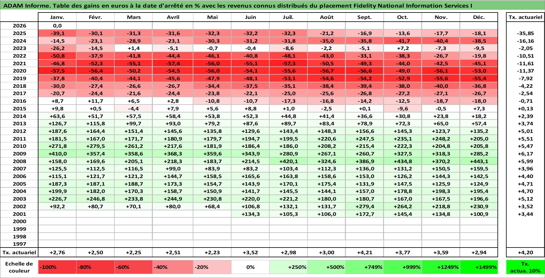 Site dédié aux investisseursPage dédiée sur site financeAnalyse des valorisations hebdomadaires de l'action Fidelity National Information Services I. Cet actif est cote en USD. Les valorisations sont en contrevaleur EURO et couvrent les semaines 2001W25 a 2026W05. Les revenus de cet actif financier sont pris en compte depuis la semaine 2003W40. La note globale ESG de cet actif est estimee a 11.0 (apres rebasage entre 0 et 20).