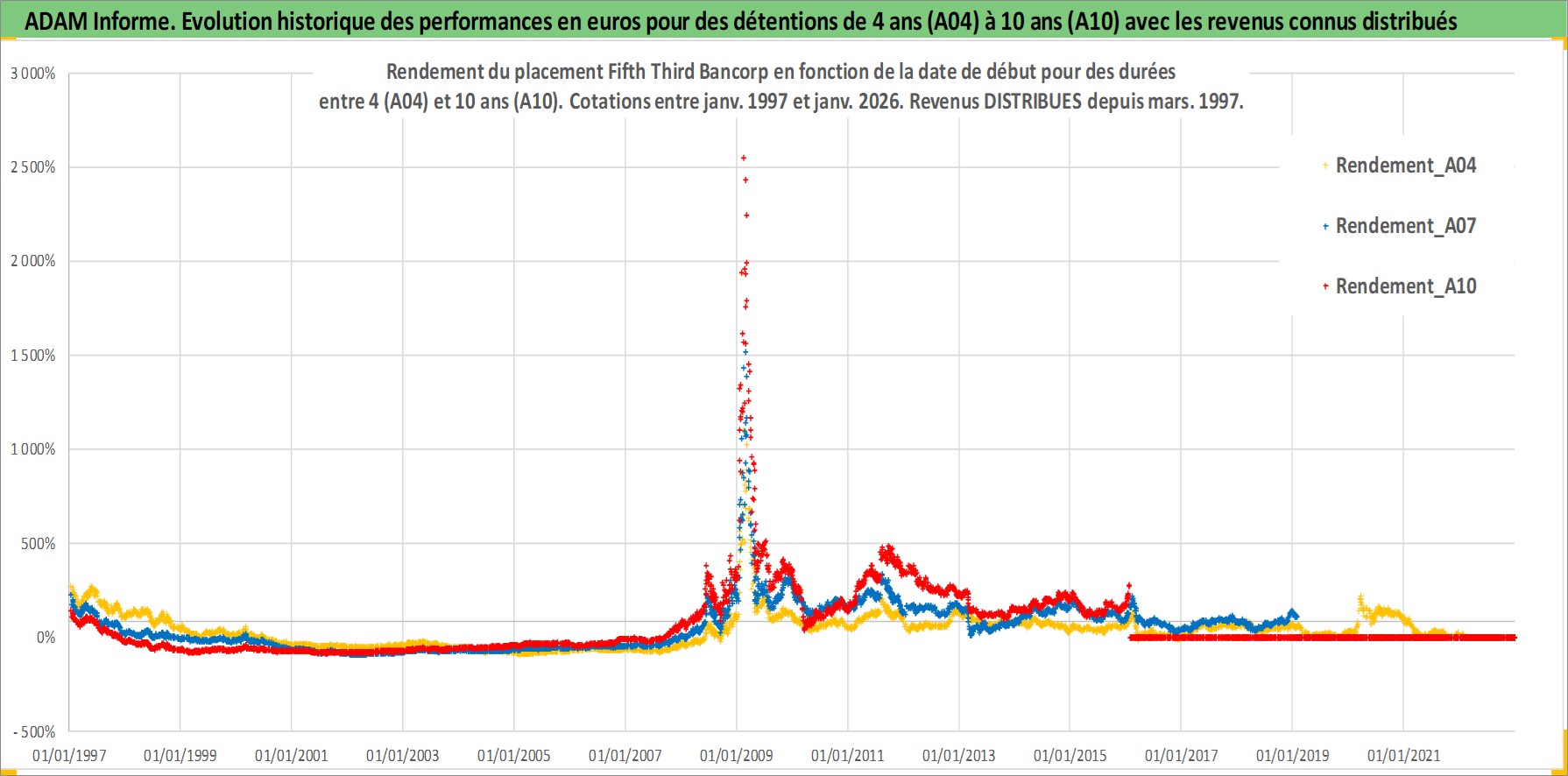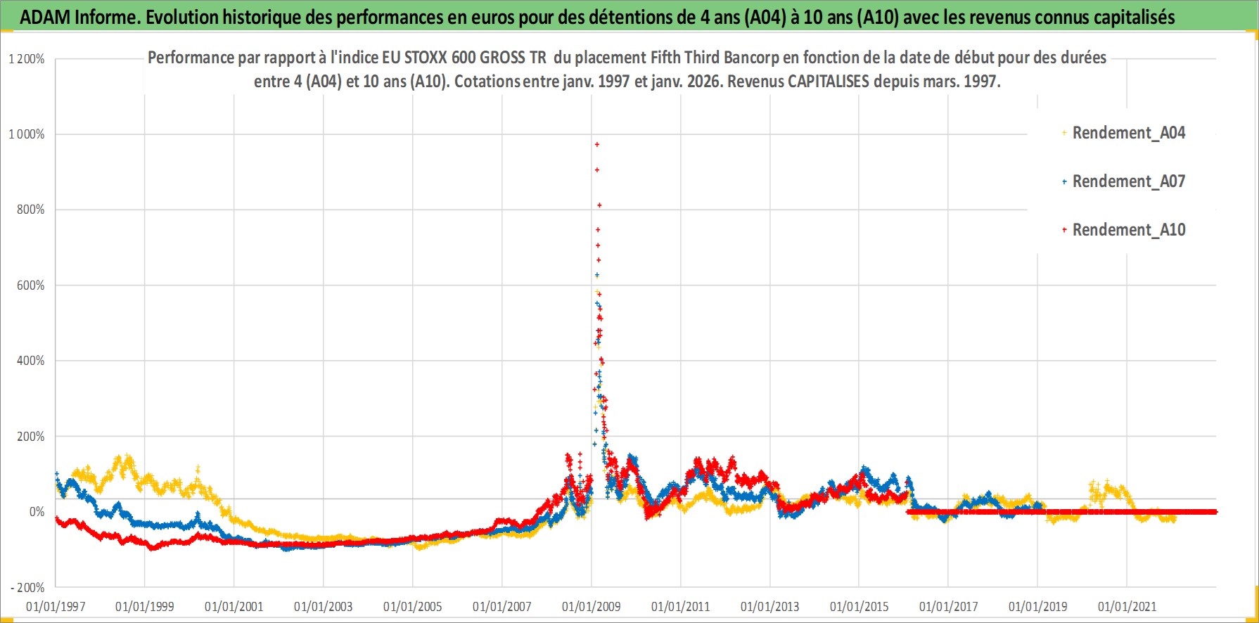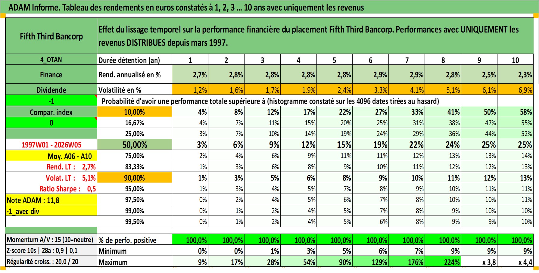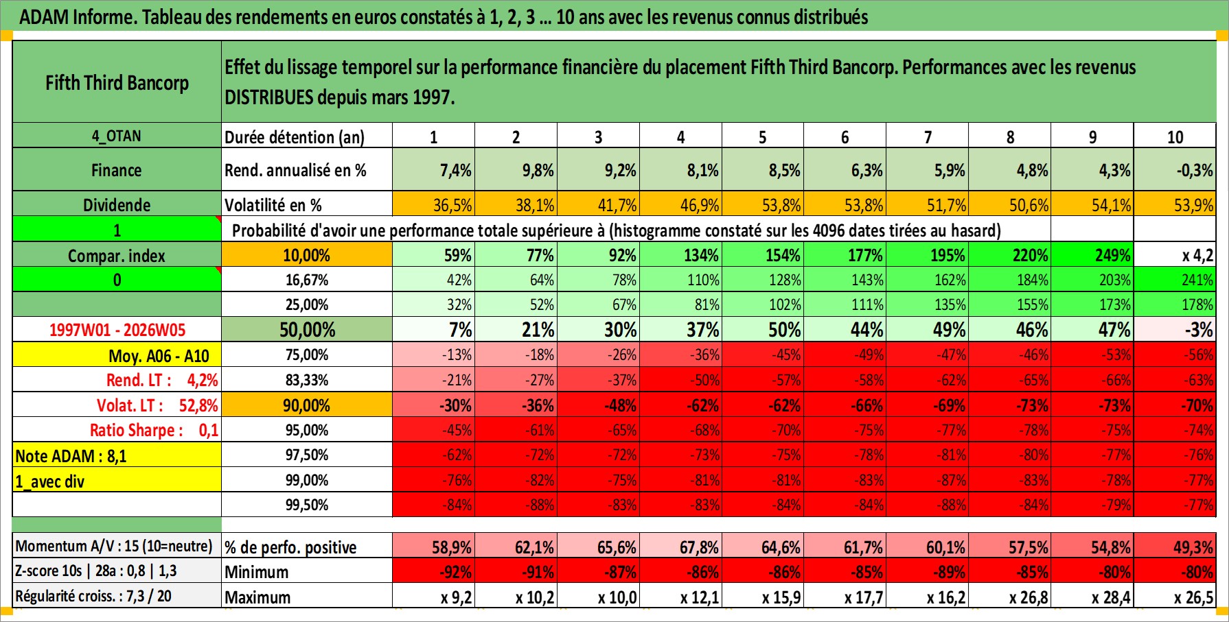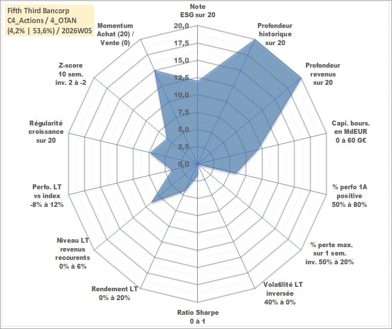 Site dédié aux investisseursPage dédiée sur site financeAnalyse des valorisations hebdomadaires de l'action Fifth Third Bancorp. Cet actif est cote en USD. Les valorisations sont en contrevaleur EURO et couvrent les semaines 1997W01 a 2026W05. Les revenus de cet actif financier sont pris en compte depuis la semaine 1997W13. La note globale ESG de cet actif est estimee a 12.0 (apres rebasage entre 0 et 20).