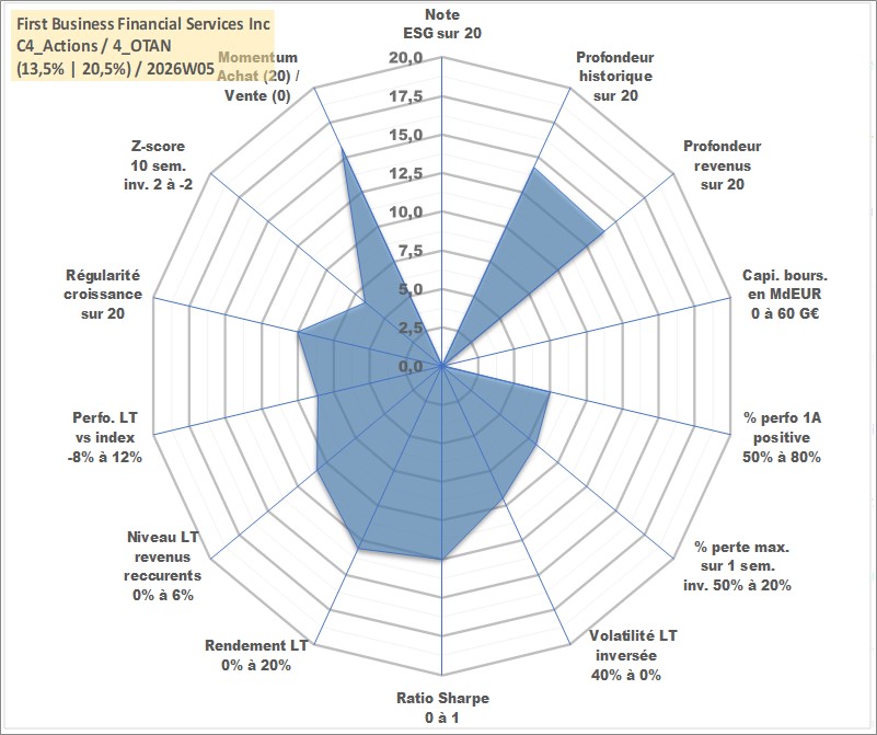 Site dédié aux investisseursPage dédiée sur site financeAnalyse des valorisations hebdomadaires de l'action First Business Financial Services Inc. Cet actif est cote en USD. Les valorisations sont en contrevaleur EURO et couvrent les semaines 2005W45 a 2026W05. Les revenus de cet actif financier sont pris en compte depuis la semaine 2005W52. La note ESG de cet actif n'est pas connue.