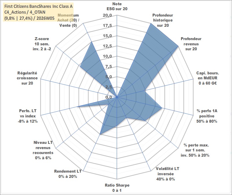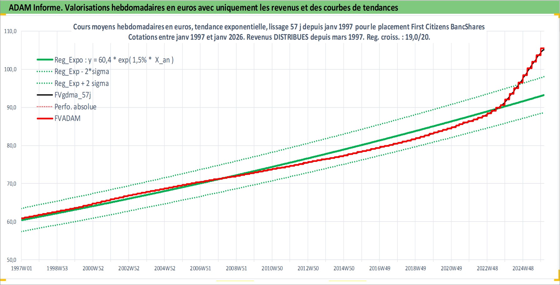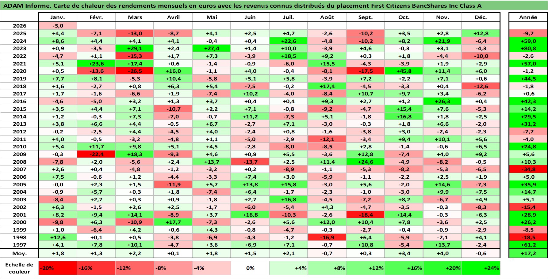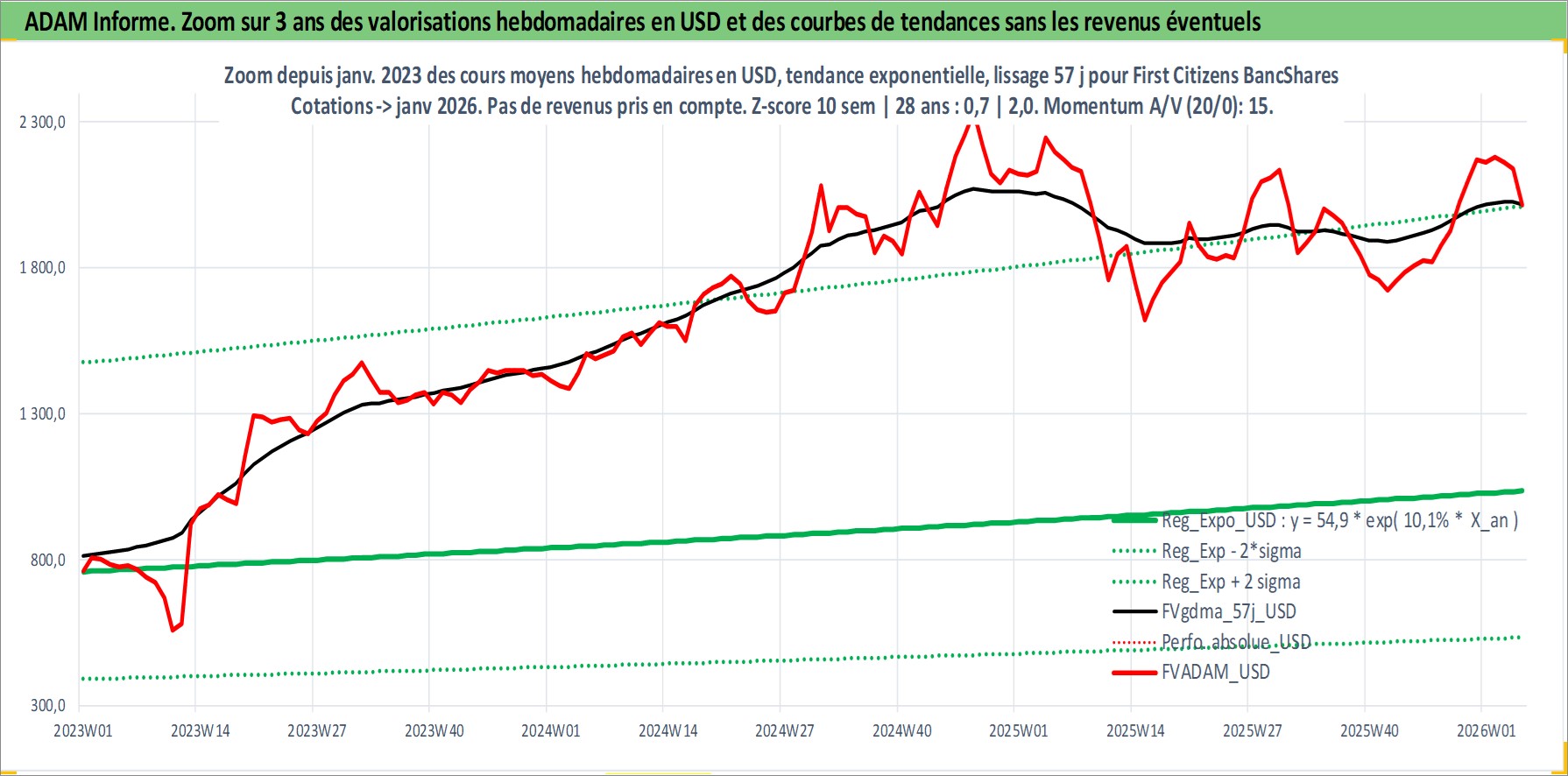 Site dédié aux investisseursPage dédiée sur site financeAnalyse des valorisations hebdomadaires de l'action First Citizens BancShares Inc Class A. Cet actif est cote en USD. Les valorisations sont en contrevaleur EURO et couvrent les semaines 1997W01 a 2026W05. Les revenus de cet actif financier sont pris en compte depuis la semaine 1997W11. La note ESG de cet actif n'est pas connue.