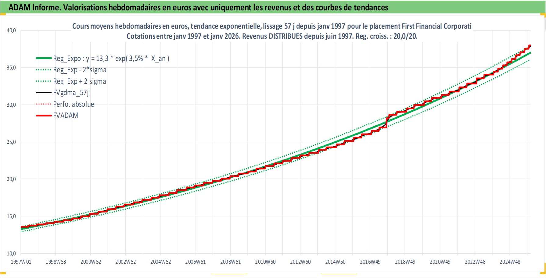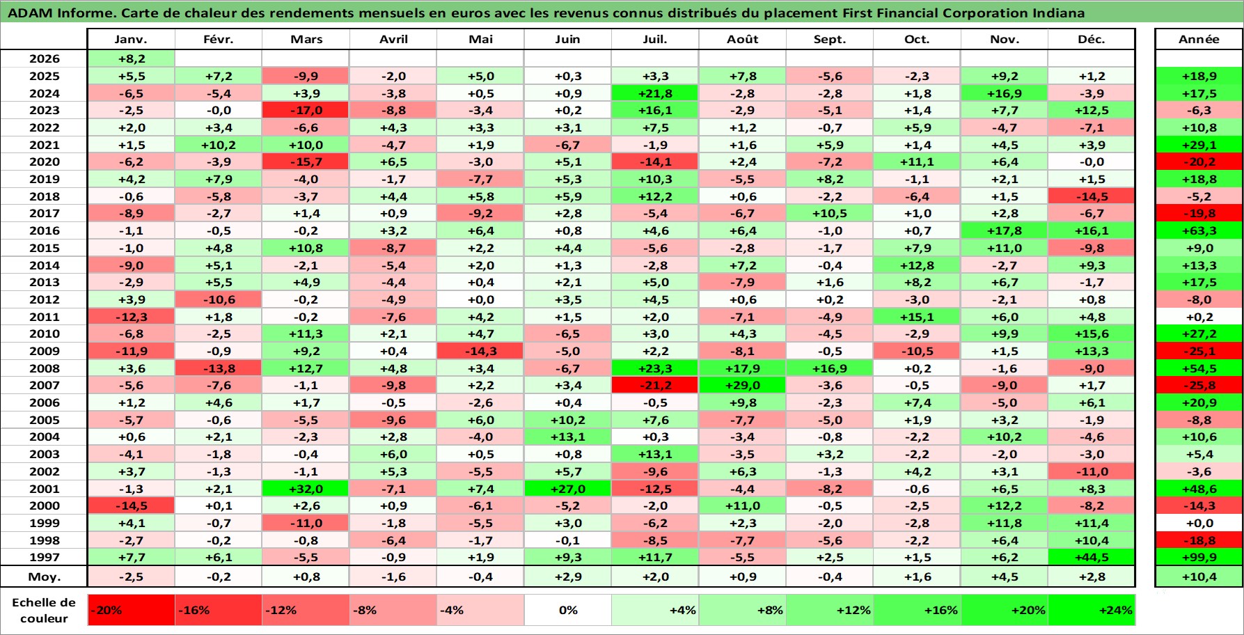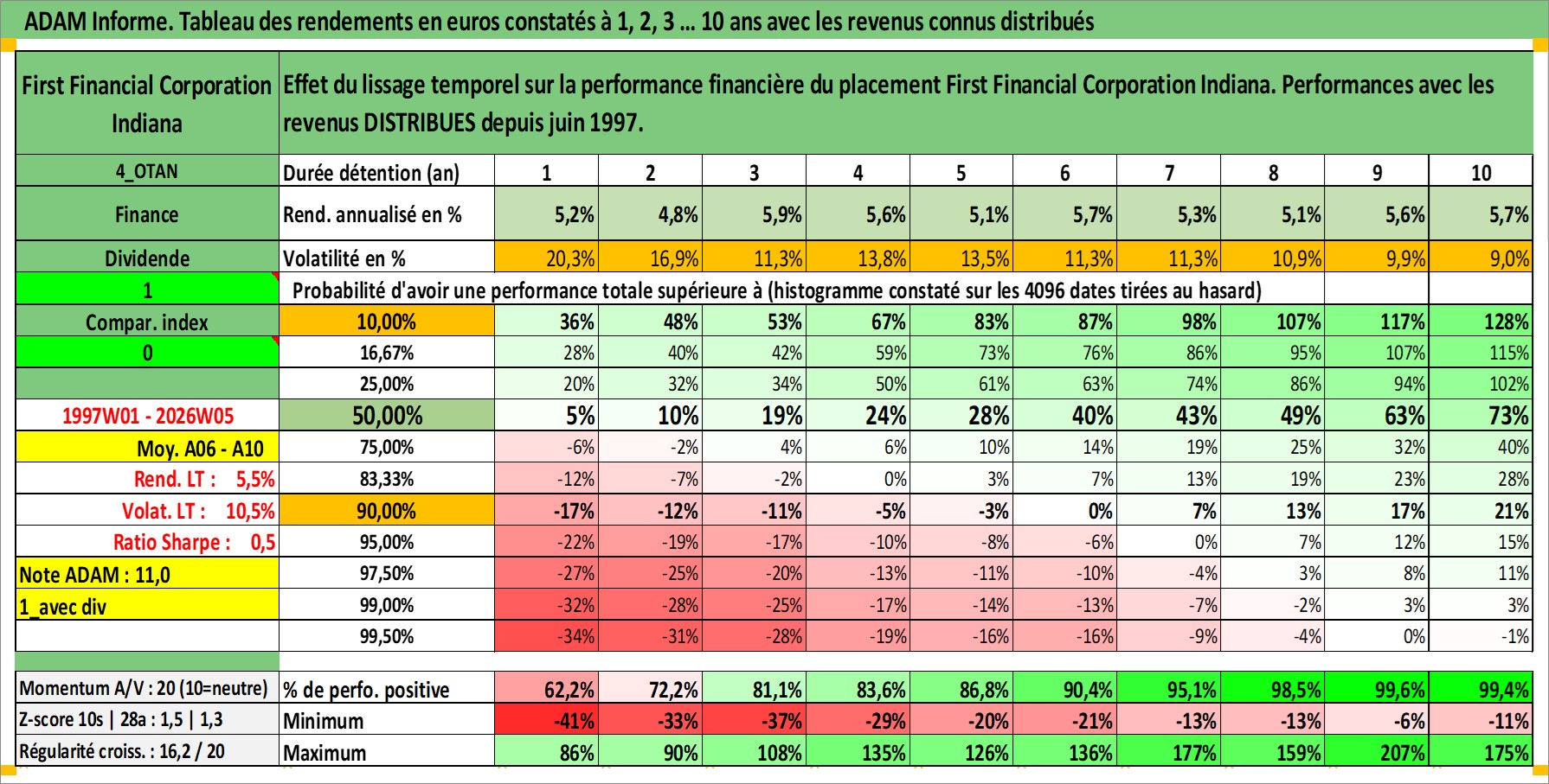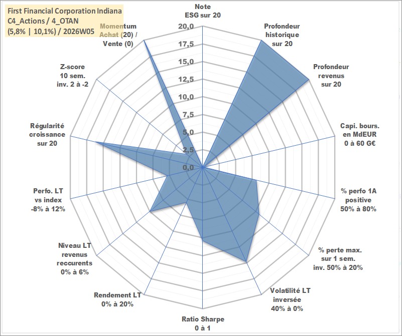 Site dédié aux investisseursPage dédiée sur site financeAnalyse des valorisations hebdomadaires de l'action First Financial Corporation Indiana. Cet actif est cote en USD. Les valorisations sont en contrevaleur EURO et couvrent les semaines 1997W01 a 2026W05. Les revenus de cet actif financier sont pris en compte depuis la semaine 1997W24. La note ESG de cet actif n'est pas connue.