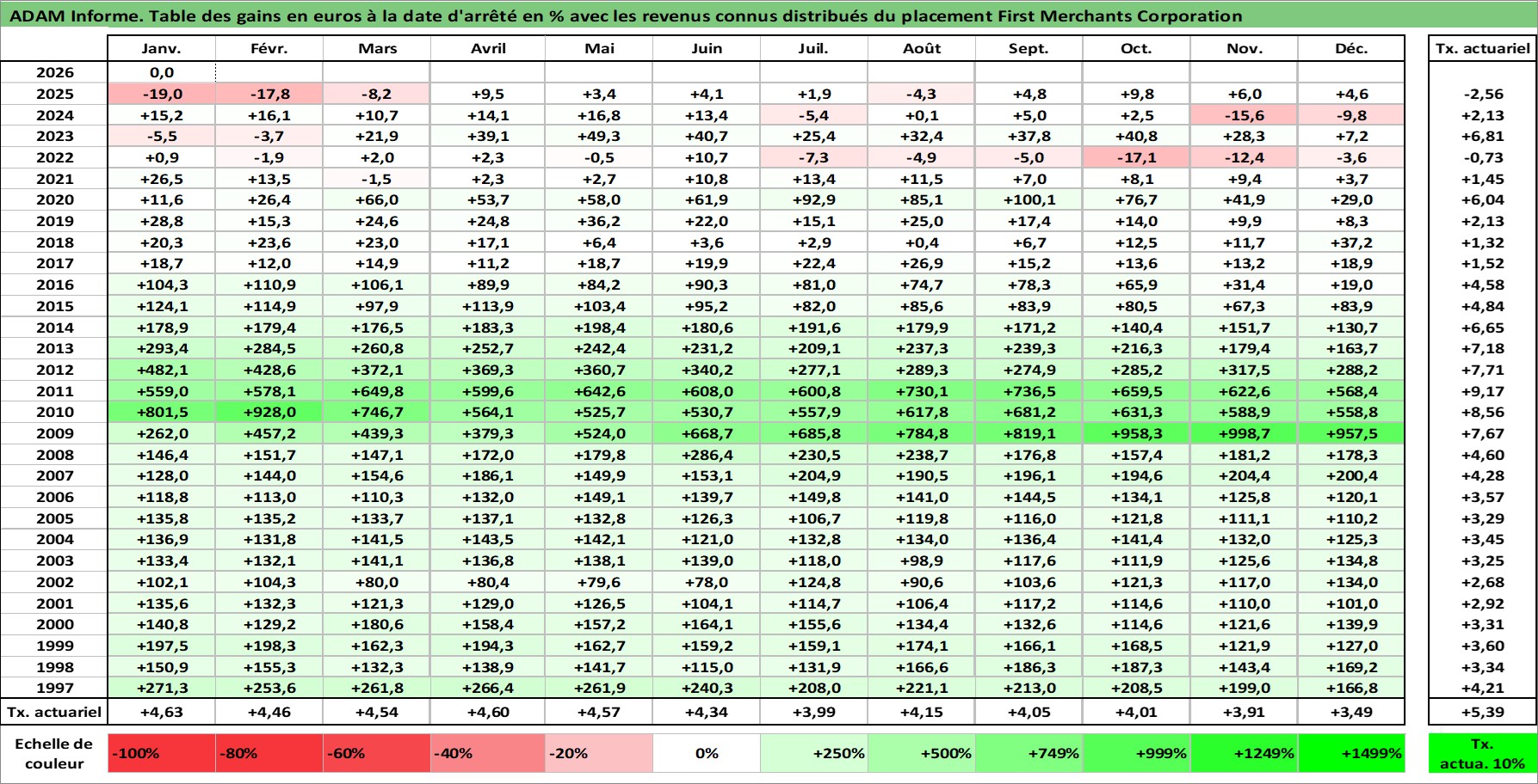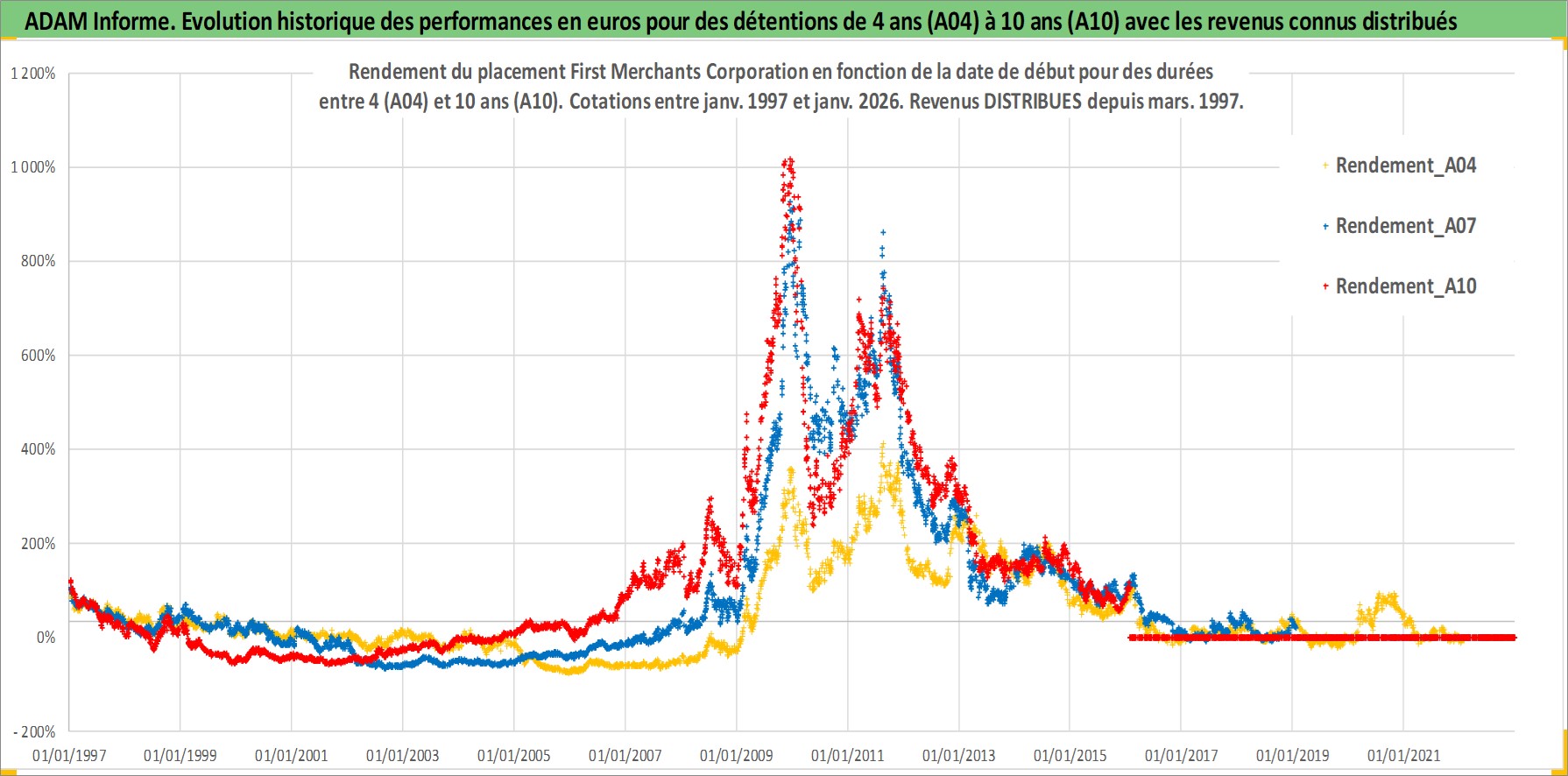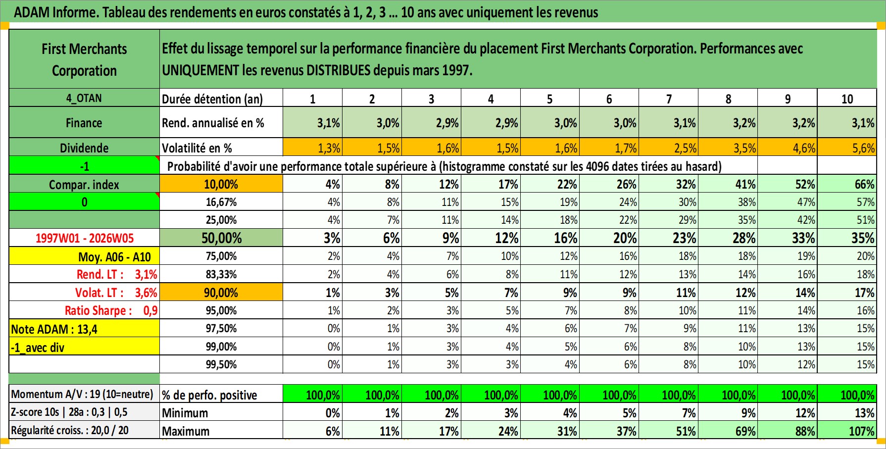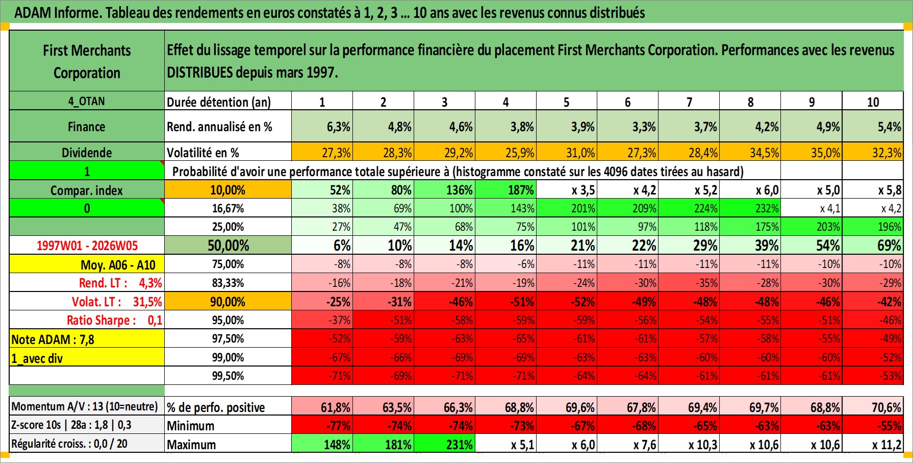 Site dédié aux investisseursPage dédiée sur site financeAnalyse des valorisations hebdomadaires de l'action First Merchants Corporation. Cet actif est cote en USD. Les valorisations sont en contrevaleur EURO et couvrent les semaines 1997W01 a 2026W05. Les revenus de cet actif financier sont pris en compte depuis la semaine 1997W10. La note ESG de cet actif n'est pas connue.