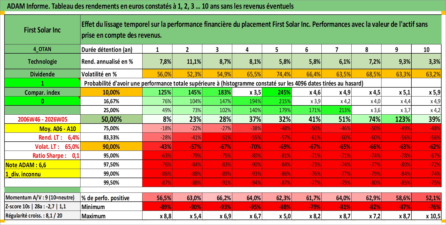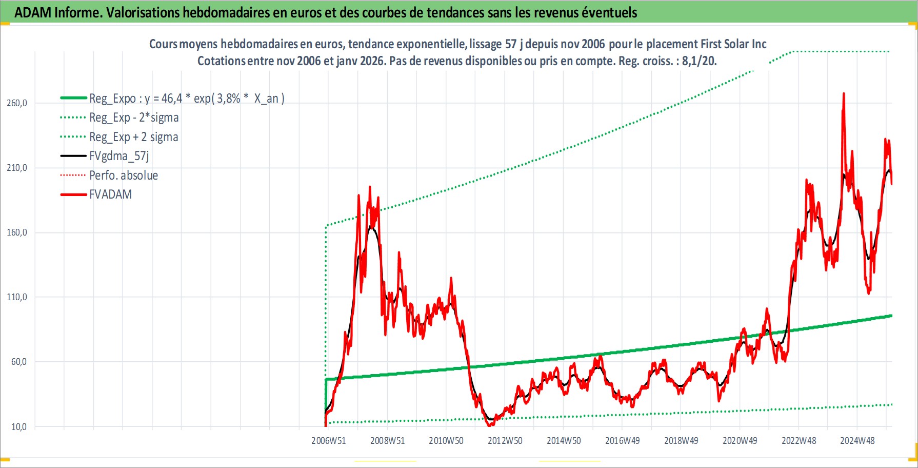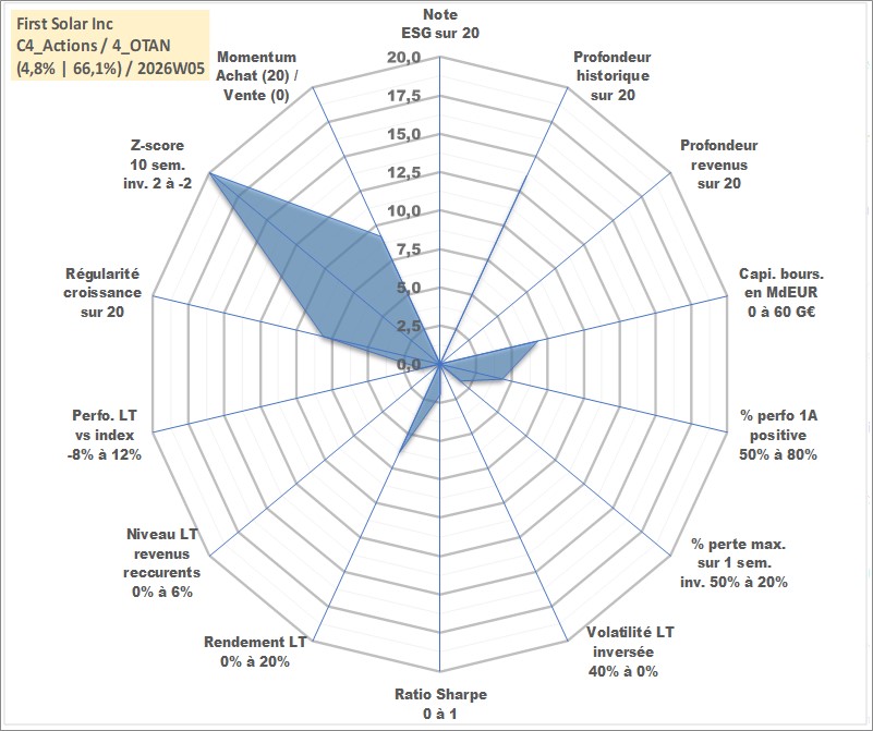 Site dédié aux investisseursPage dédiée sur site financeAnalyse des valorisations hebdomadaires de l'action First Solar Inc. Cet actif est cote en USD. Les valorisations sont en contrevaleur EURO et couvrent les semaines 2006W46 a 2026W05. Les revenus de cet actif financier ne sont pas connus car non existants ou non disponibles sur le site Yahoo Finance. La note ESG de cet actif n'est pas connue.