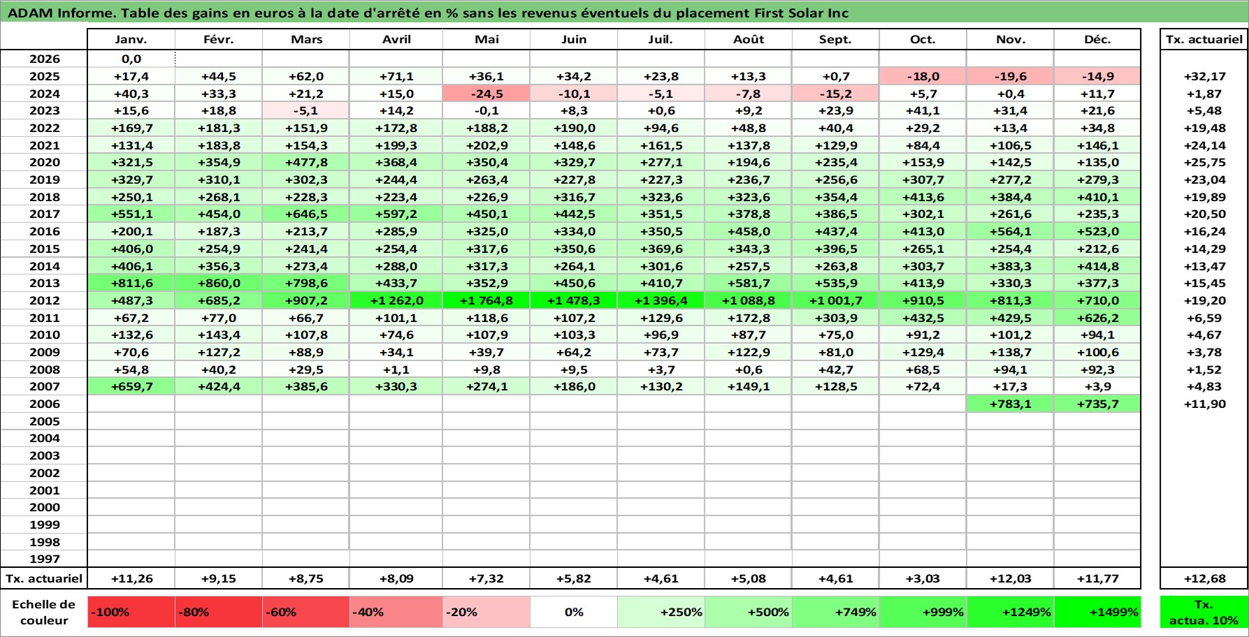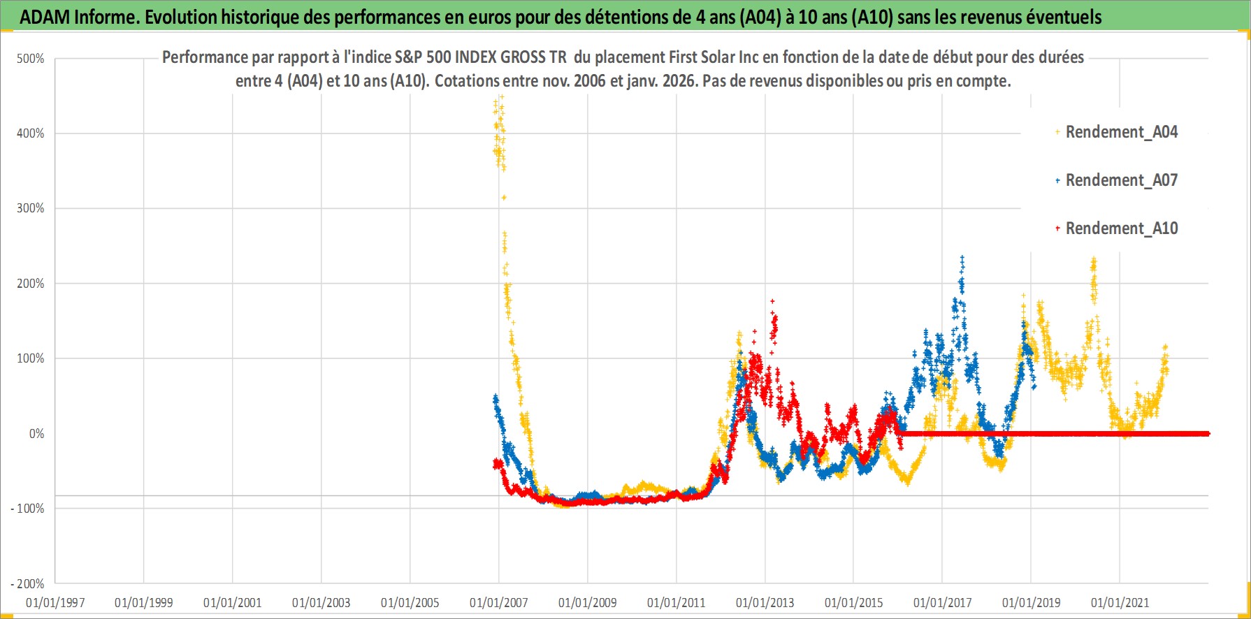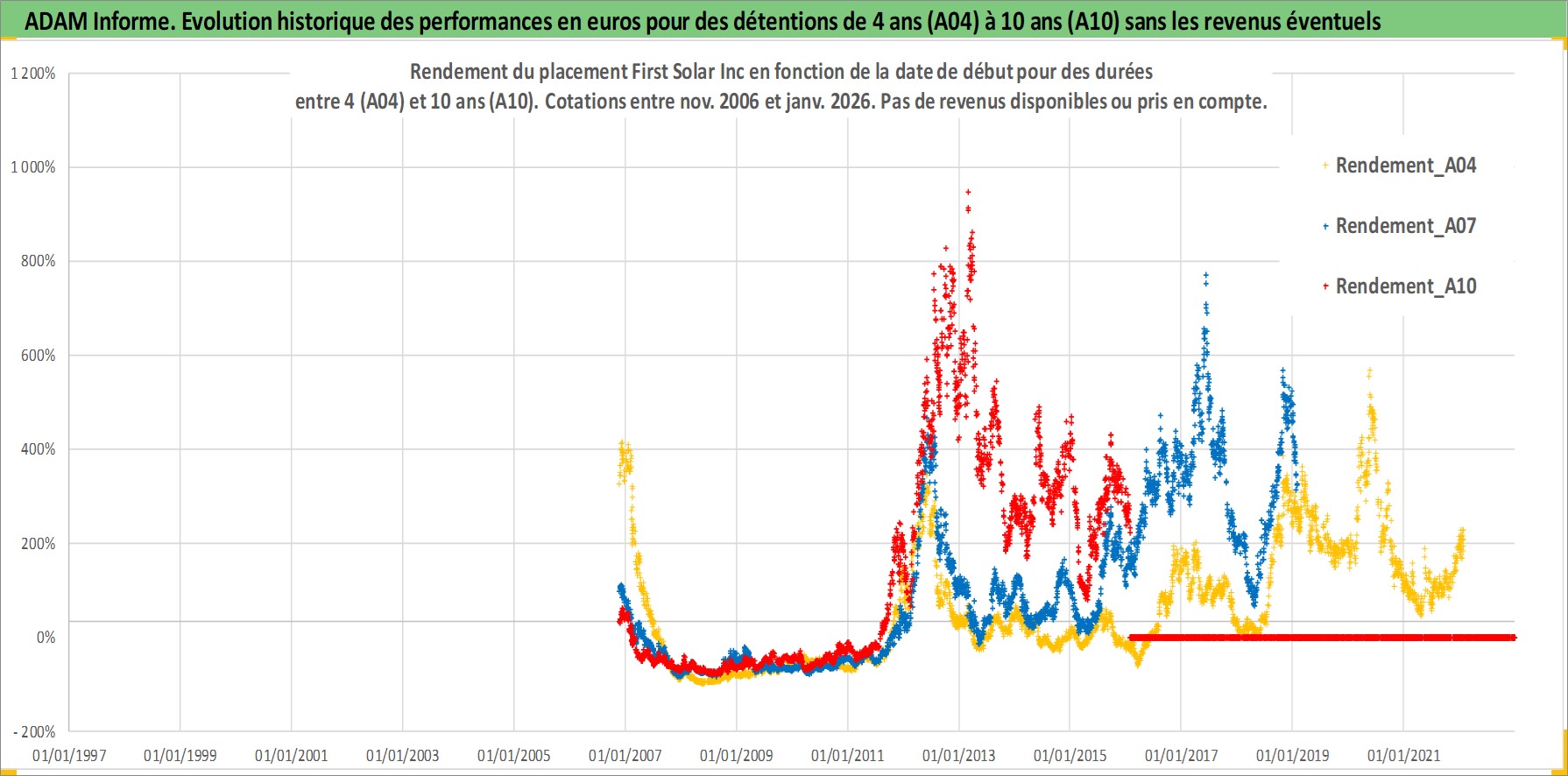 Site dédié aux investisseursPage dédiée sur site financeAnalyse des valorisations hebdomadaires de l'action First Solar Inc. Cet actif est cote en USD. Les valorisations sont en contrevaleur EURO et couvrent les semaines 2006W46 a 2026W05. Les revenus de cet actif financier ne sont pas connus car non existants ou non disponibles sur le site Yahoo Finance. La note ESG de cet actif n'est pas connue.