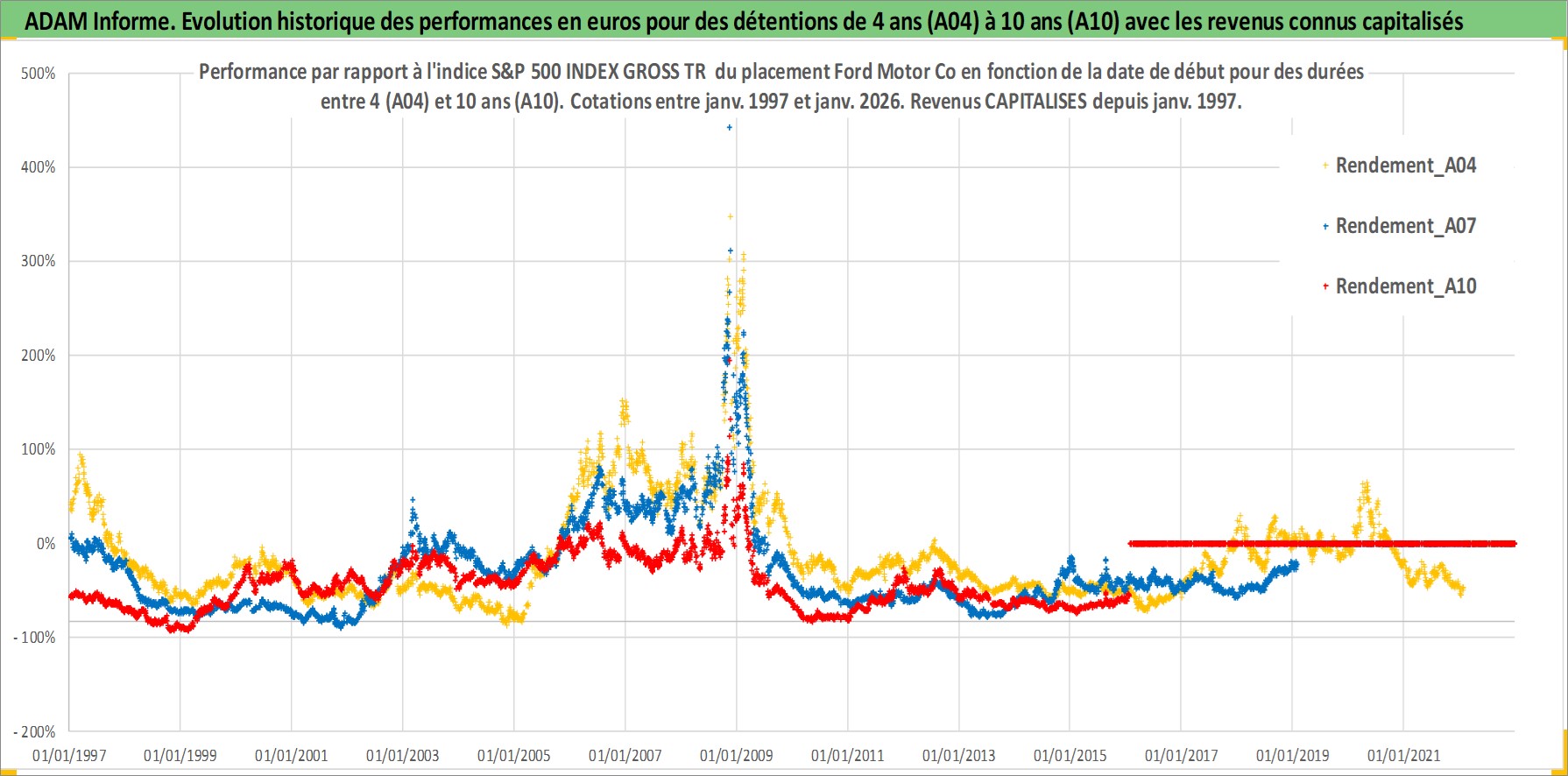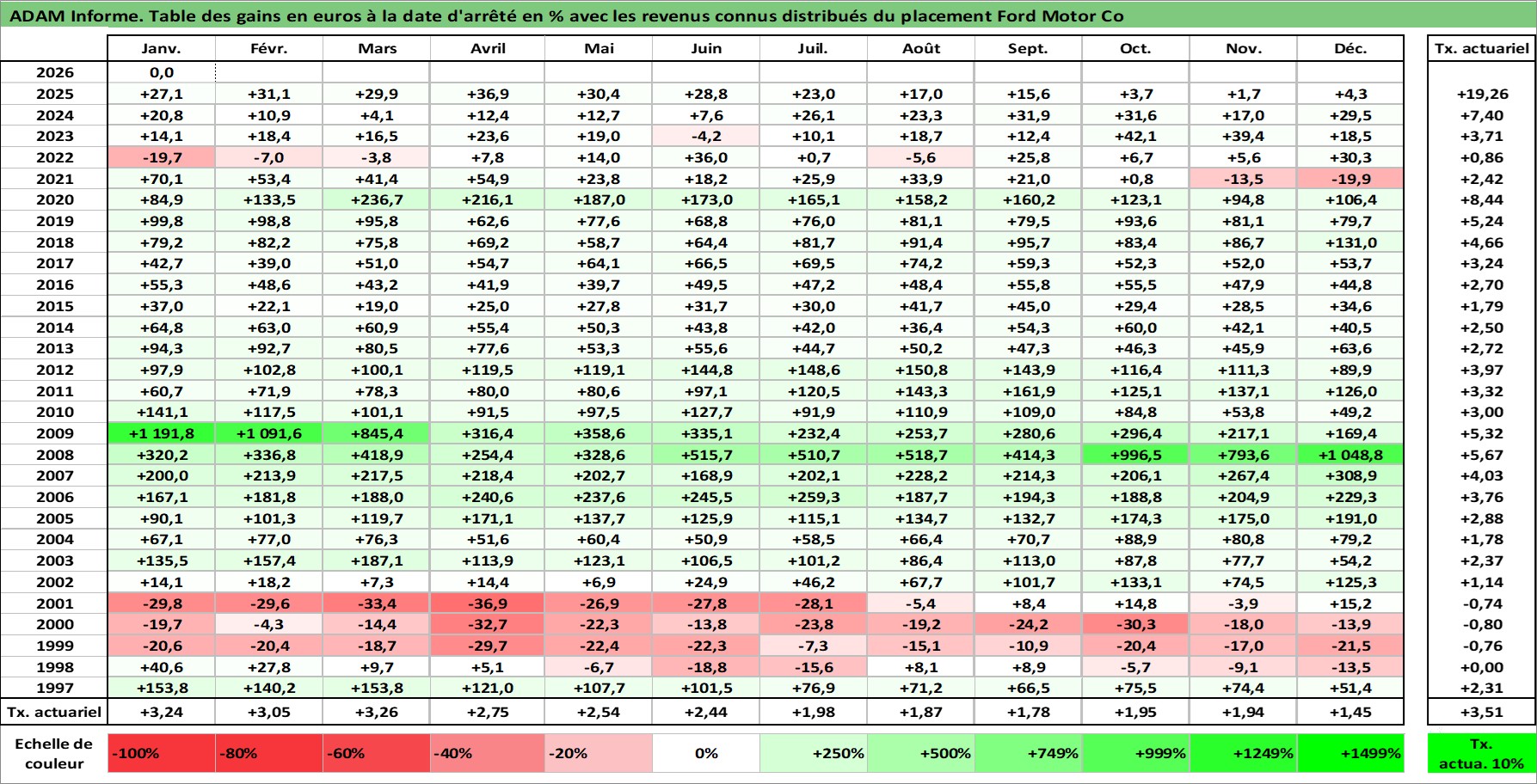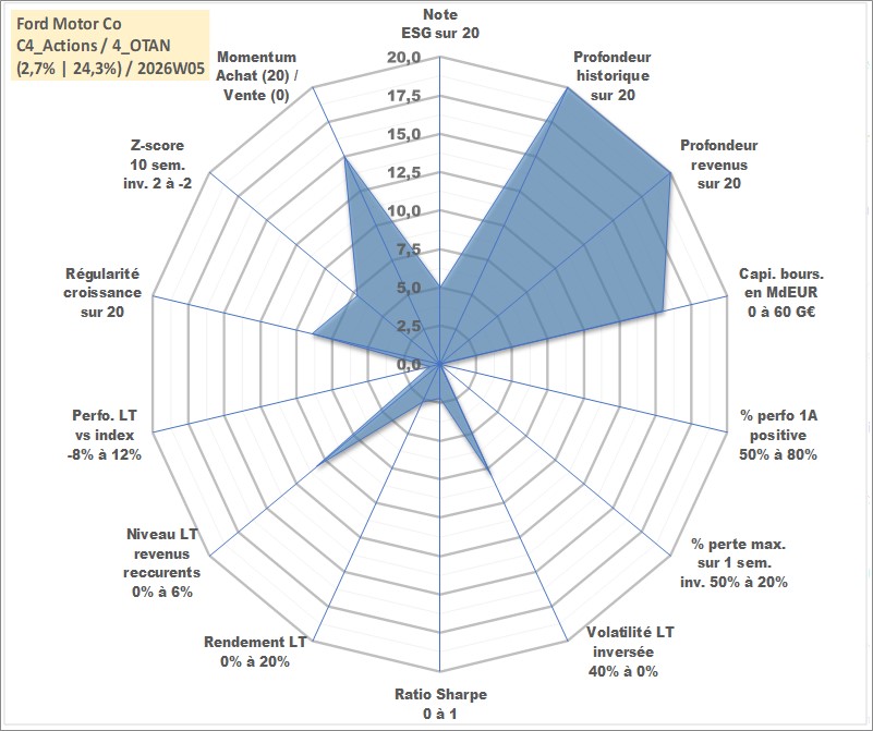 Site dédié aux investisseursPage dédiée sur site financeAnalyse des valorisations hebdomadaires de l'action Ford Motor Co. Cet actif est cote en USD. Les valorisations sont en contrevaleur EURO et couvrent les semaines 1997W01 a 2026W05. Les revenus de cet actif financier sont pris en compte depuis la semaine 1997W05. La note globale ESG de cet actif est estimee a 5.0 (apres rebasage entre 0 et 20).