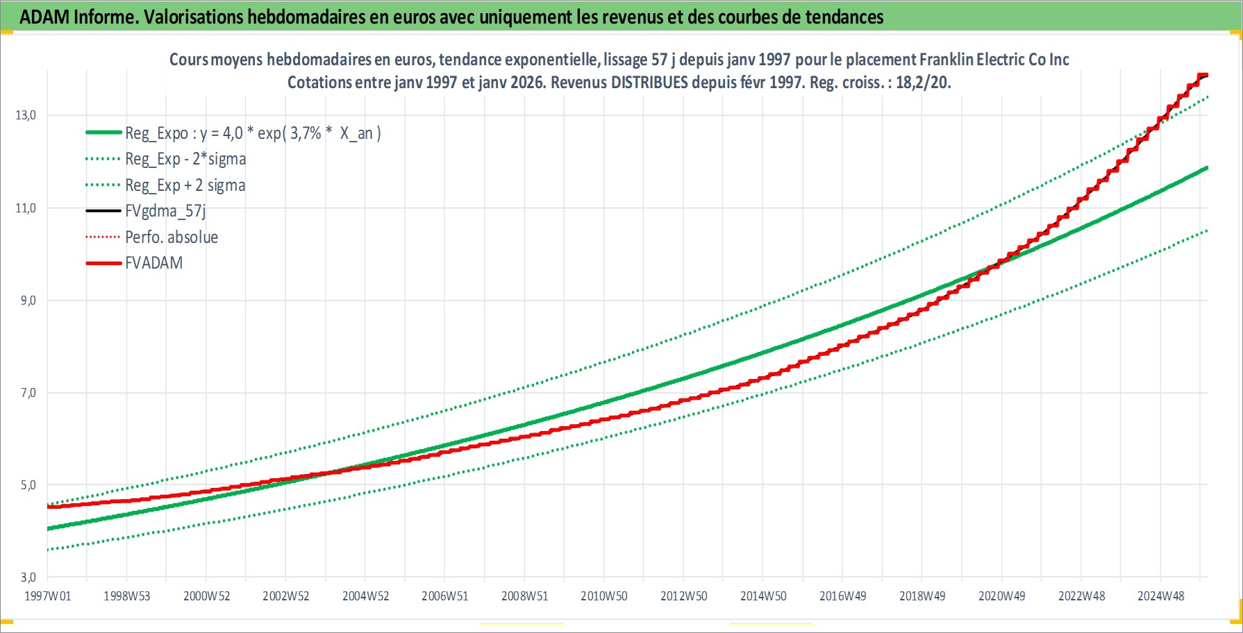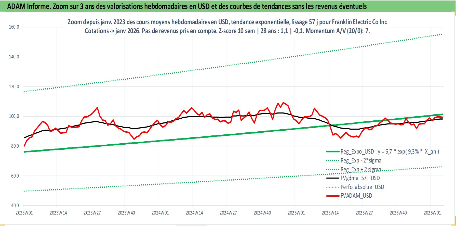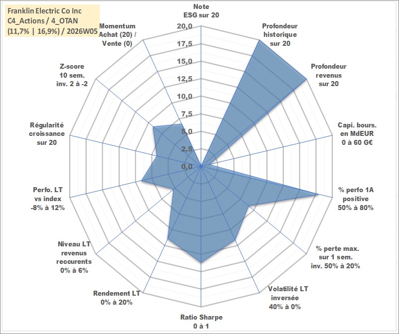 Site dédié aux investisseursPage dédiée sur site financeAnalyse des valorisations hebdomadaires de l'action Franklin Electric Co Inc. Cet actif est cote en USD. Les valorisations sont en contrevaleur EURO et couvrent les semaines 1997W01 a 2026W05. Les revenus de cet actif financier sont pris en compte depuis la semaine 1997W07. La note ESG de cet actif n'est pas connue.