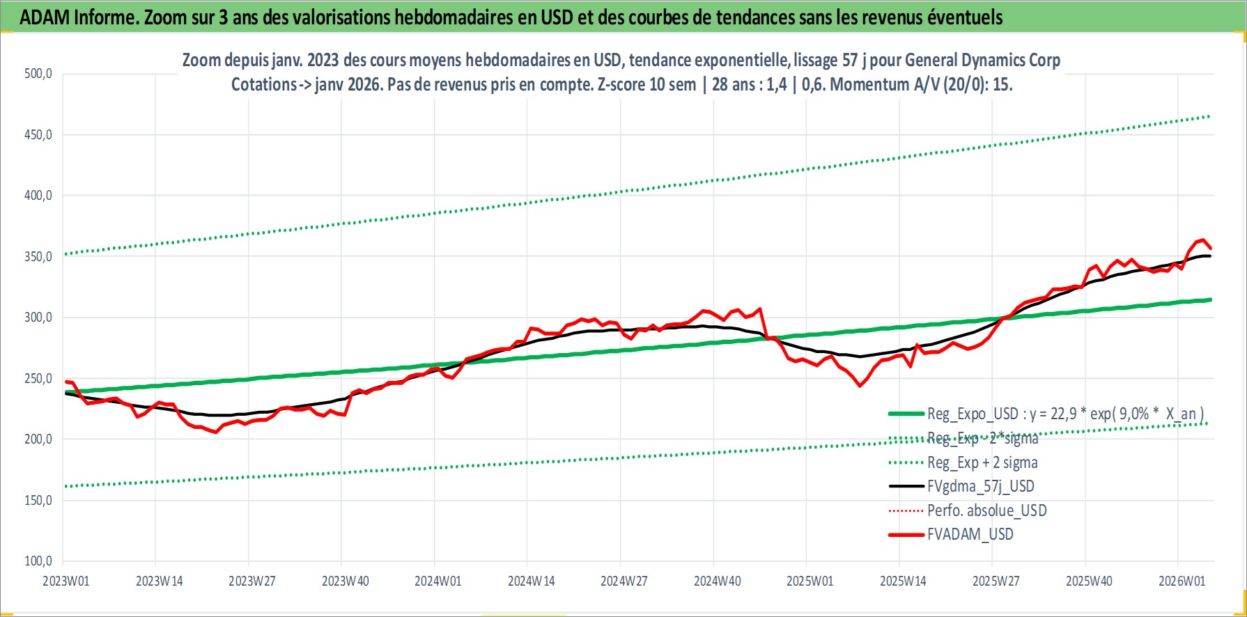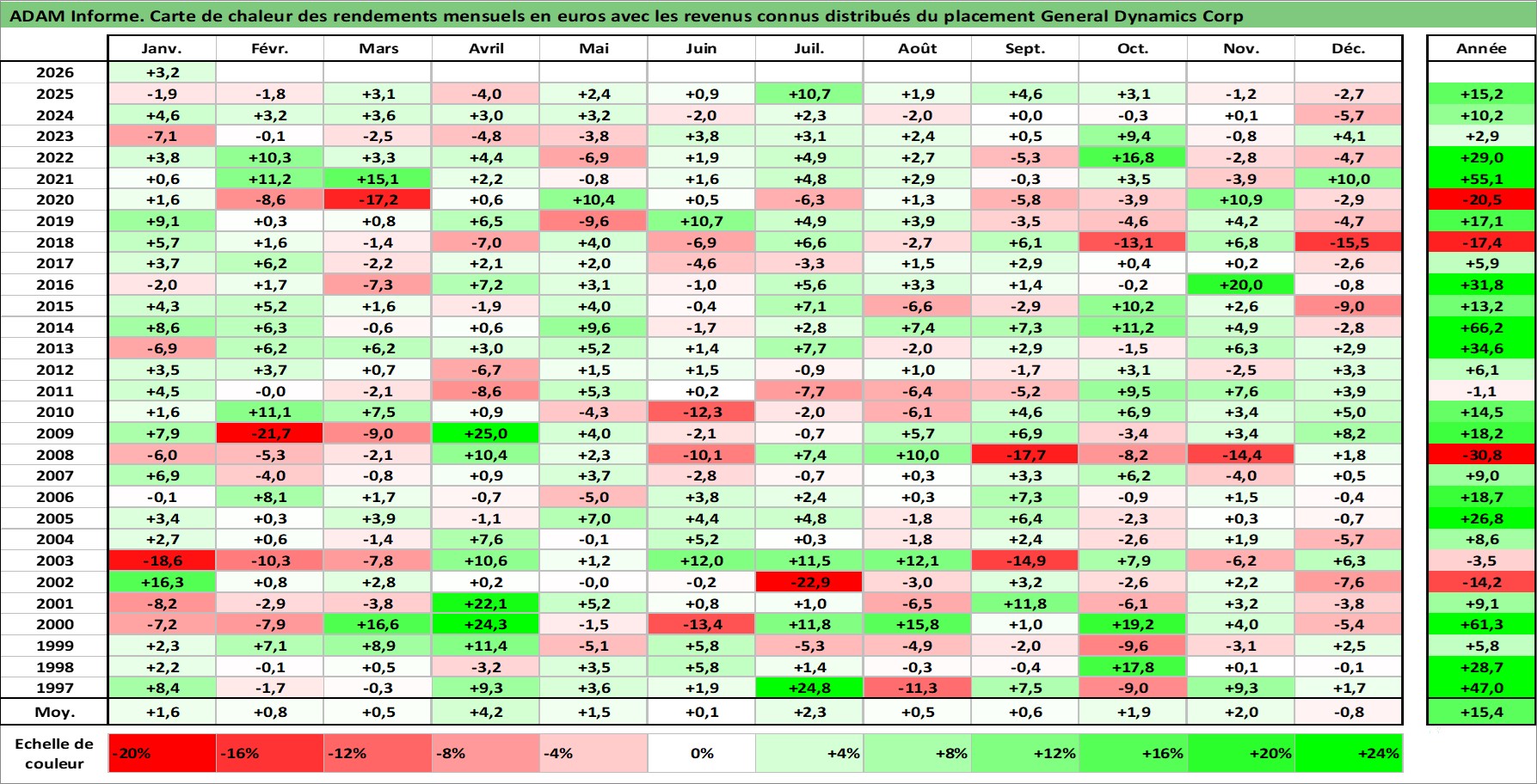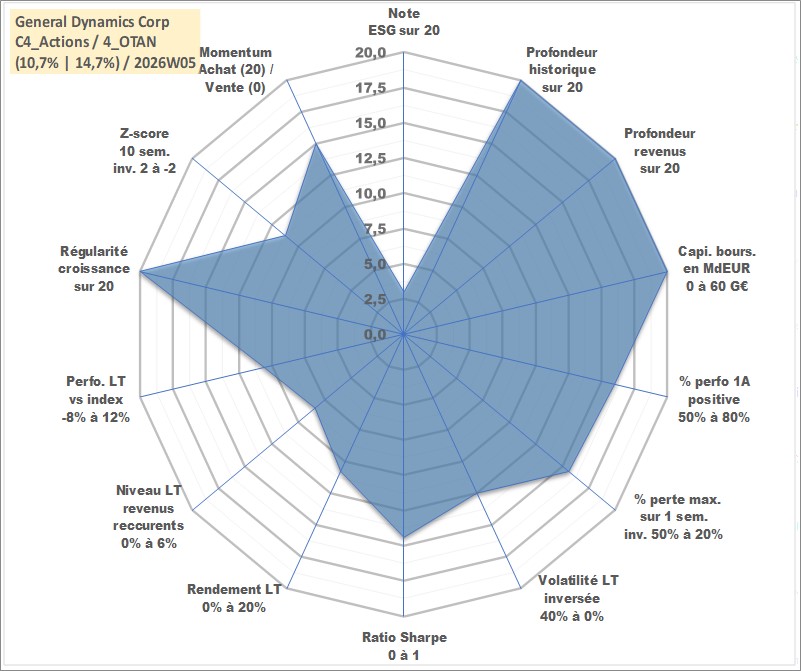 Site dédié aux investisseursPage dédiée sur site financeAnalyse des valorisations hebdomadaires de l'action General Dynamics Corp. Cet actif est cote en USD. Les valorisations sont en contrevaleur EURO et couvrent les semaines 1997W01 a 2026W05. Les revenus de cet actif financier sont pris en compte depuis la semaine 1997W04. La note globale ESG de cet actif est estimee a 3.0 (apres rebasage entre 0 et 20).