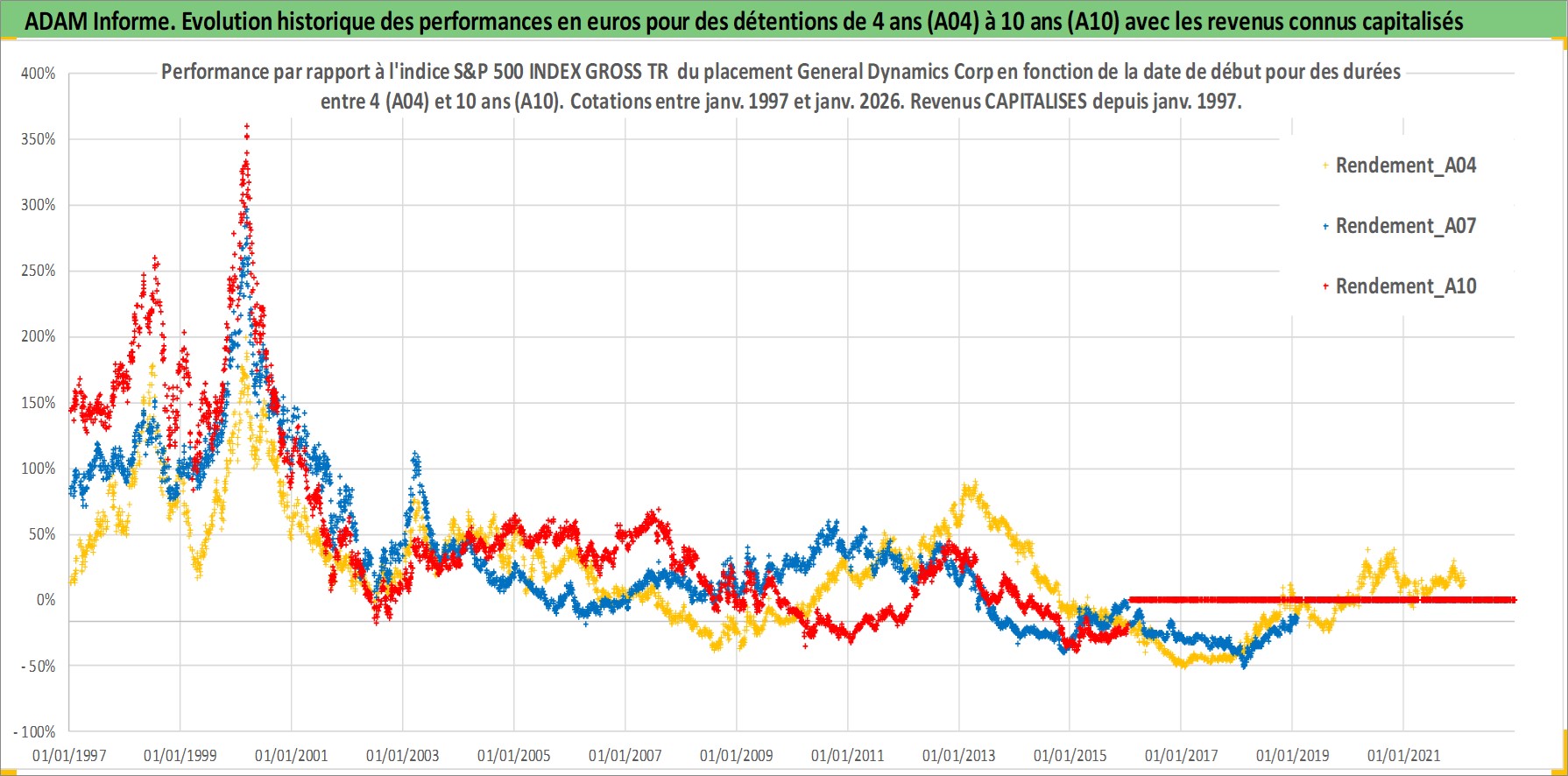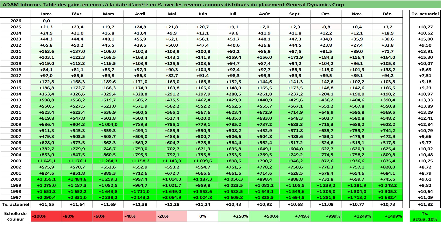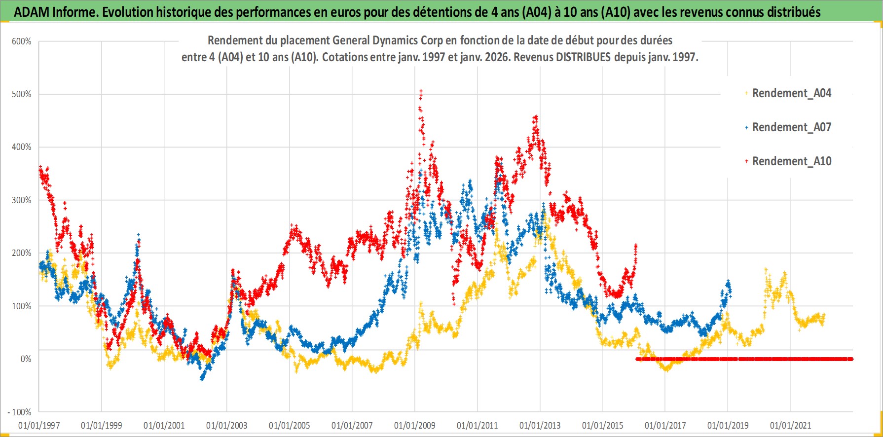 Site dédié aux investisseursPage dédiée sur site financeAnalyse des valorisations hebdomadaires de l'action General Dynamics Corp. Cet actif est cote en USD. Les valorisations sont en contrevaleur EURO et couvrent les semaines 1997W01 a 2026W05. Les revenus de cet actif financier sont pris en compte depuis la semaine 1997W04. La note globale ESG de cet actif est estimee a 3.0 (apres rebasage entre 0 et 20).