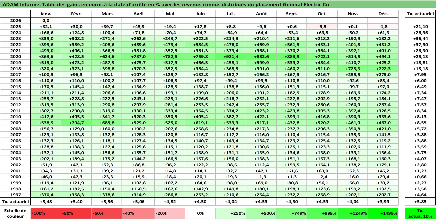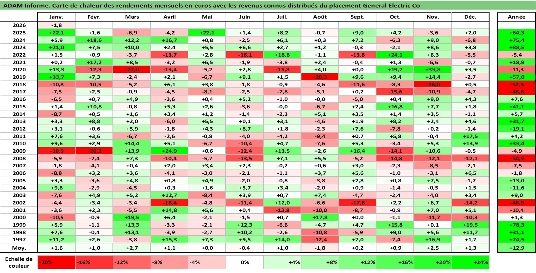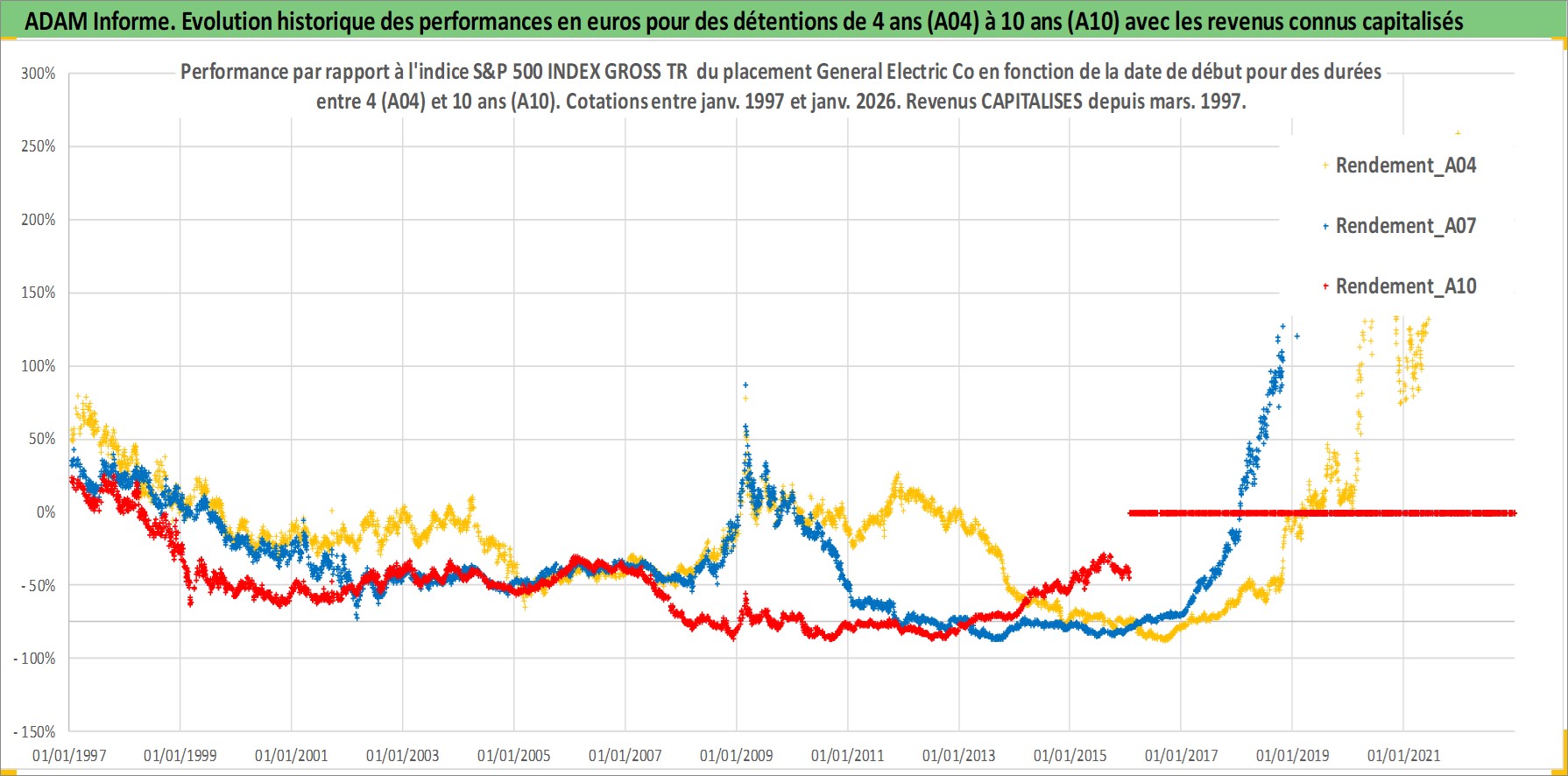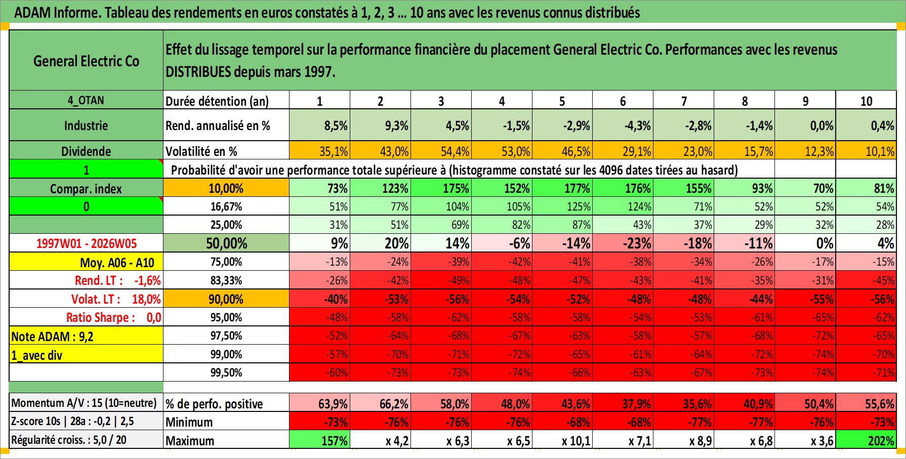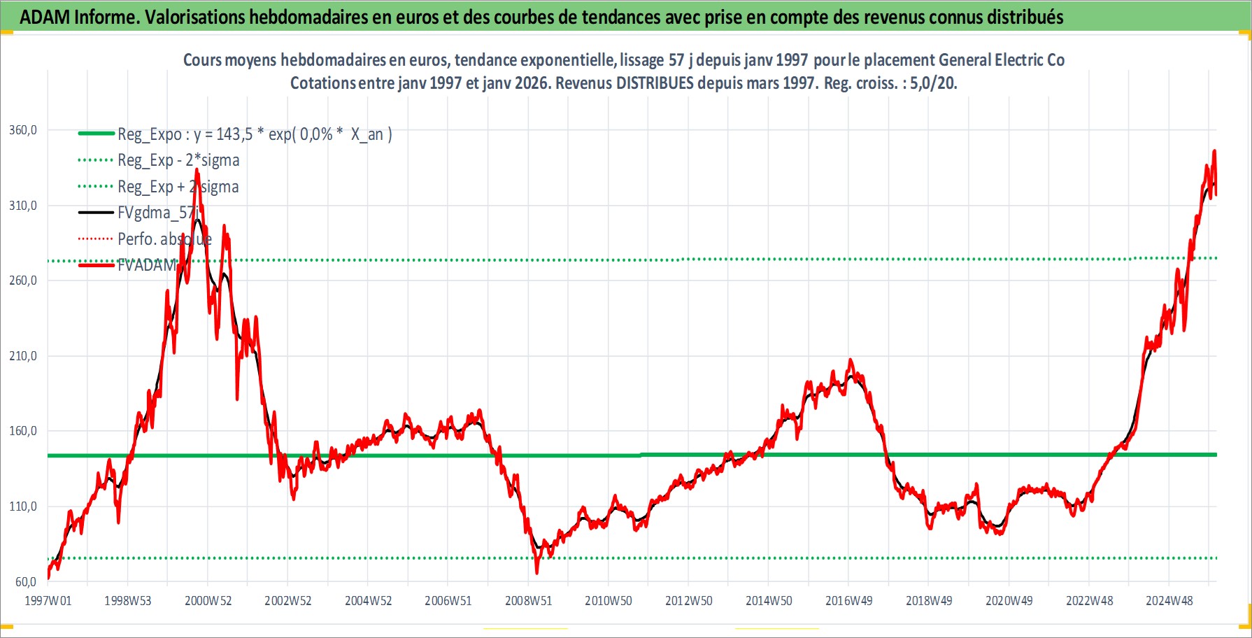 Site dédié aux investisseursPage dédiée sur site financeAnalyse des valorisations hebdomadaires de l'action General Electric Co. Cet actif est cote en USD. Les valorisations sont en contrevaleur EURO et couvrent les semaines 1997W01 a 2026W05. Les revenus de cet actif financier sont pris en compte depuis la semaine 1997W10. La note globale ESG de cet actif est estimee a 2.0 (apres rebasage entre 0 et 20).