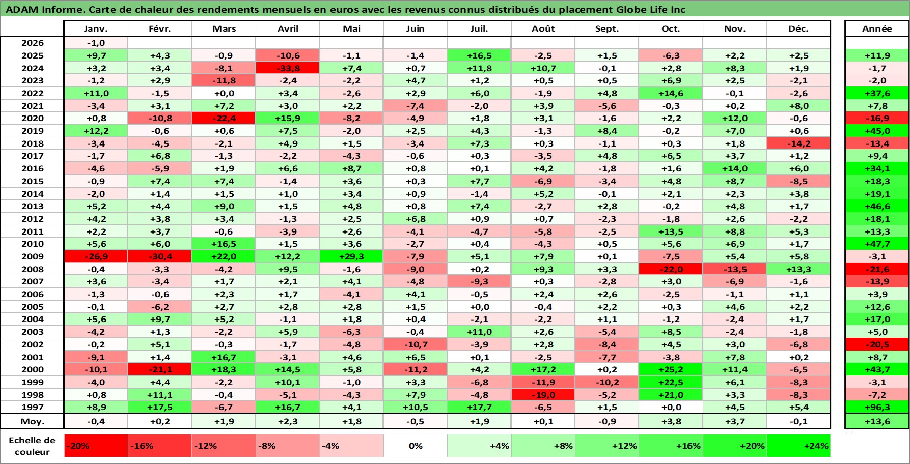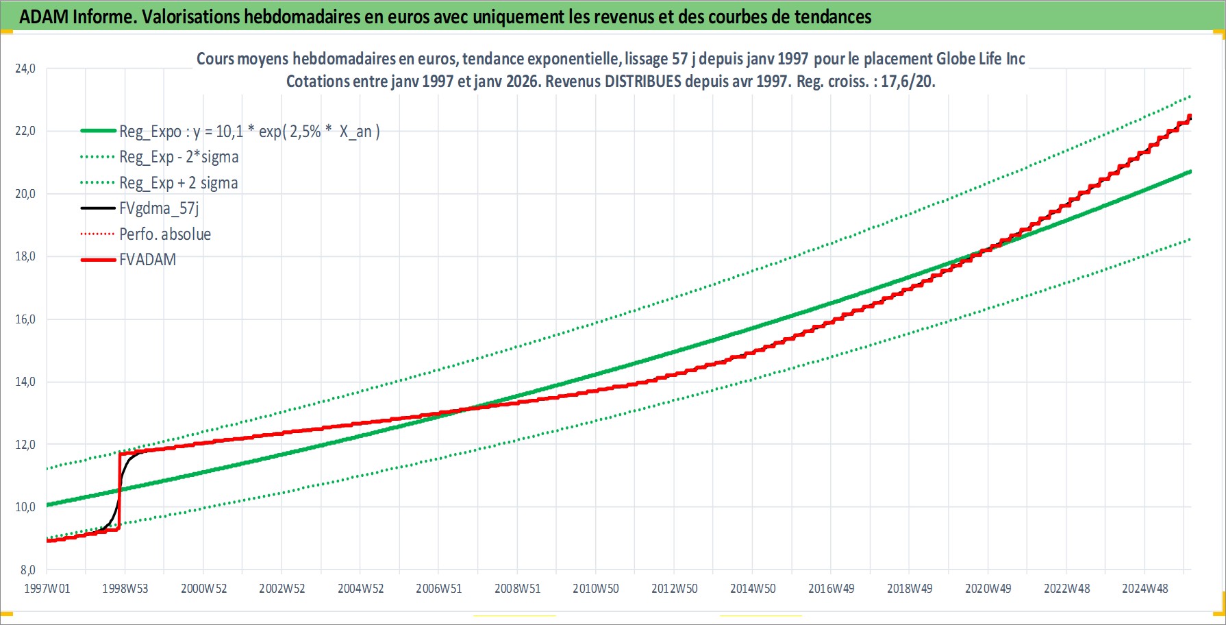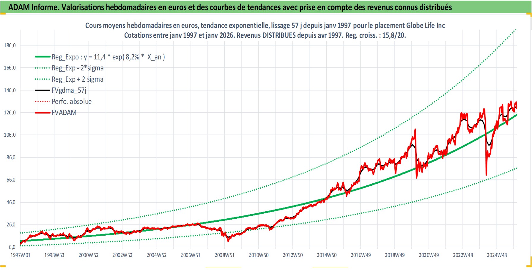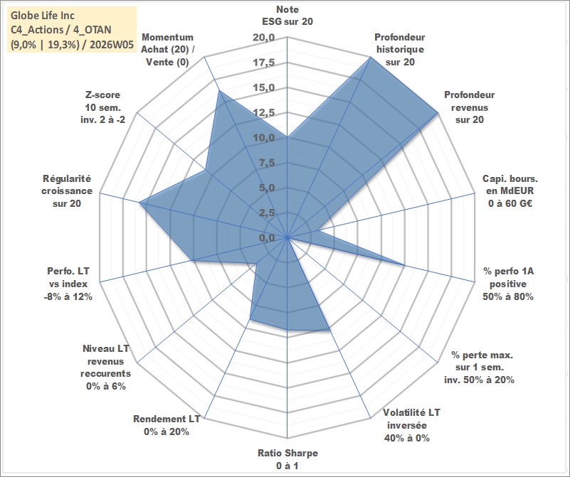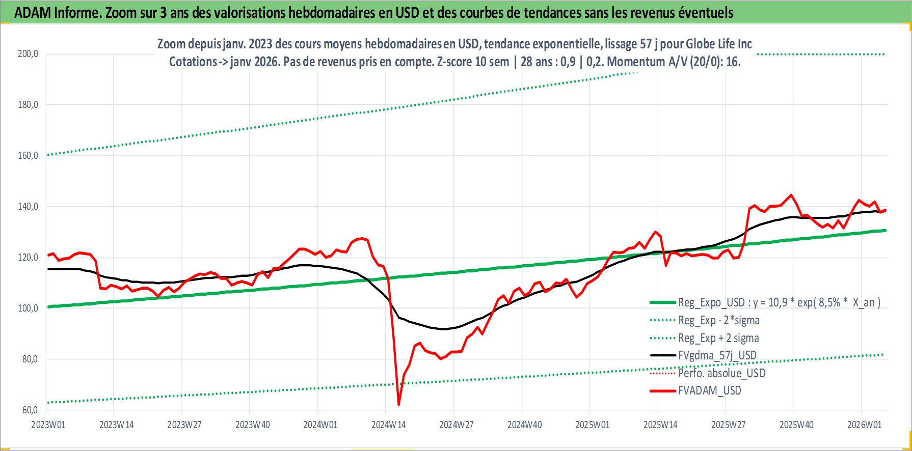 Site dédié aux investisseursPage dédiée sur site financeAnalyse des valorisations hebdomadaires de l'action Globe Life Inc. Cet actif est cote en USD. Les valorisations sont en contrevaleur EURO et couvrent les semaines 1997W01 a 2026W05. Les revenus de cet actif financier sont pris en compte depuis la semaine 1997W14. La note globale ESG de cet actif est estimee a 10.0 (apres rebasage entre 0 et 20).