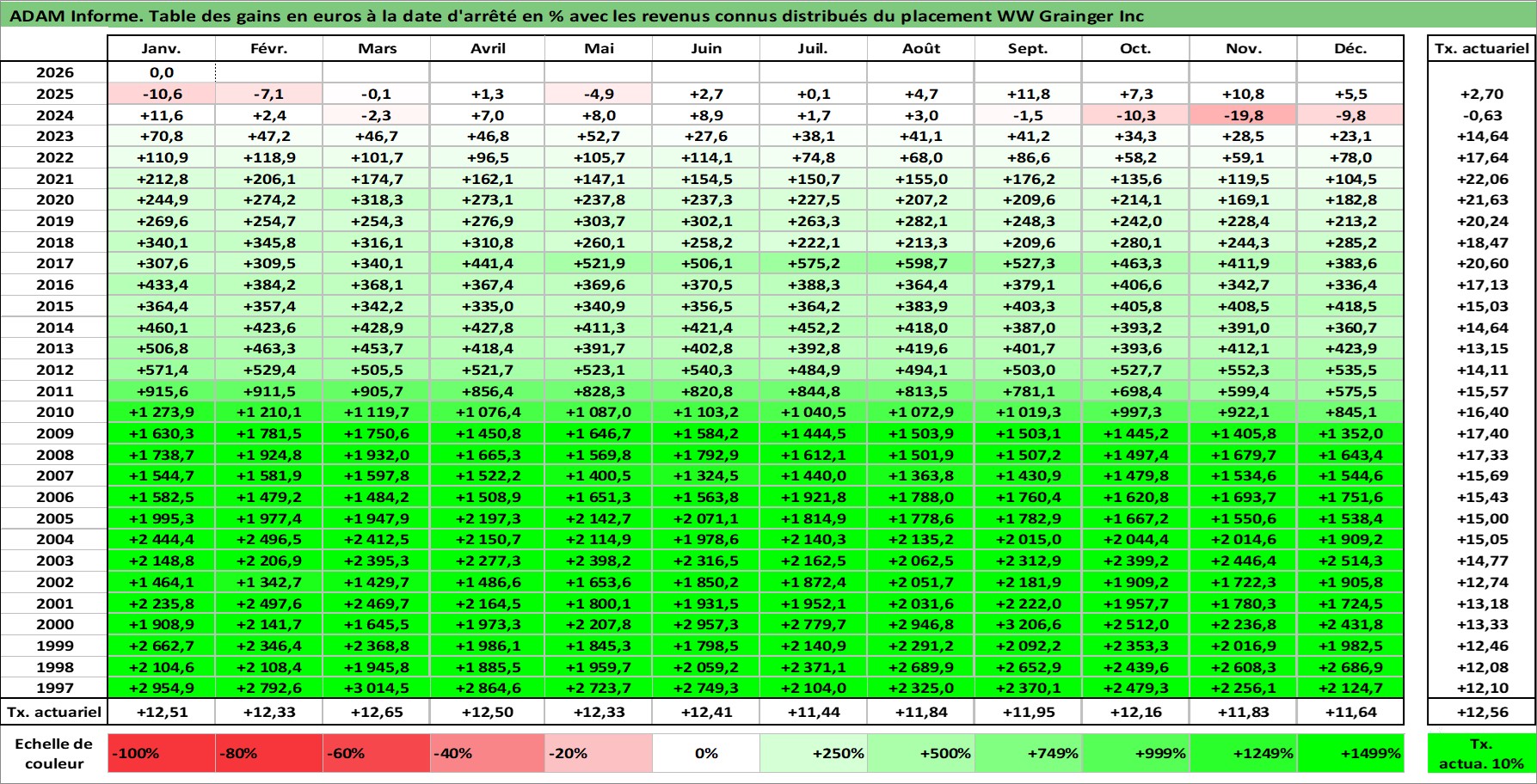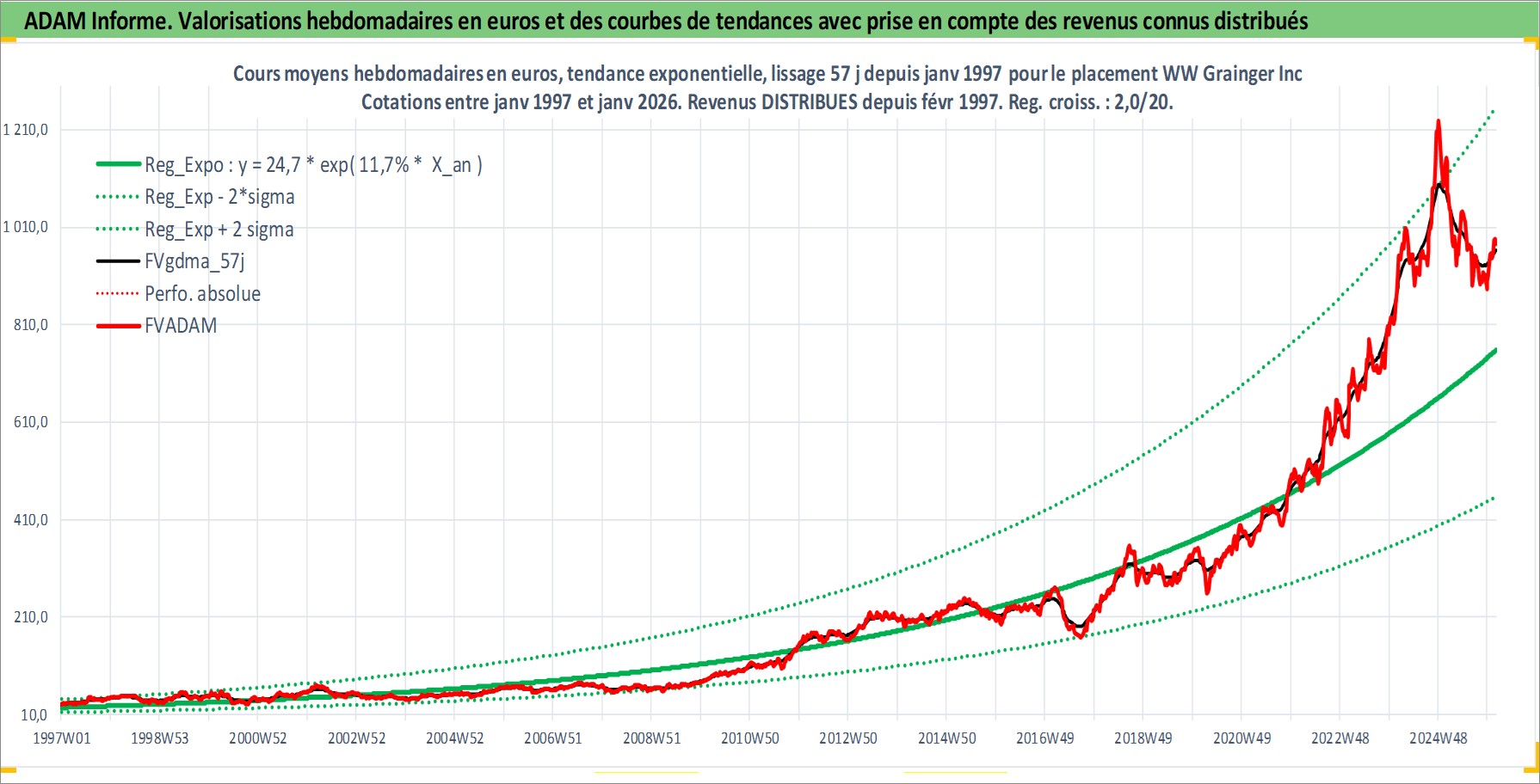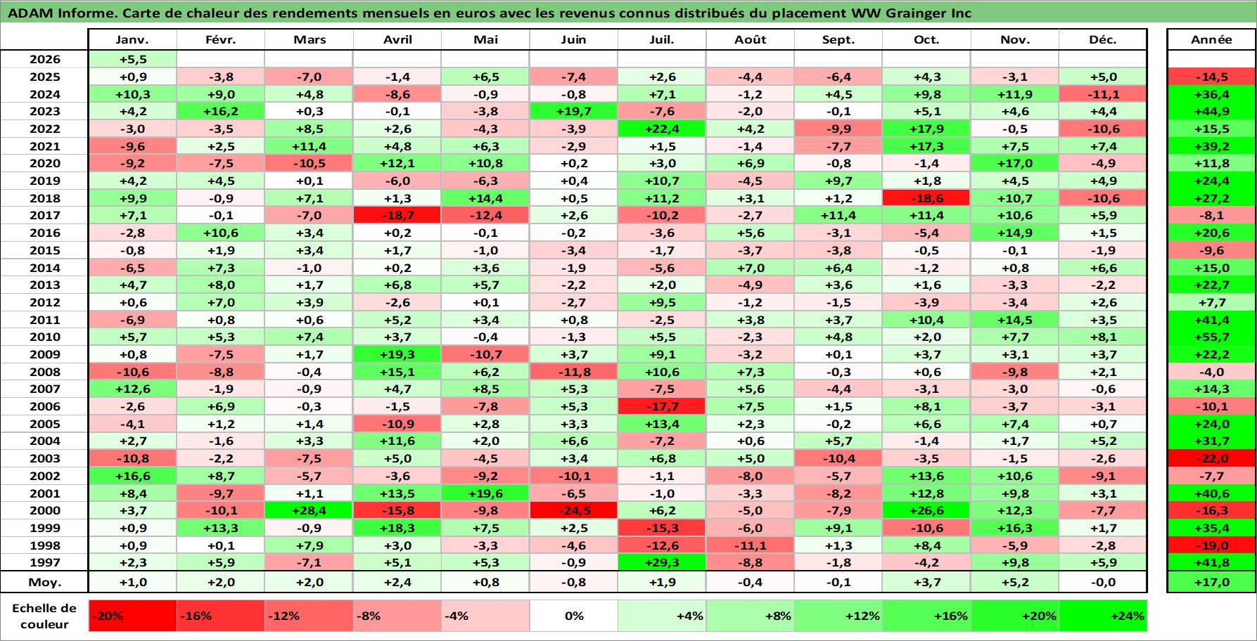 Site dédié aux investisseursPage dédiée sur site financeAnalyse des valorisations hebdomadaires de l'action WW Grainger Inc. Cet actif est cote en USD. Les valorisations sont en contrevaleur EURO et couvrent les semaines 1997W01 a 2026W05. Les revenus de cet actif financier sont pris en compte depuis la semaine 1997W06. La note globale ESG de cet actif est estimee a 13.0 (apres rebasage entre 0 et 20).