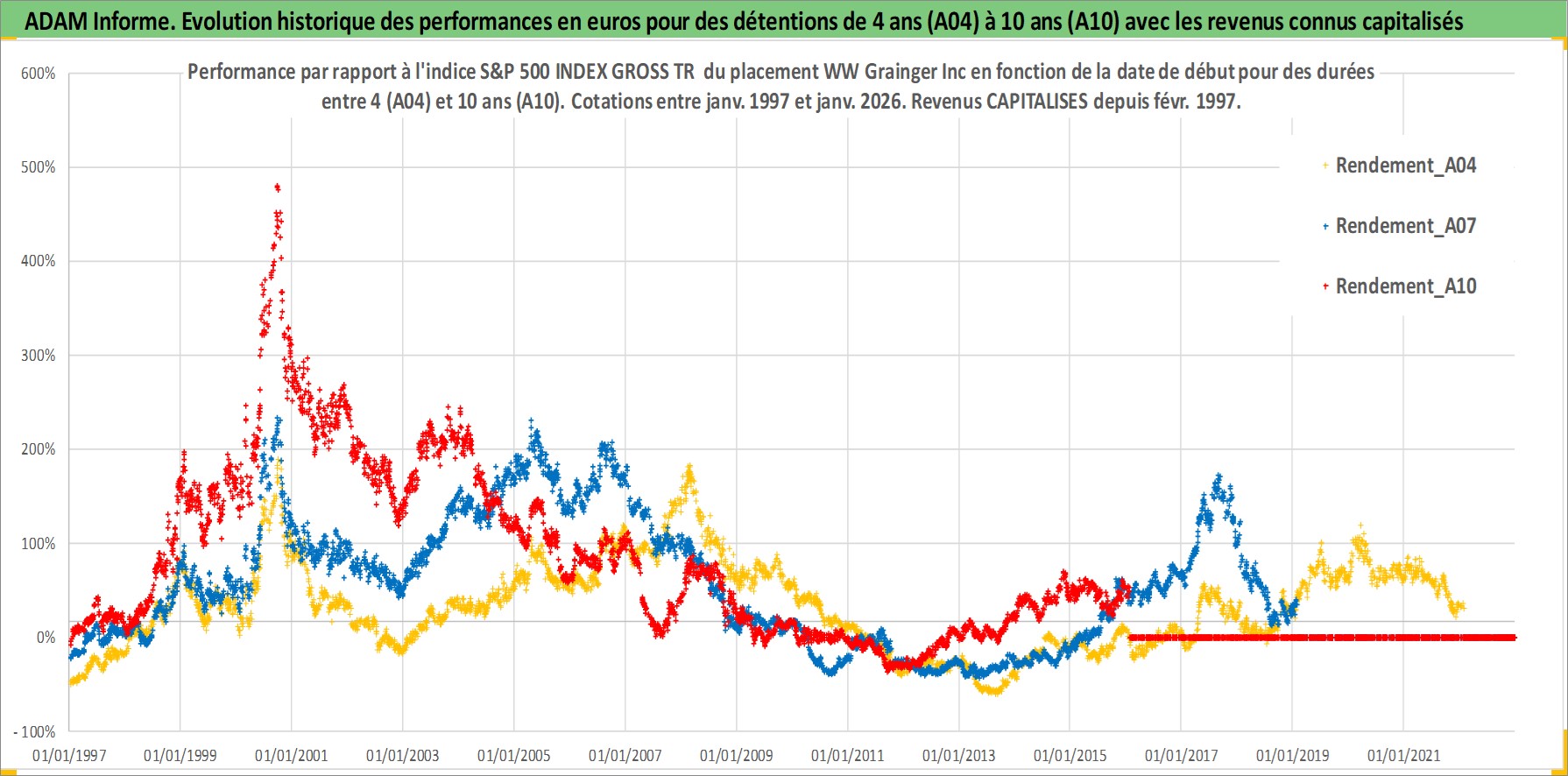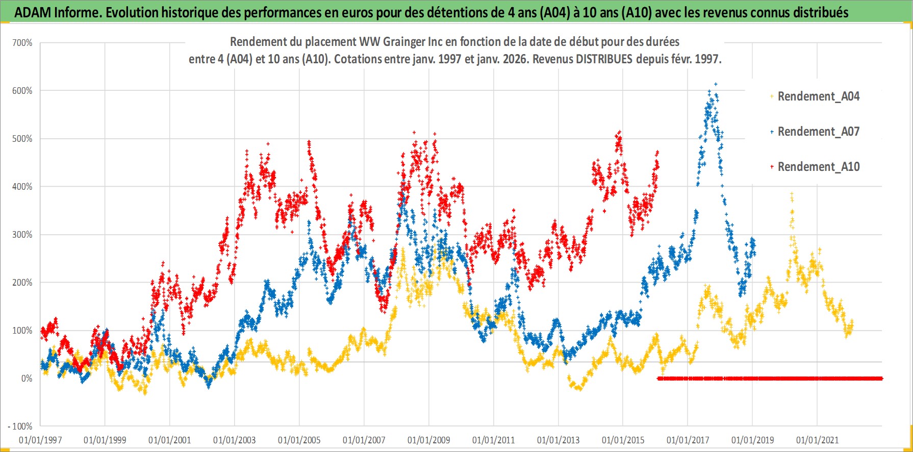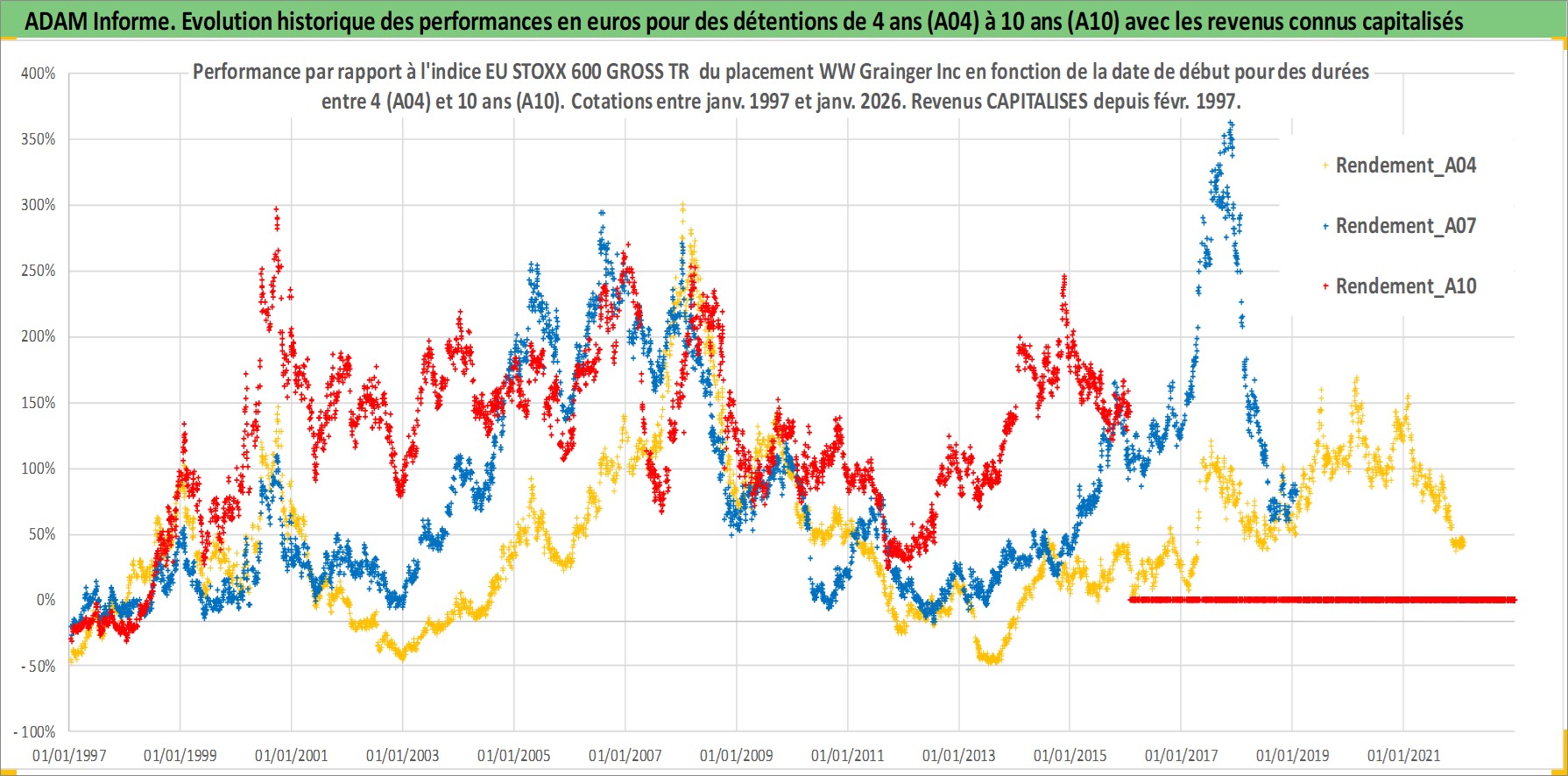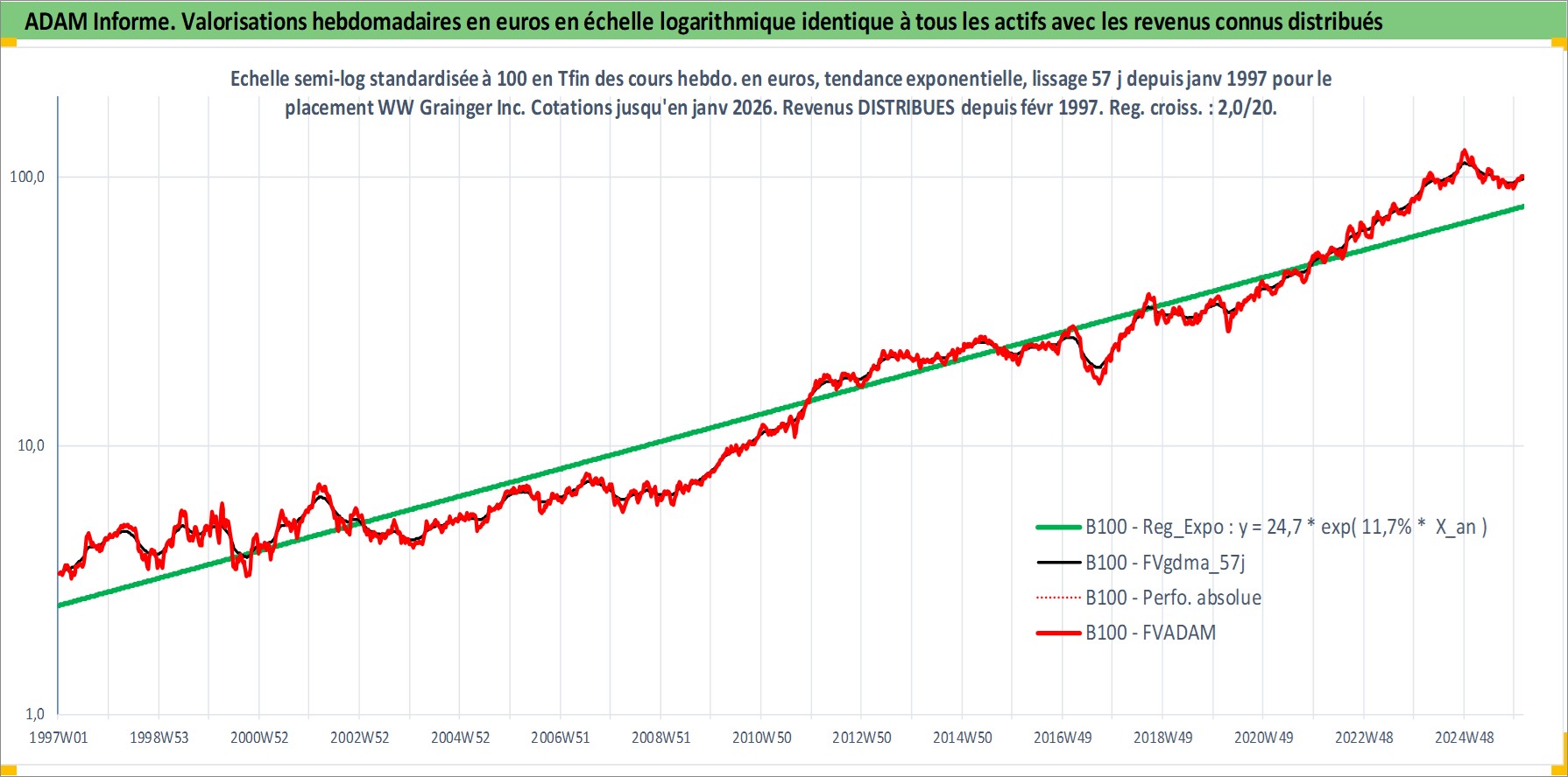 Site dédié aux investisseursPage dédiée sur site financeAnalyse des valorisations hebdomadaires de l'action WW Grainger Inc. Cet actif est cote en USD. Les valorisations sont en contrevaleur EURO et couvrent les semaines 1997W01 a 2026W05. Les revenus de cet actif financier sont pris en compte depuis la semaine 1997W06. La note globale ESG de cet actif est estimee a 13.0 (apres rebasage entre 0 et 20).