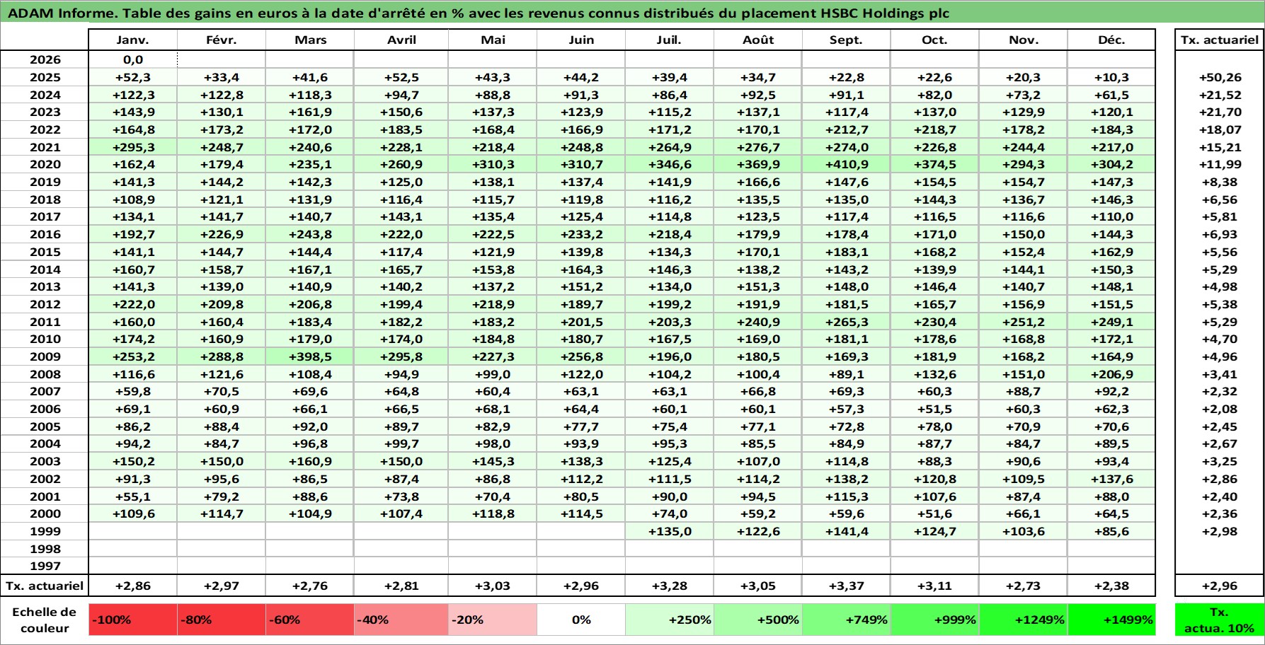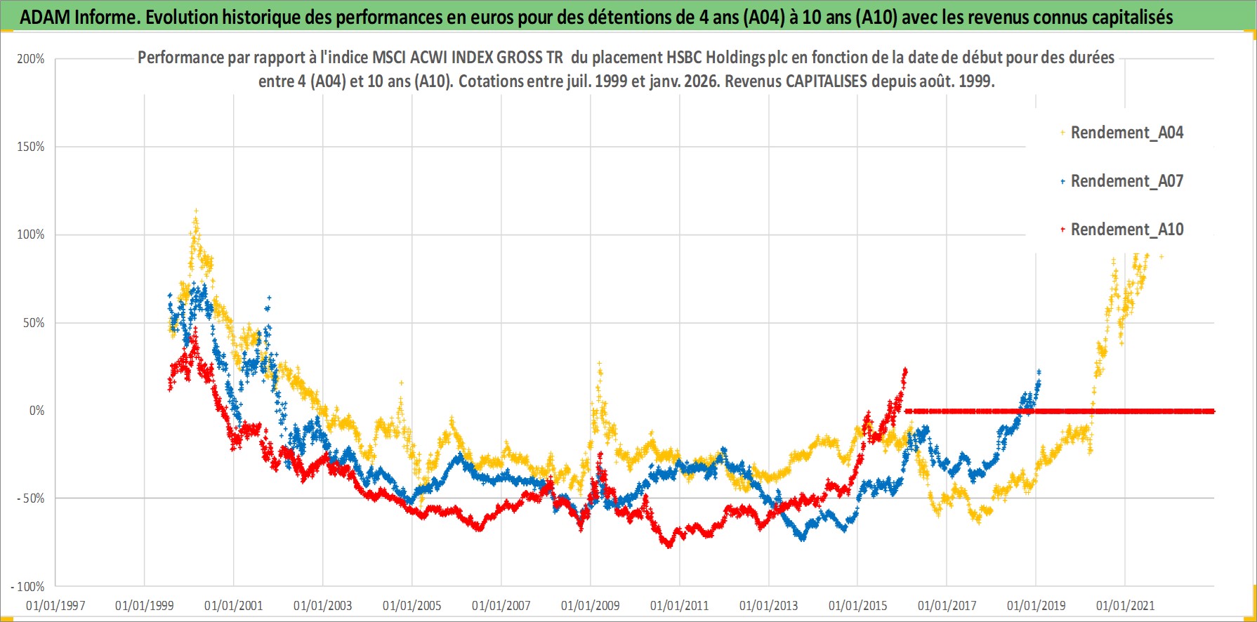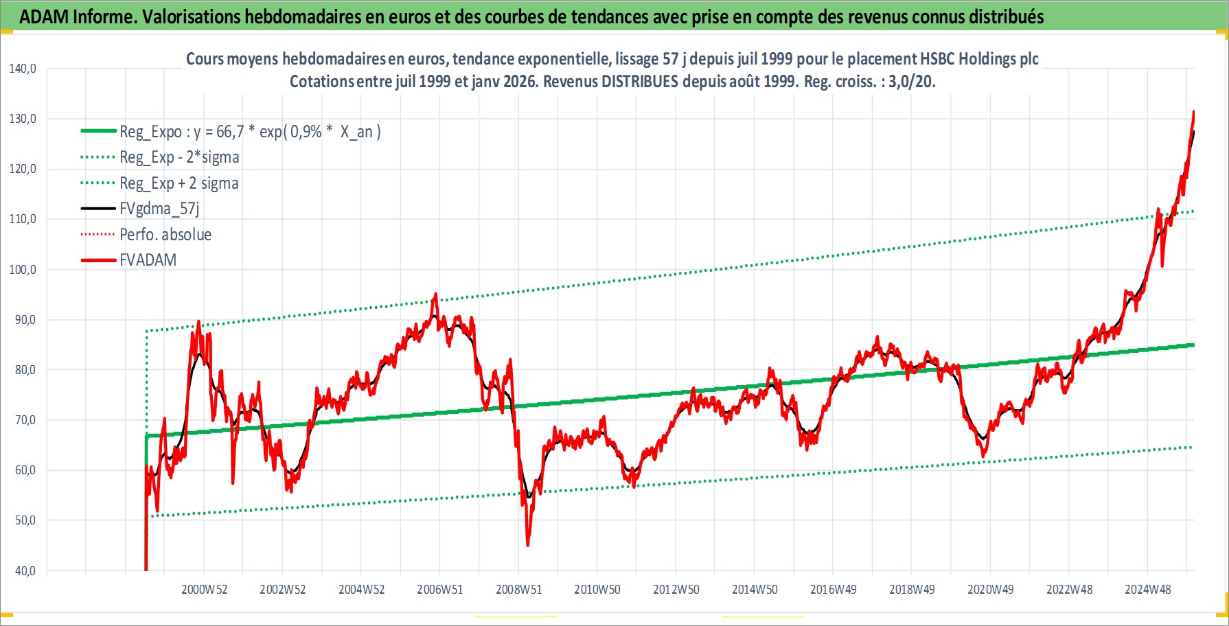 Site dédié aux investisseursPage dédiée sur site financeAnalyse des valorisations hebdomadaires de l'action HSBC Holdings plc. Cet actif est cote en USD. Les valorisations sont en contrevaleur EURO et couvrent les semaines 1999W28 a 2026W05. Les revenus de cet actif financier sont pris en compte depuis la semaine 1999W33. La note ESG de cet actif n'est pas connue.
