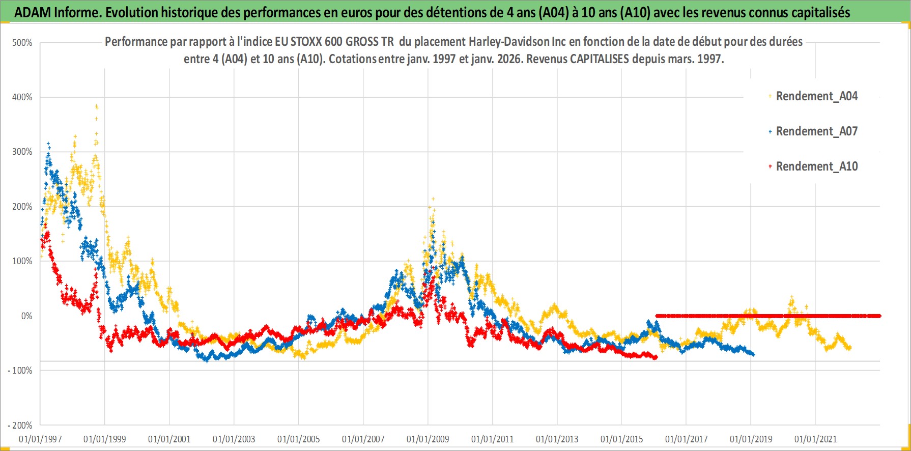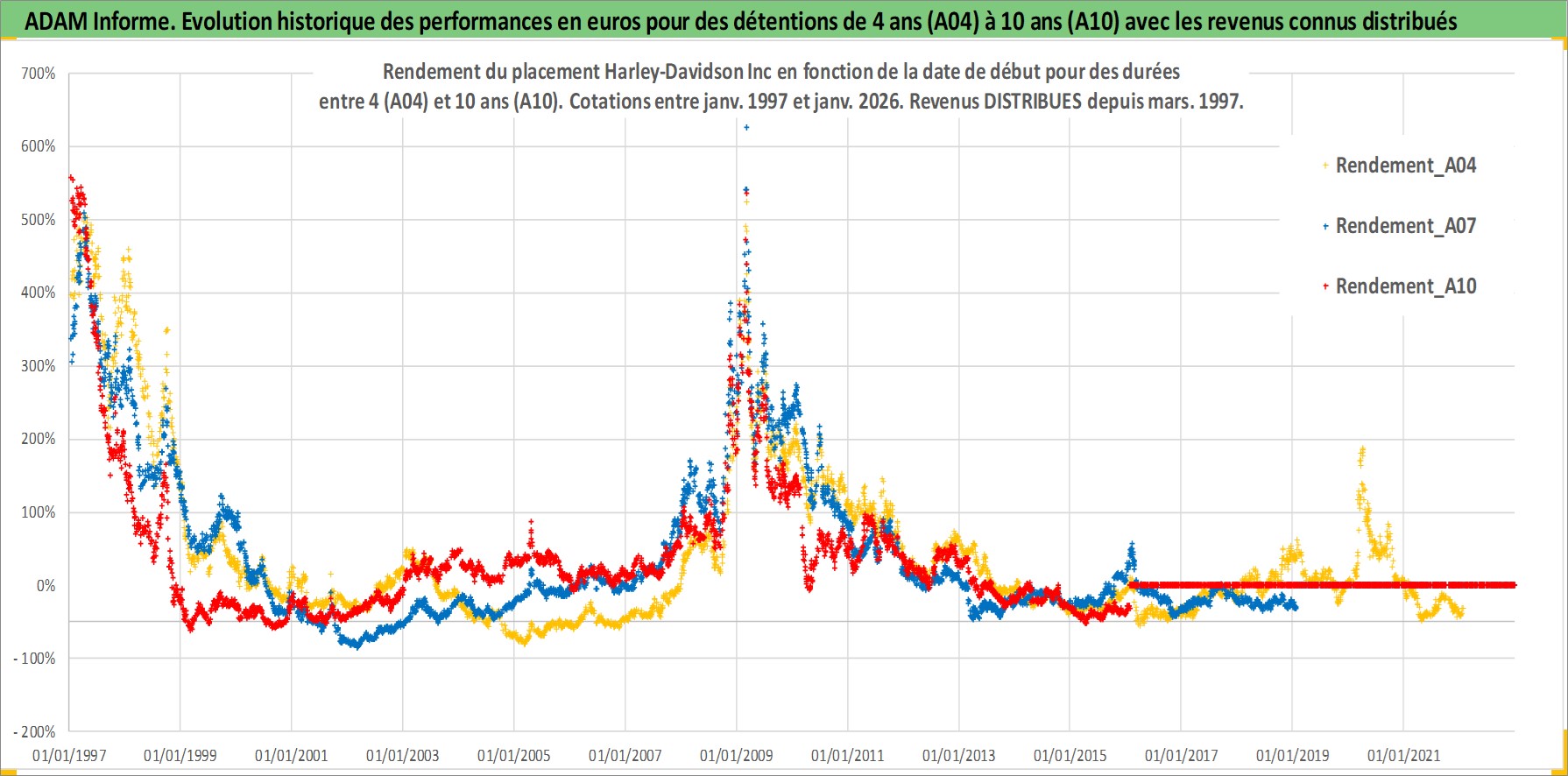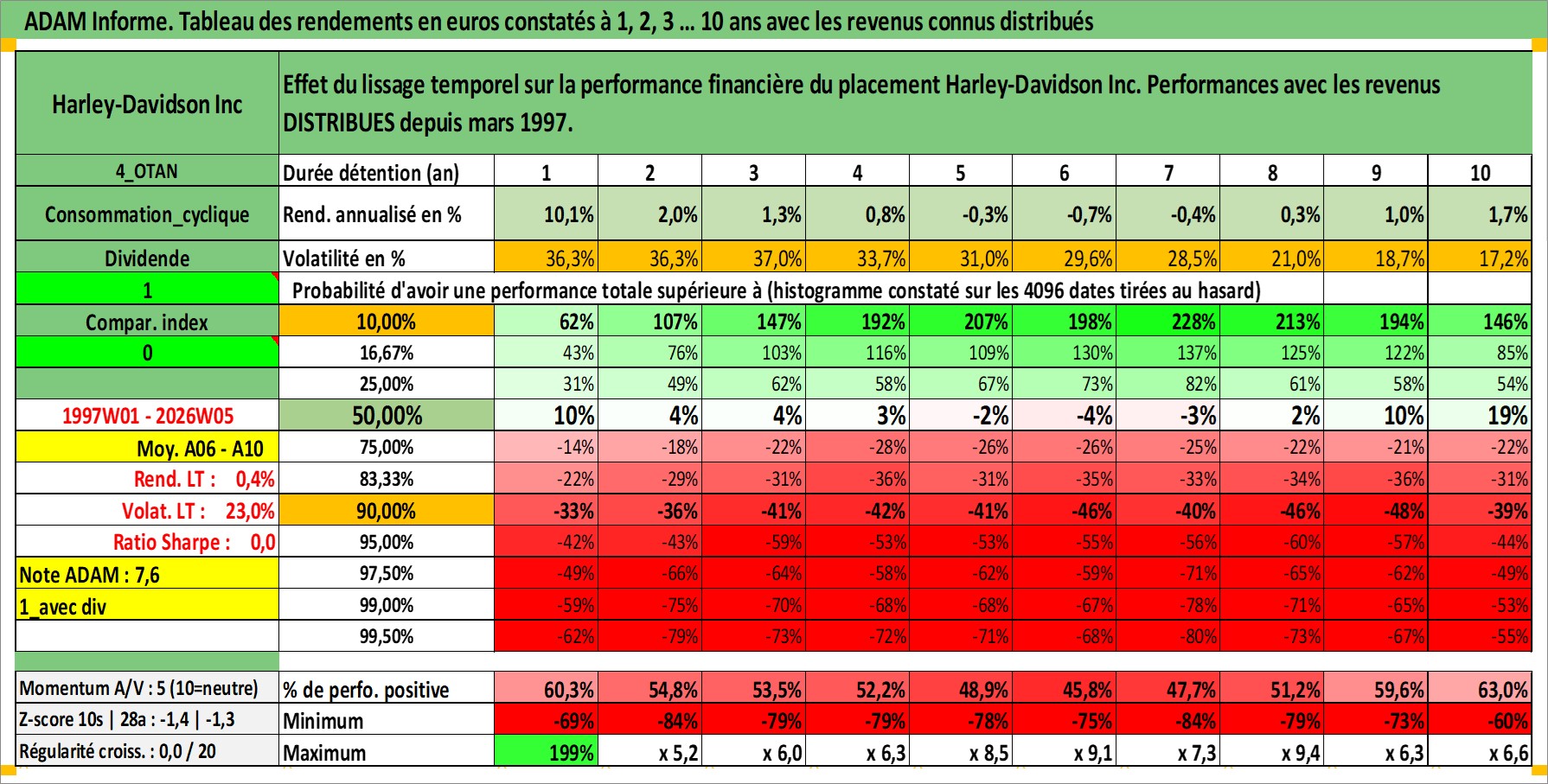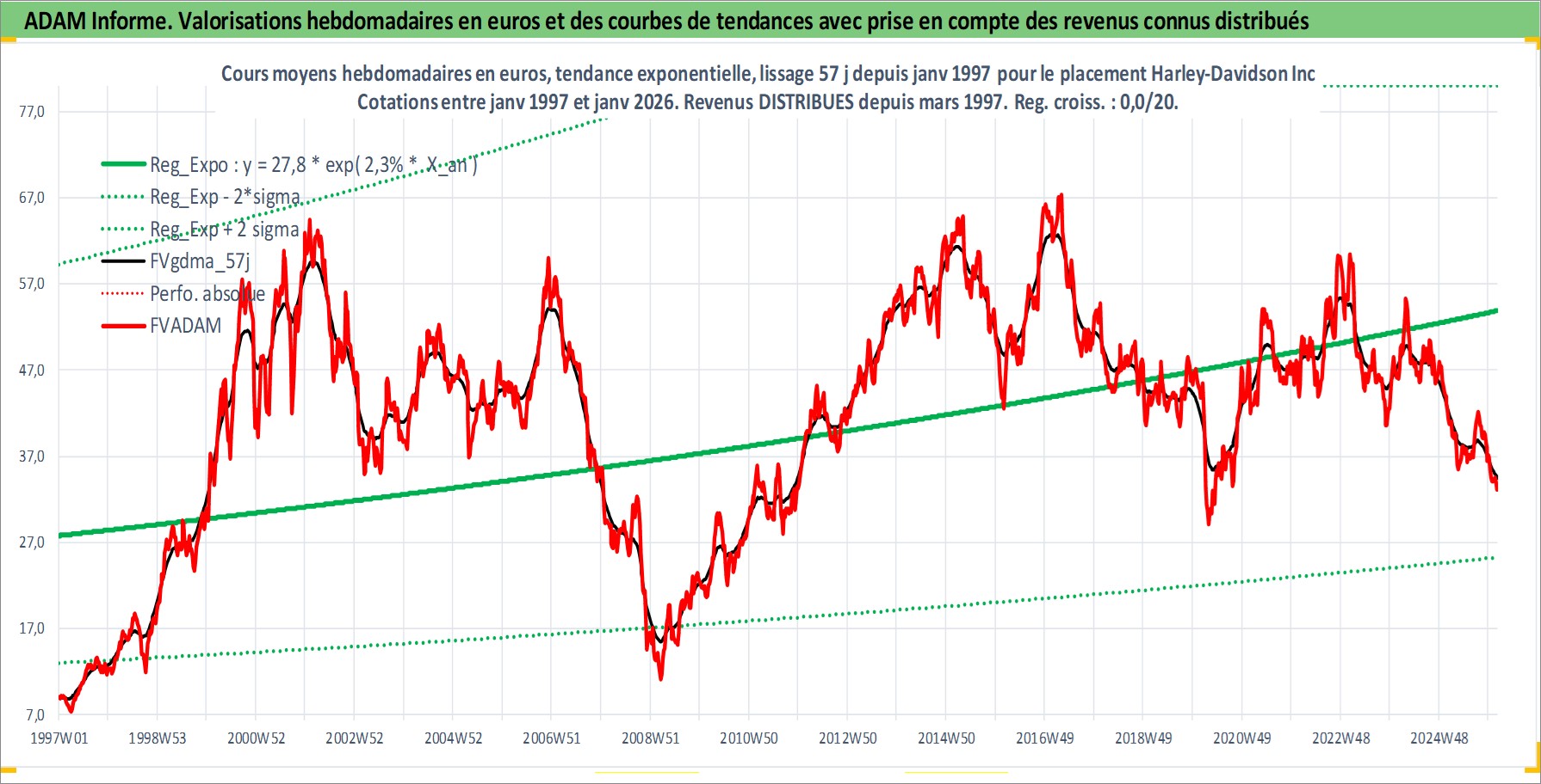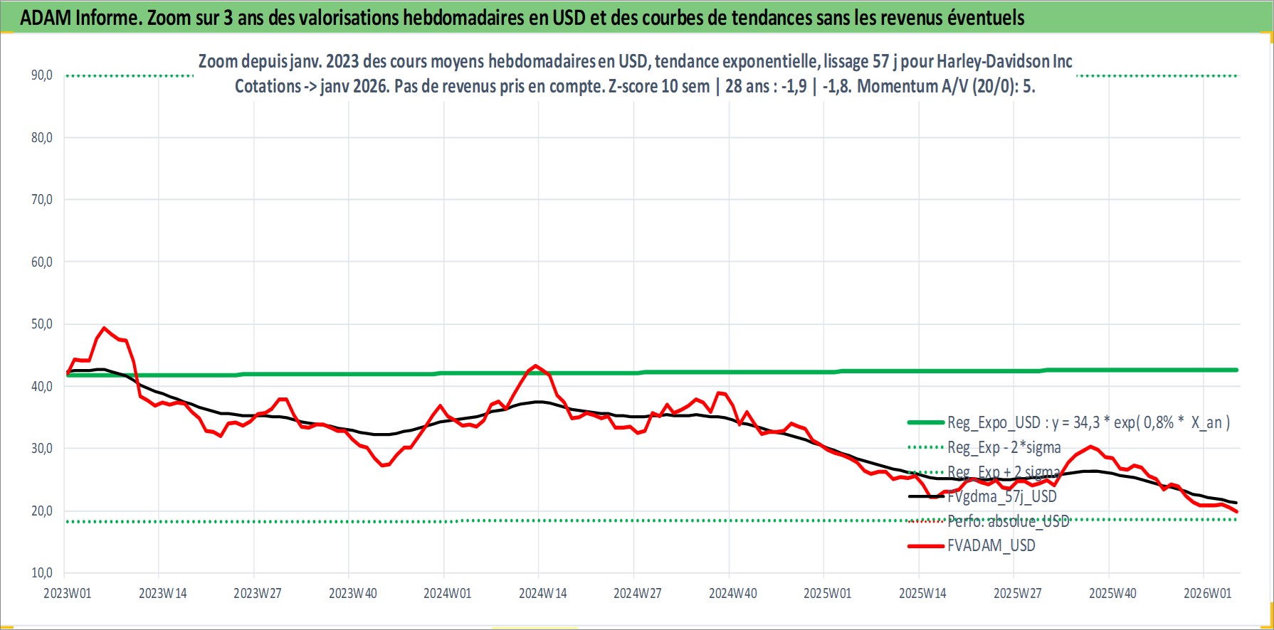 Site dédié aux investisseursPage dédiée sur site financeAnalyse des valorisations hebdomadaires de l'action Harley-Davidson Inc. Cet actif est cote en USD. Les valorisations sont en contrevaleur EURO et couvrent les semaines 1997W01 a 2026W05. Les revenus de cet actif financier sont pris en compte depuis la semaine 1997W11. La note globale ESG de cet actif est estimee a 13.0 (apres rebasage entre 0 et 20).