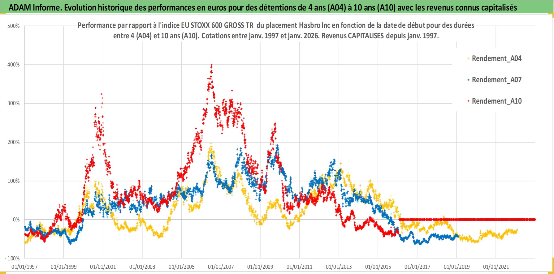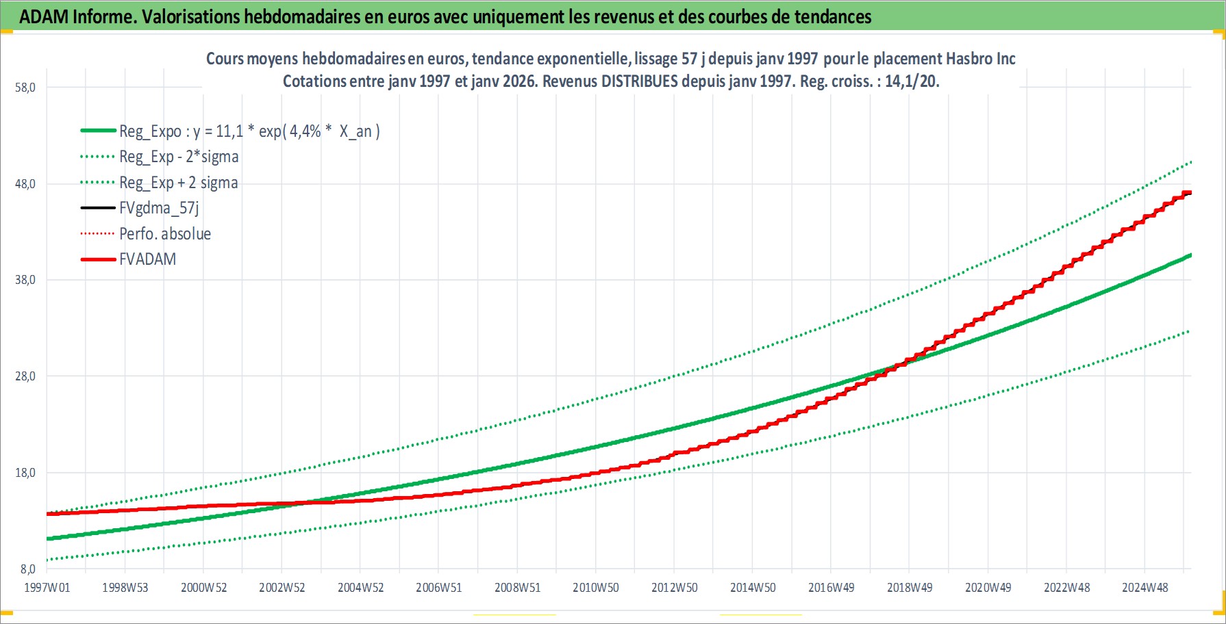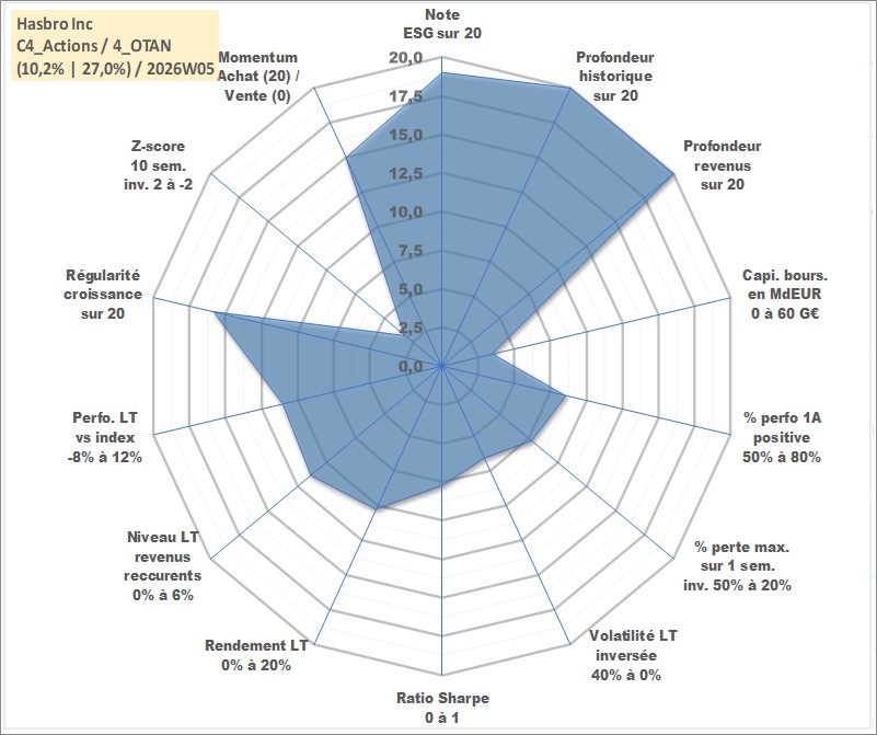 Site dédié aux investisseursPage dédiée sur site financeAnalyse des valorisations hebdomadaires de l'action Hasbro Inc. Cet actif est cote en USD. Les valorisations sont en contrevaleur EURO et couvrent les semaines 1997W01 a 2026W05. Les revenus de cet actif financier sont pris en compte depuis la semaine 1997W05. La note globale ESG de cet actif est estimee a 19.0 (apres rebasage entre 0 et 20).