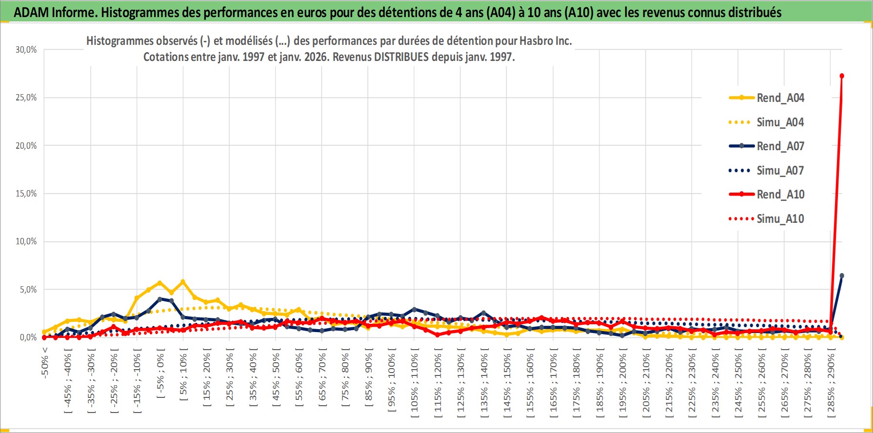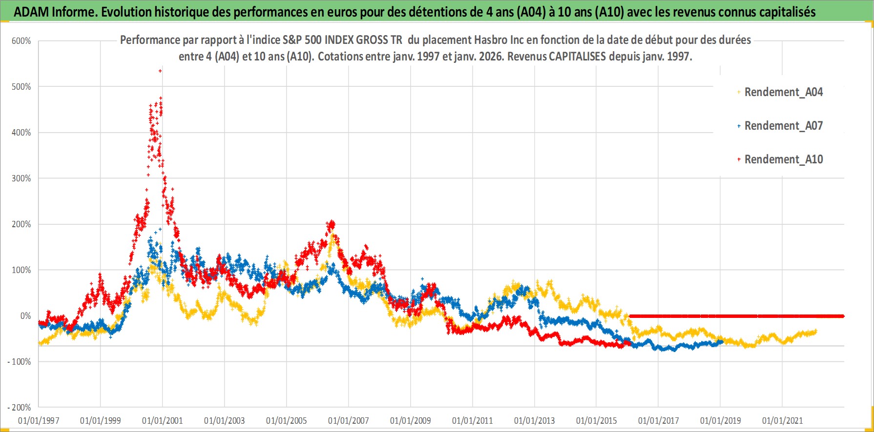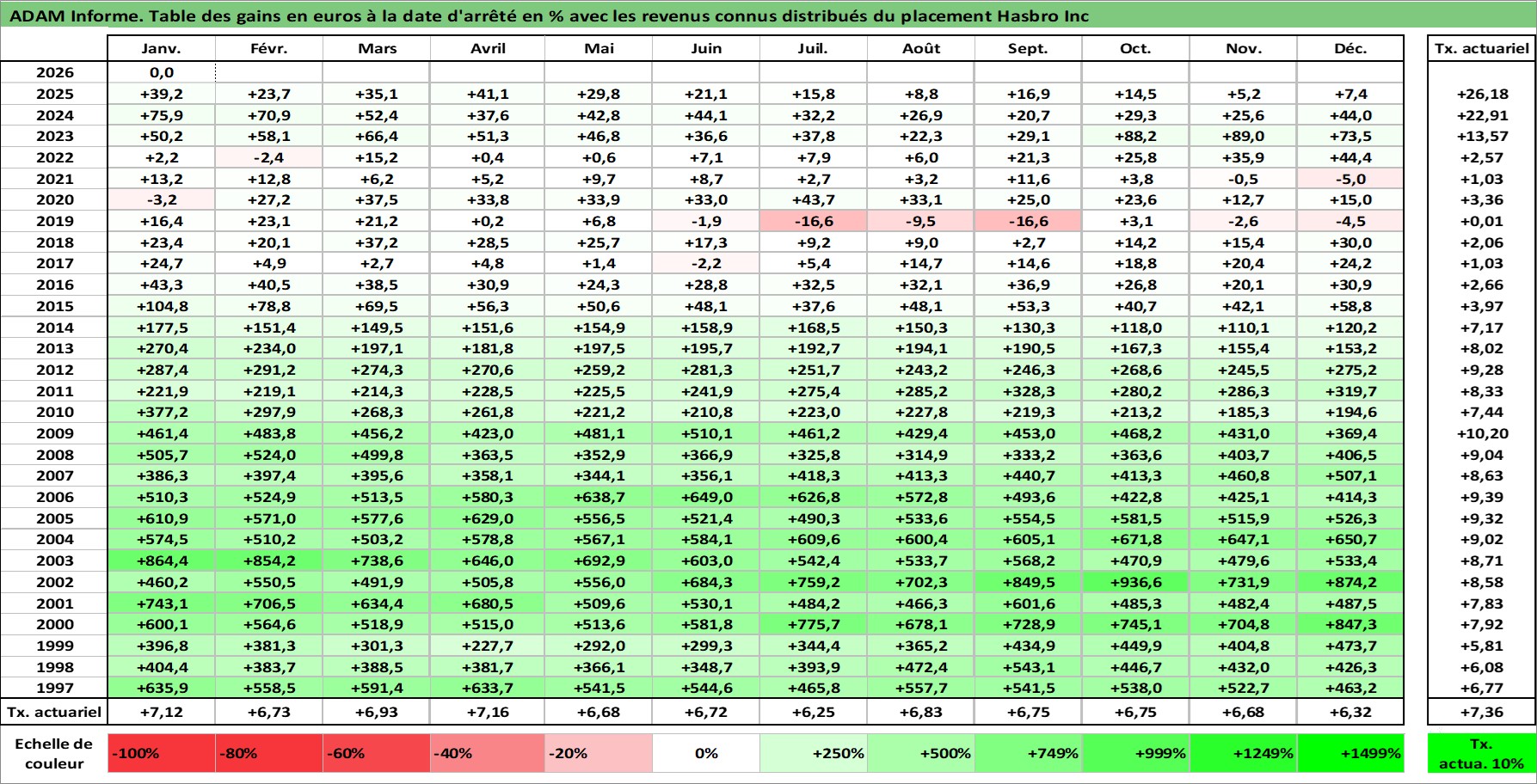 Site dédié aux investisseursPage dédiée sur site financeAnalyse des valorisations hebdomadaires de l'action Hasbro Inc. Cet actif est cote en USD. Les valorisations sont en contrevaleur EURO et couvrent les semaines 1997W01 a 2026W05. Les revenus de cet actif financier sont pris en compte depuis la semaine 1997W05. La note globale ESG de cet actif est estimee a 19.0 (apres rebasage entre 0 et 20).
