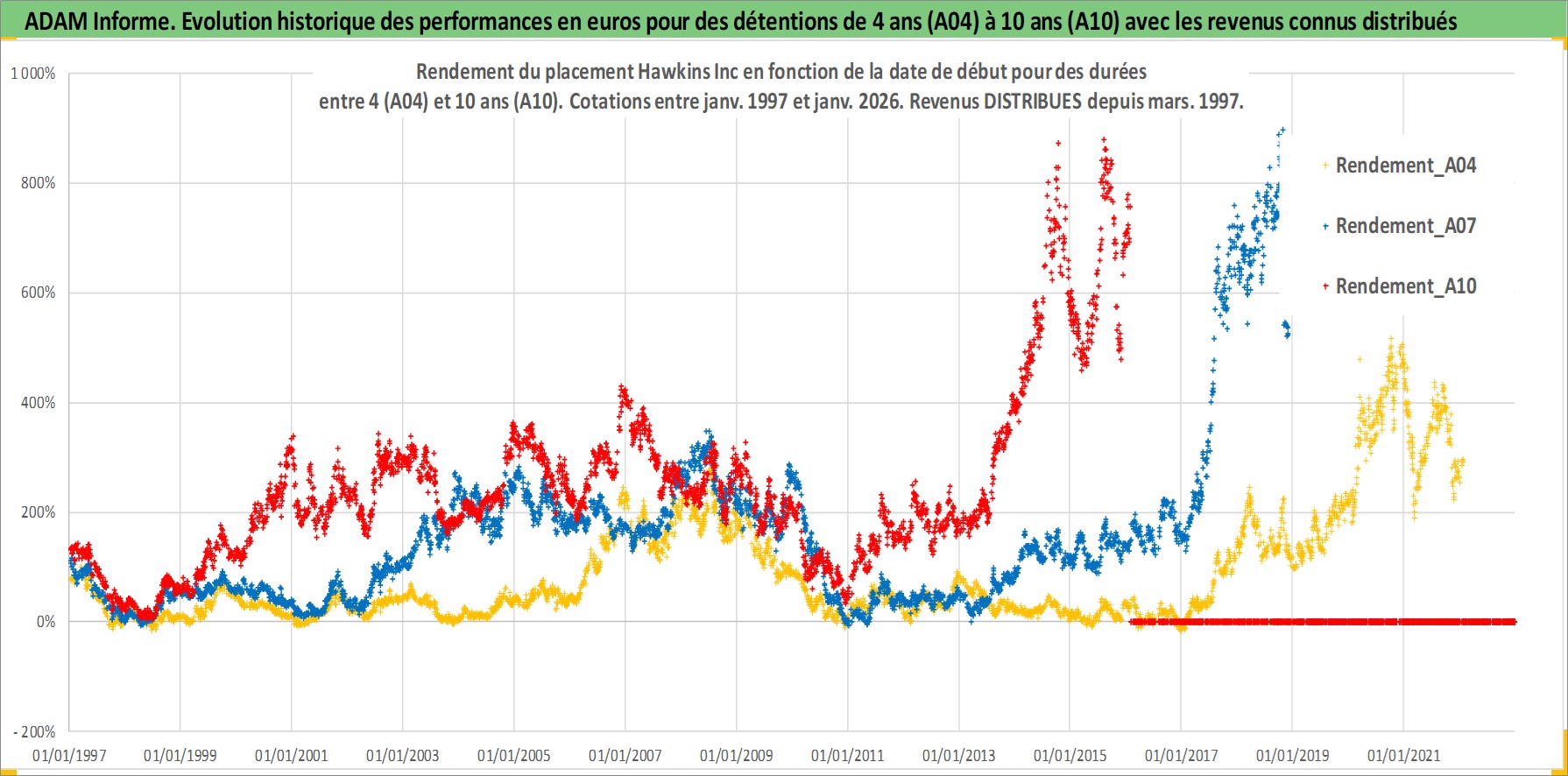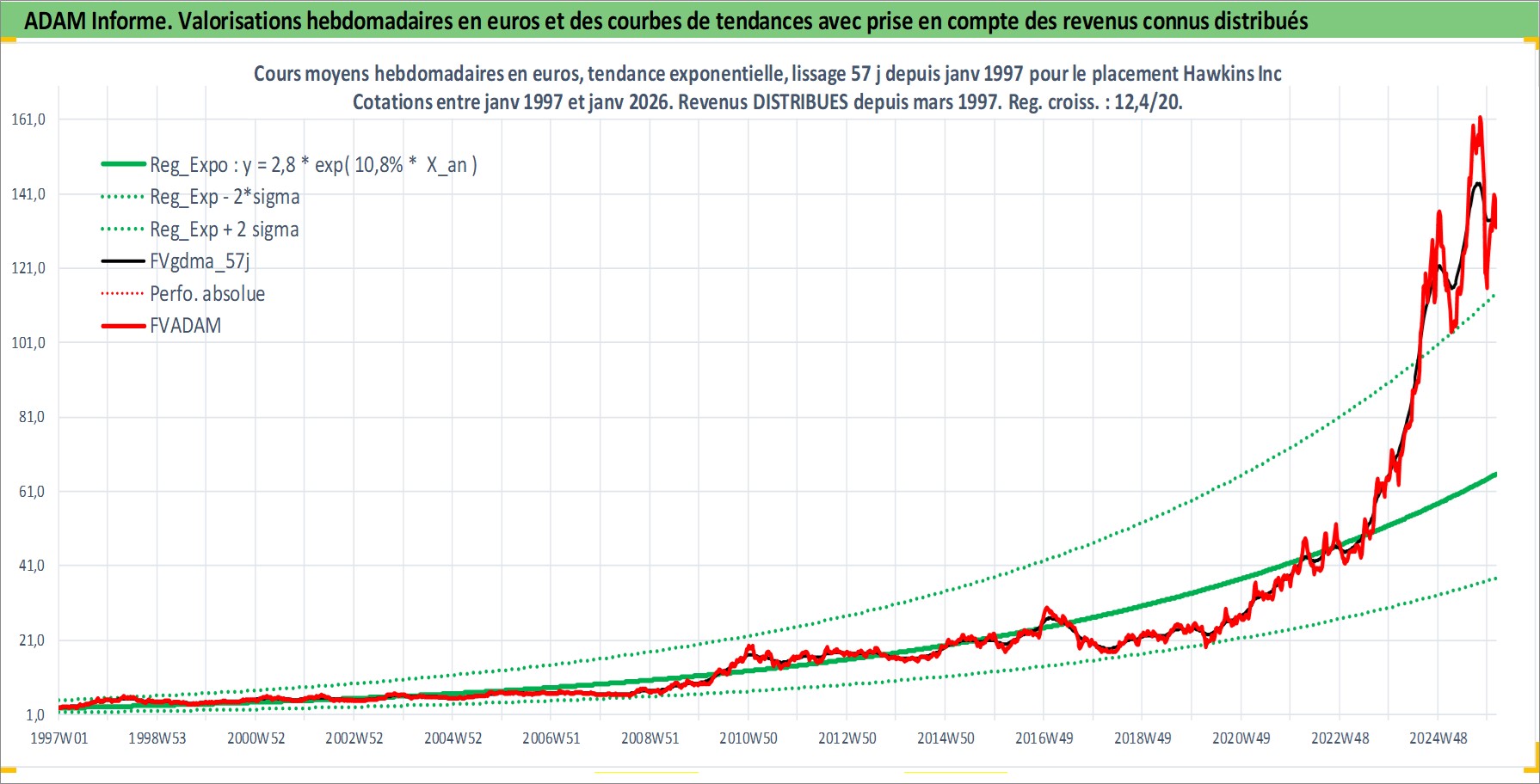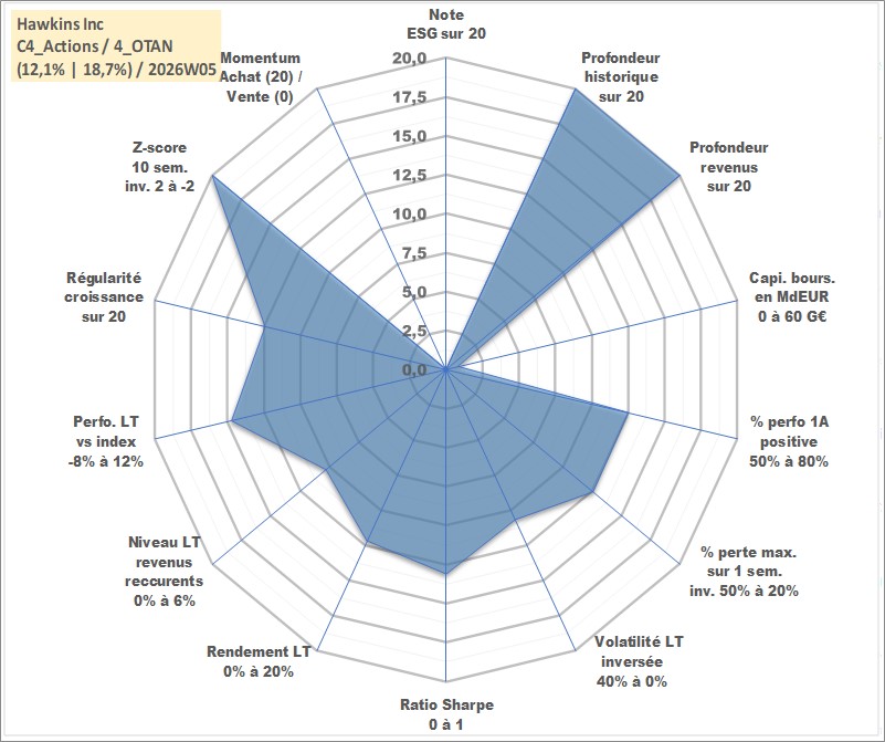 Site dédié aux investisseursPage dédiée sur site financeAnalyse des valorisations hebdomadaires de l'action Hawkins Inc. Cet actif est cote en USD. Les valorisations sont en contrevaleur EURO et couvrent les semaines 1997W01 a 2026W05. Les revenus de cet actif financier sont pris en compte depuis la semaine 1997W13. La note ESG de cet actif n'est pas connue.