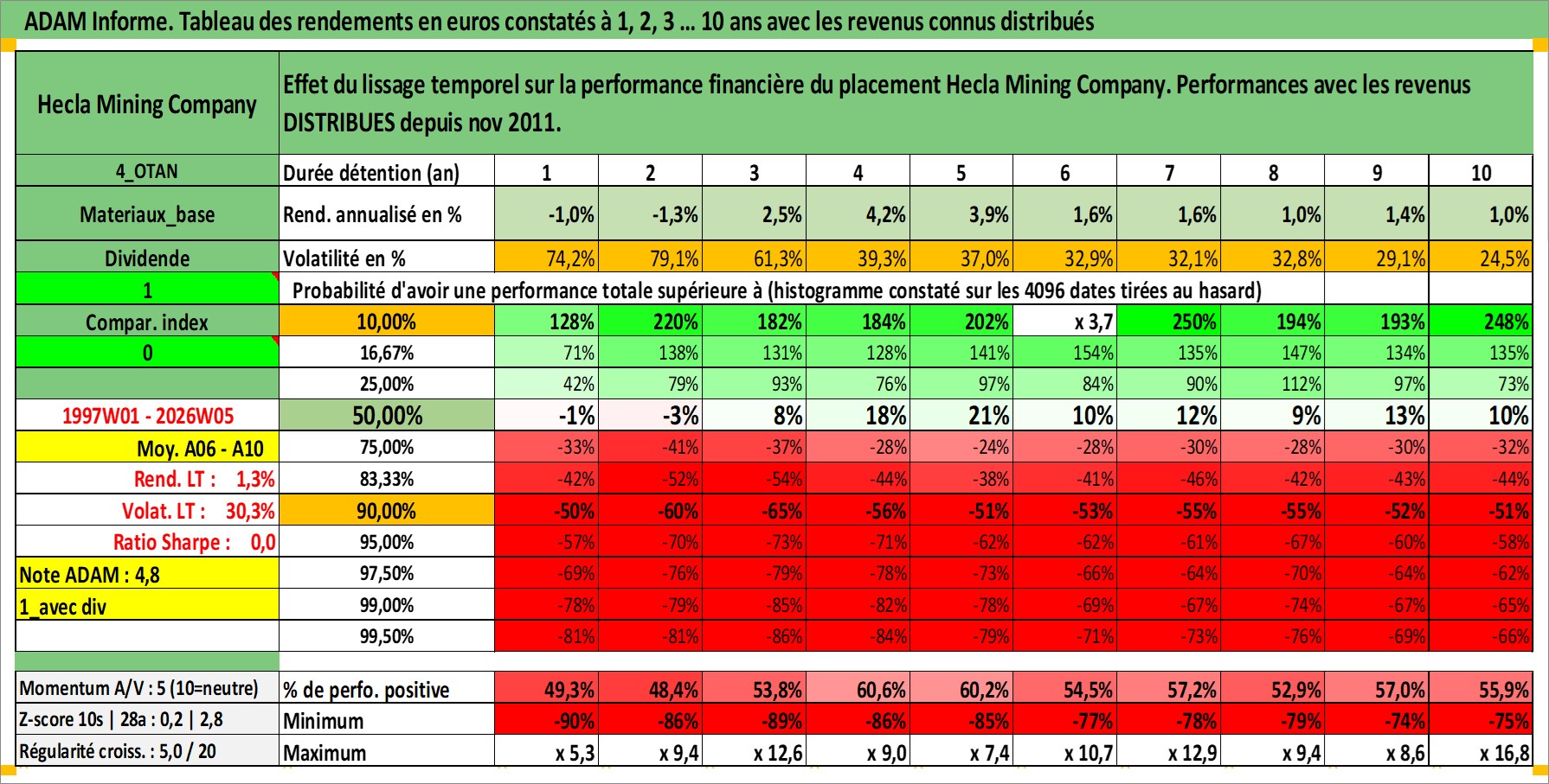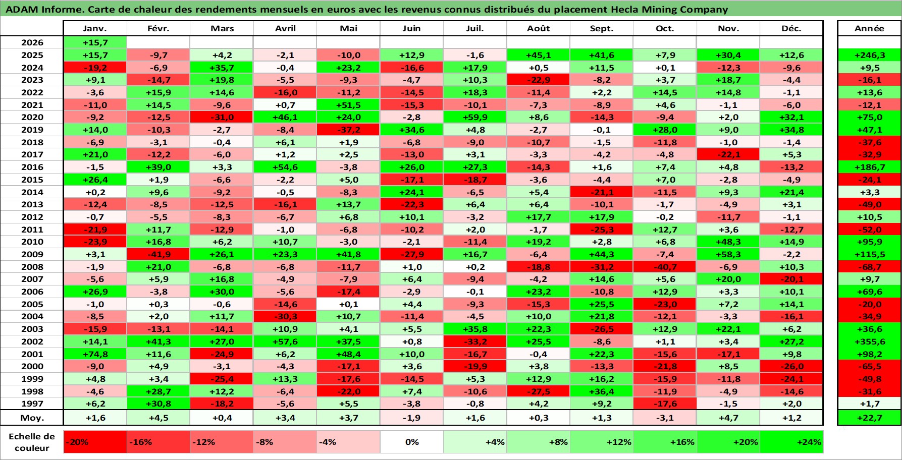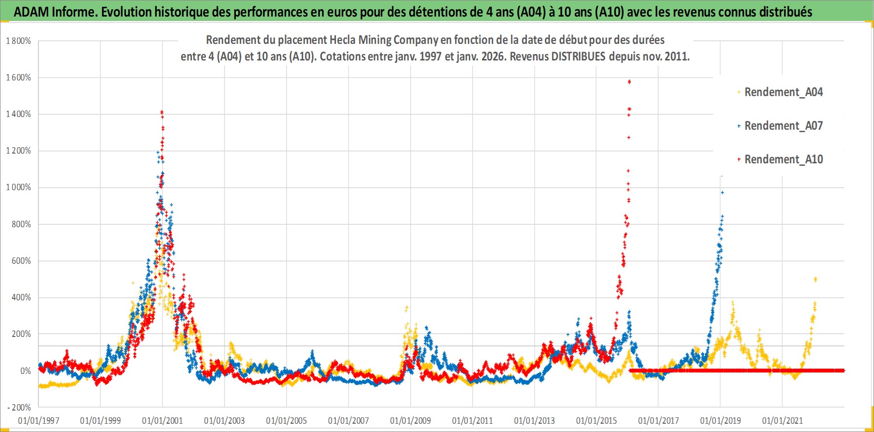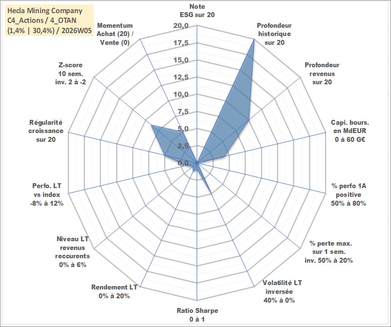 Site dédié aux investisseursPage dédiée sur site financeAnalyse des valorisations hebdomadaires de l'action Hecla Mining Company. Cet actif est cote en USD. Les valorisations sont en contrevaleur EURO et couvrent les semaines 1997W01 a 2026W05. Les revenus de cet actif financier sont pris en compte depuis la semaine 2011W46. La note ESG de cet actif n'est pas connue.