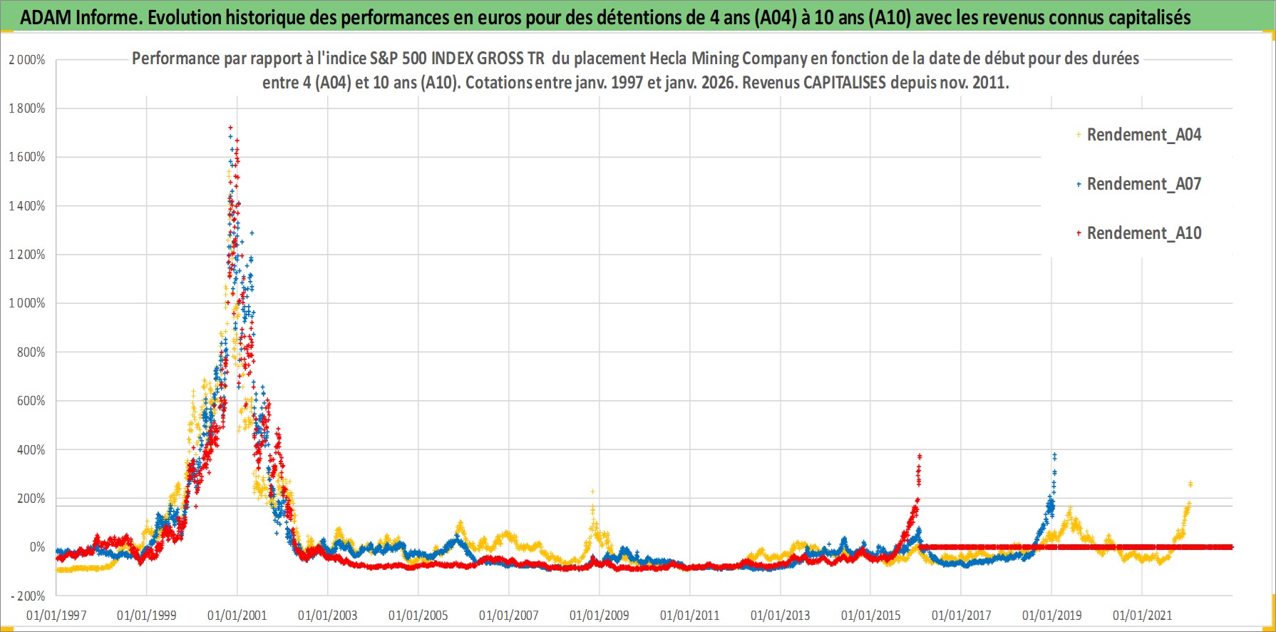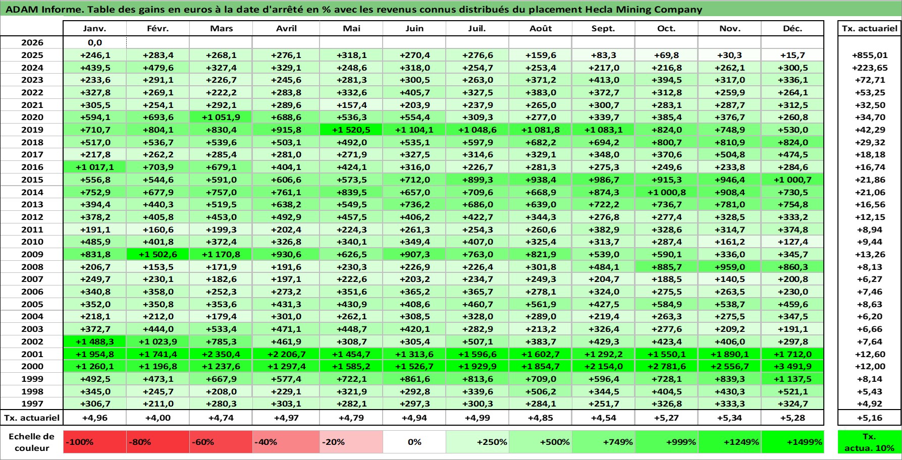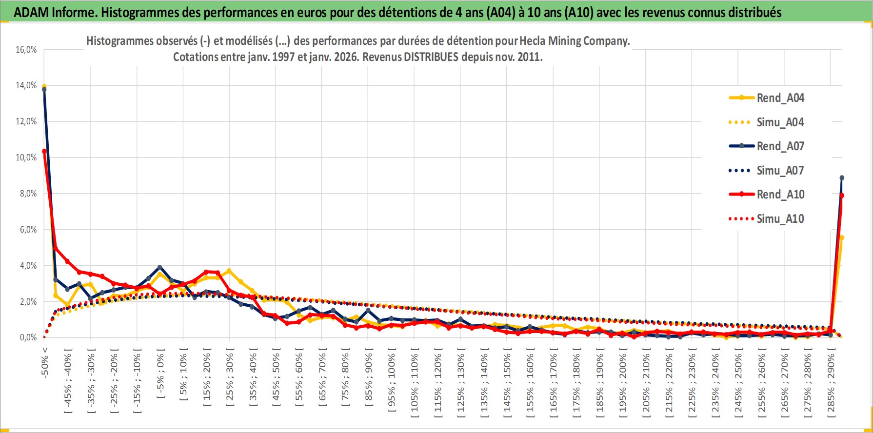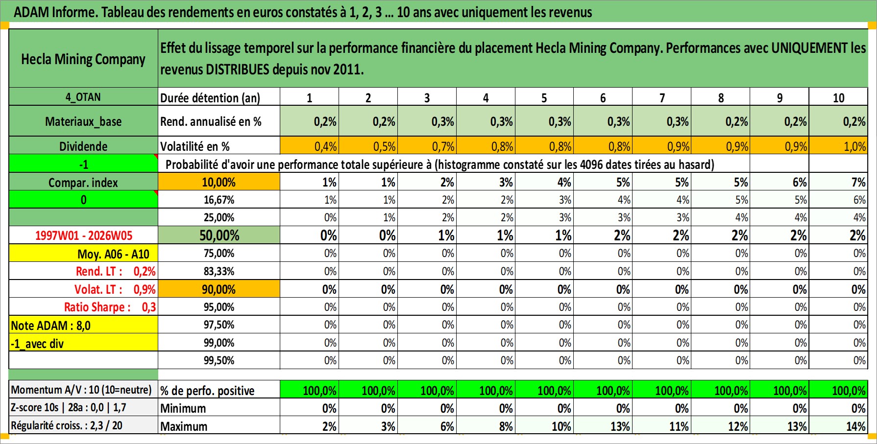 Site dédié aux investisseursPage dédiée sur site financeAnalyse des valorisations hebdomadaires de l'action Hecla Mining Company. Cet actif est cote en USD. Les valorisations sont en contrevaleur EURO et couvrent les semaines 1997W01 a 2026W05. Les revenus de cet actif financier sont pris en compte depuis la semaine 2011W46. La note ESG de cet actif n'est pas connue.