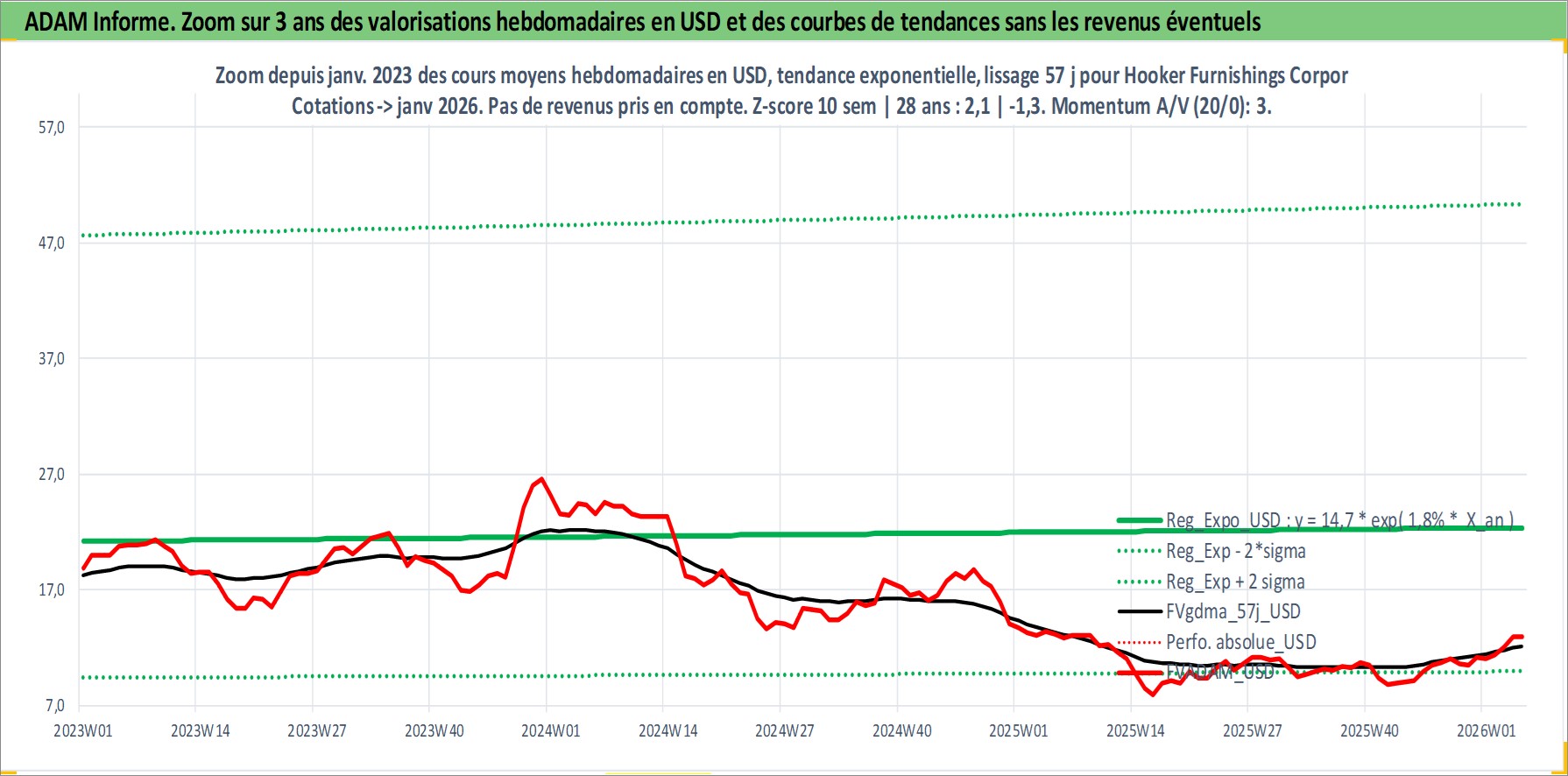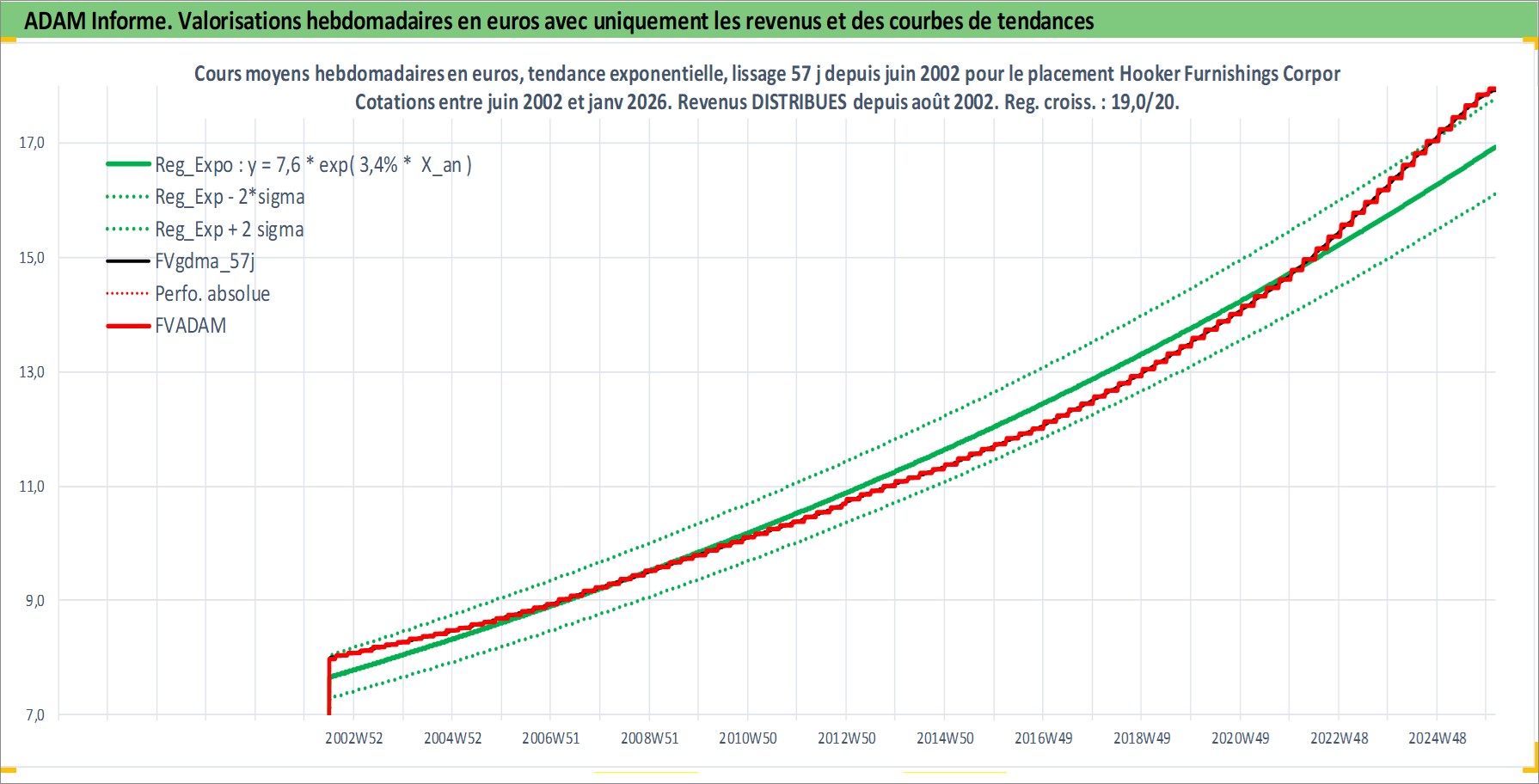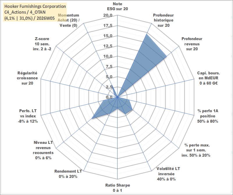 Site dédié aux investisseursPage dédiée sur site financeAnalyse des valorisations hebdomadaires de l'action Hooker Furnishings Corporation. Cet actif est cote en USD. Les valorisations sont en contrevaleur EURO et couvrent les semaines 2002W26 a 2026W05. Les revenus de cet actif financier sont pris en compte depuis la semaine 2002W33. La note ESG de cet actif n'est pas connue.