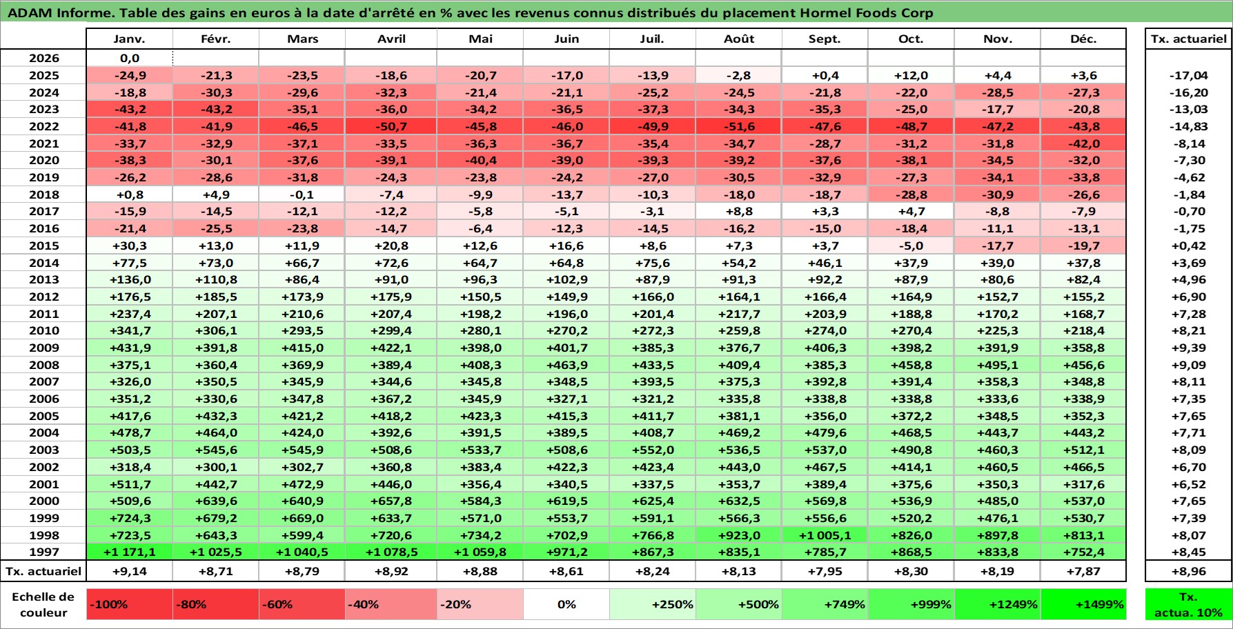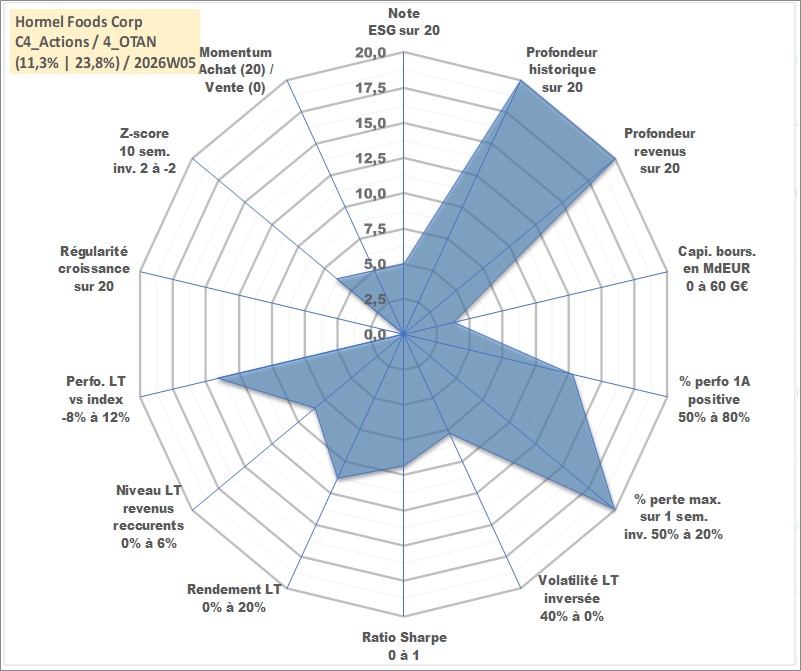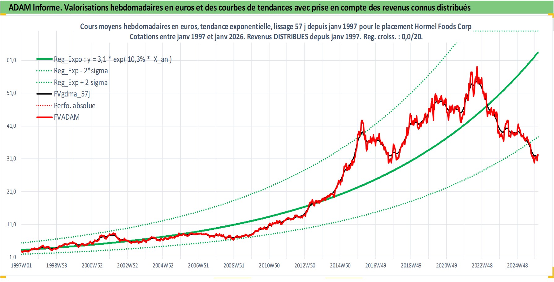 Site dédié aux investisseursPage dédiée sur site financeAnalyse des valorisations hebdomadaires de l'action Hormel Foods Corp. Cet actif est cote en USD. Les valorisations sont en contrevaleur EURO et couvrent les semaines 1997W01 a 2026W05. Les revenus de cet actif financier sont pris en compte depuis la semaine 1997W03. La note globale ESG de cet actif est estimee a 5.0 (apres rebasage entre 0 et 20).