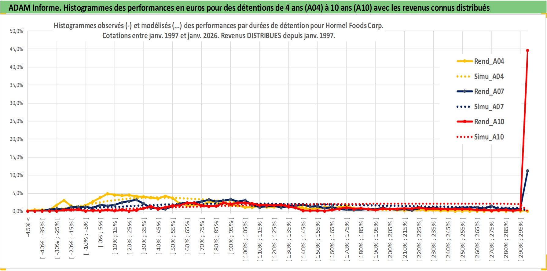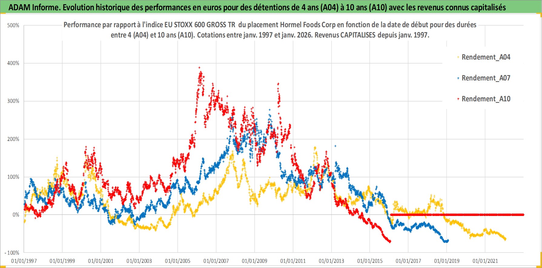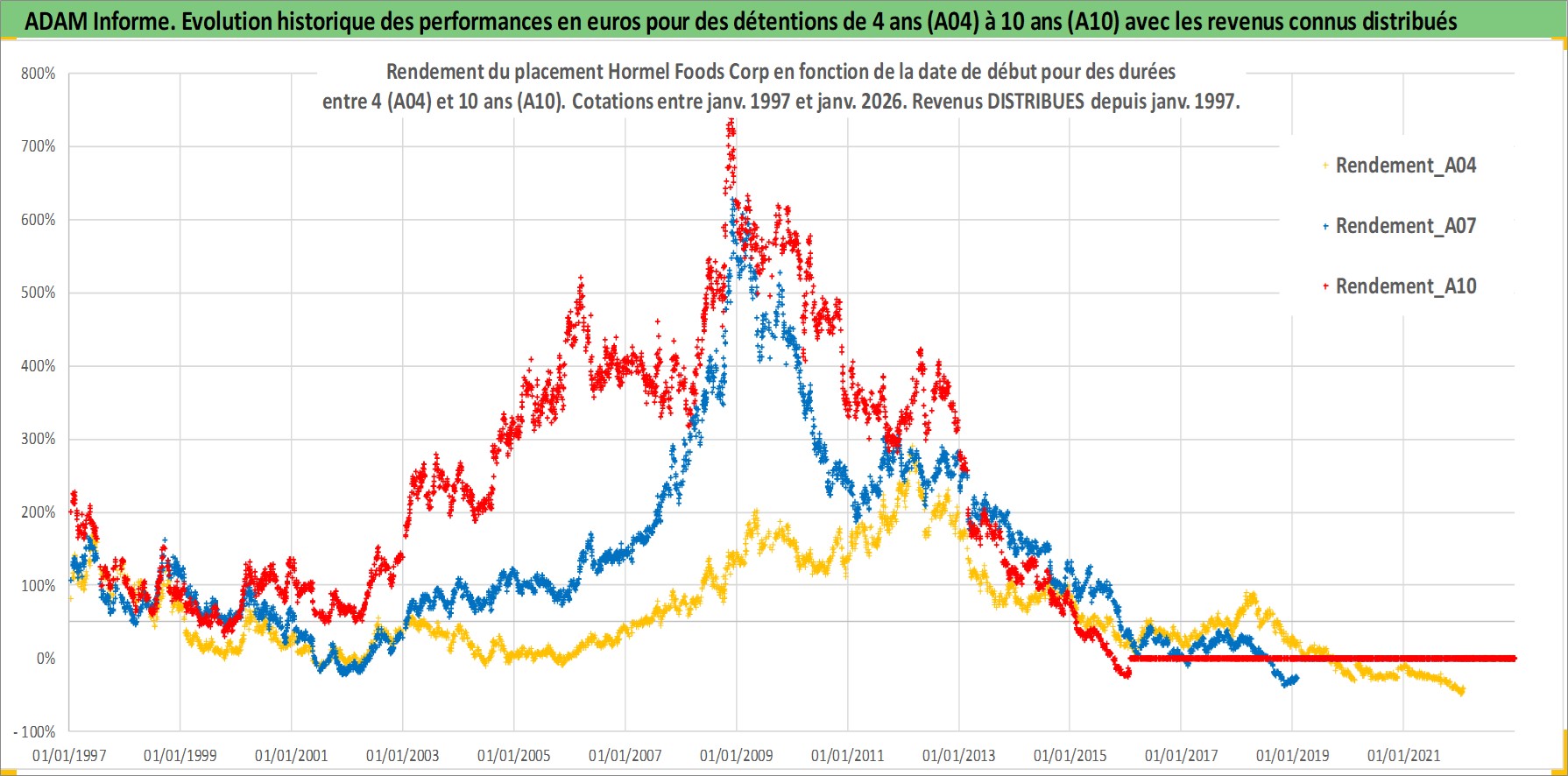 Site dédié aux investisseursPage dédiée sur site financeAnalyse des valorisations hebdomadaires de l'action Hormel Foods Corp. Cet actif est cote en USD. Les valorisations sont en contrevaleur EURO et couvrent les semaines 1997W01 a 2026W05. Les revenus de cet actif financier sont pris en compte depuis la semaine 1997W03. La note globale ESG de cet actif est estimee a 5.0 (apres rebasage entre 0 et 20).