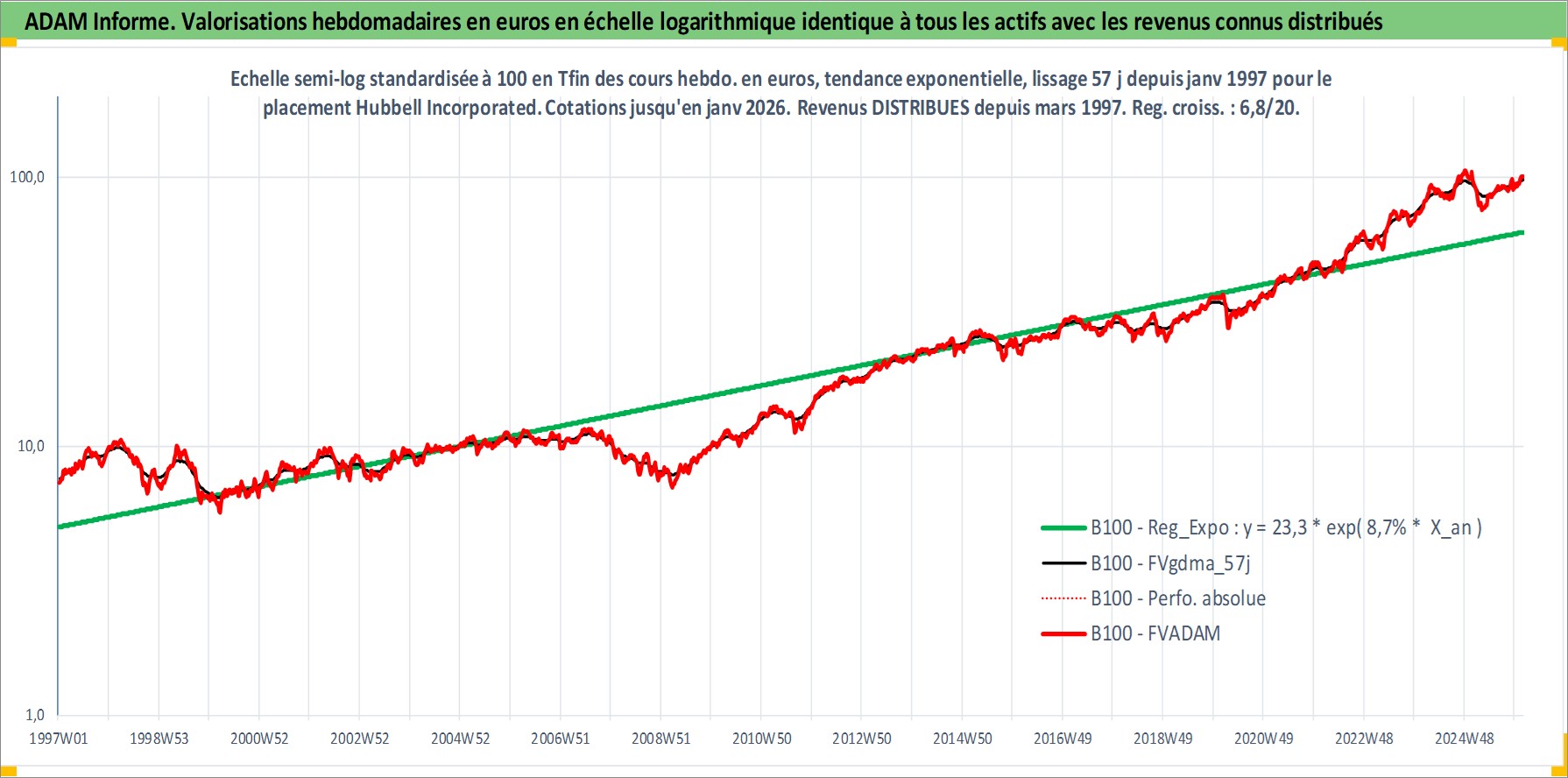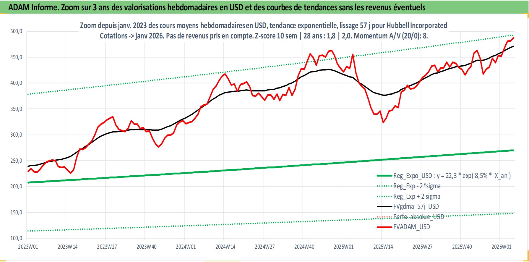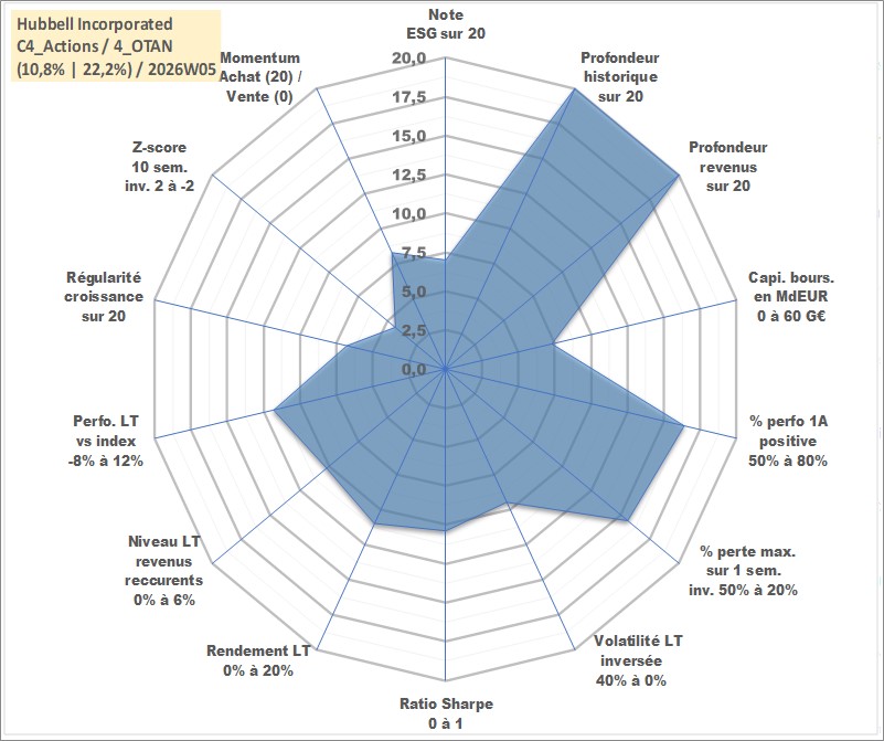 Site dédié aux investisseursPage dédiée sur site financeAnalyse des valorisations hebdomadaires de l'action Hubbell Incorporated. Cet actif est cote en USD. Les valorisations sont en contrevaleur EURO et couvrent les semaines 1997W01 a 2026W05. Les revenus de cet actif financier sont pris en compte depuis la semaine 1997W12. La note globale ESG de cet actif est estimee a 7.0 (apres rebasage entre 0 et 20).