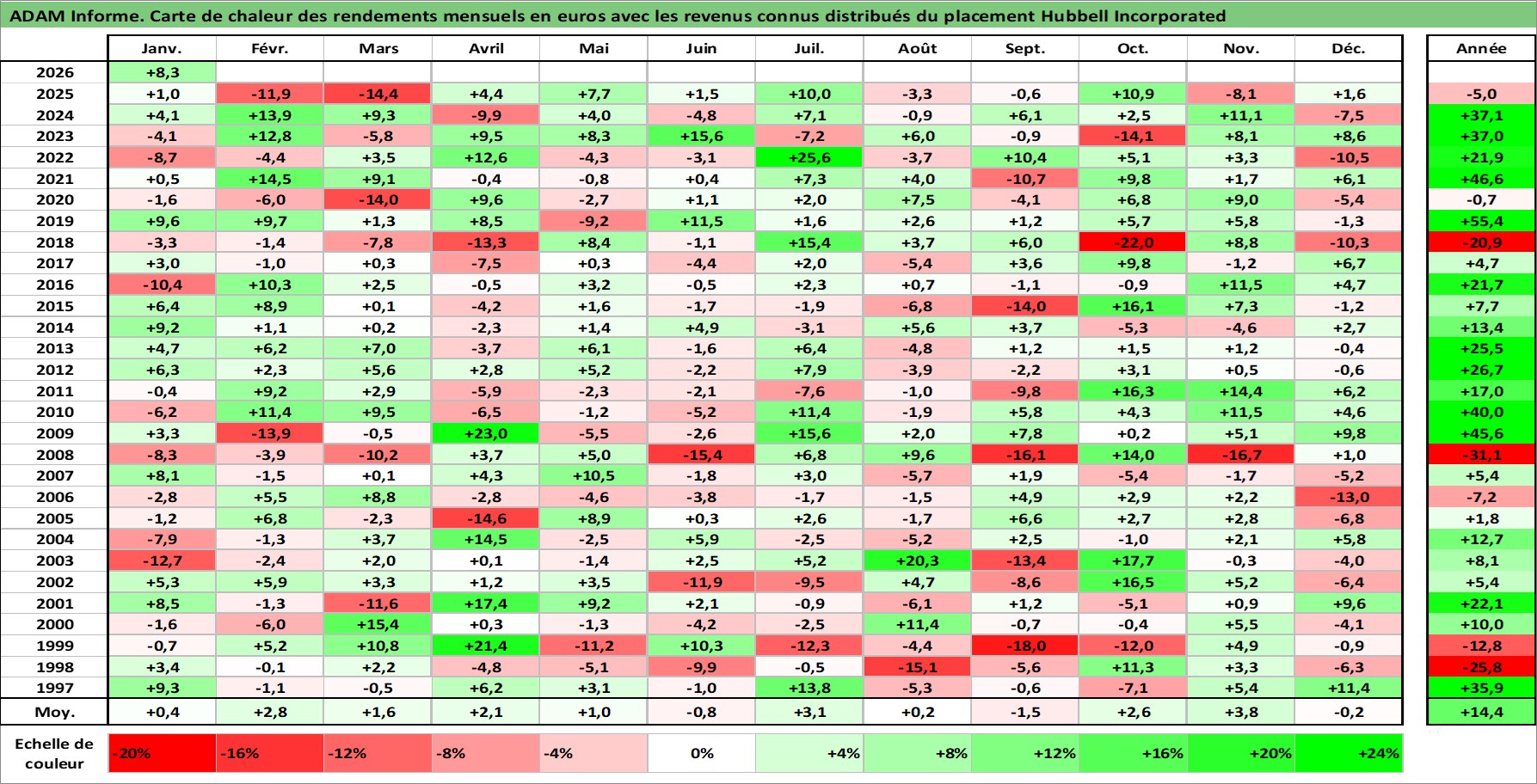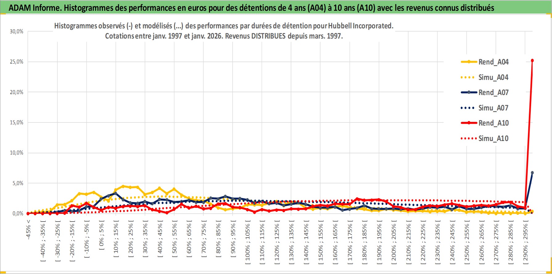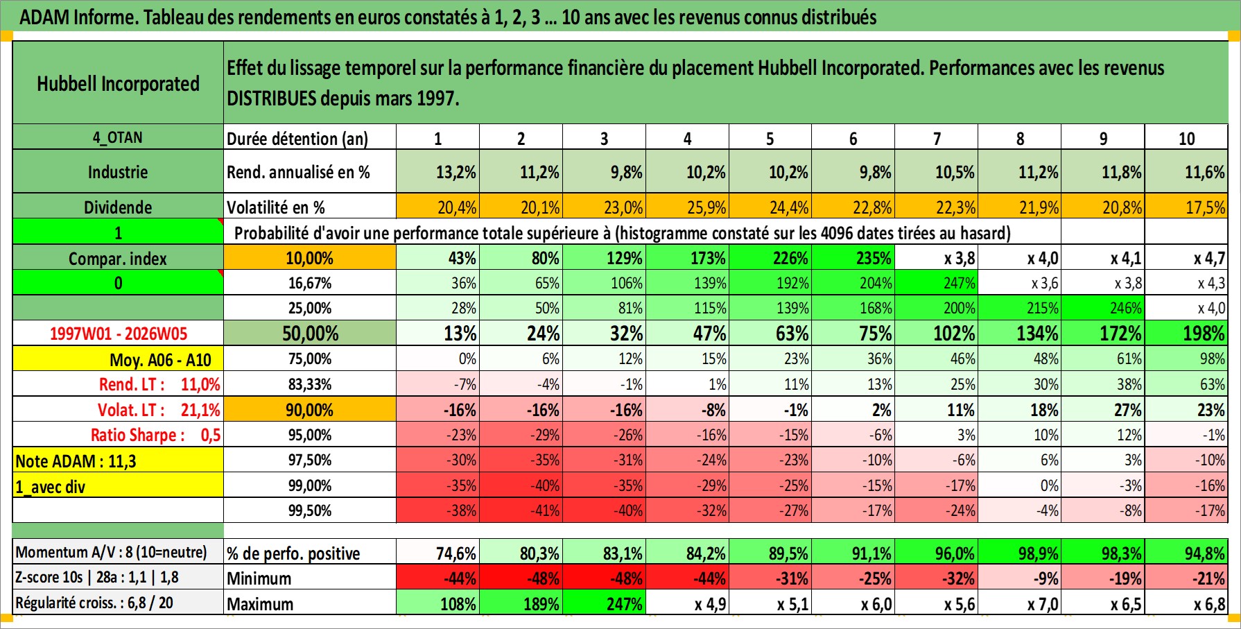 Site dédié aux investisseursPage dédiée sur site financeAnalyse des valorisations hebdomadaires de l'action Hubbell Incorporated. Cet actif est cote en USD. Les valorisations sont en contrevaleur EURO et couvrent les semaines 1997W01 a 2026W05. Les revenus de cet actif financier sont pris en compte depuis la semaine 1997W12. La note globale ESG de cet actif est estimee a 7.0 (apres rebasage entre 0 et 20).