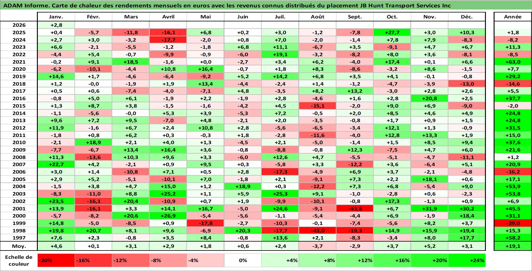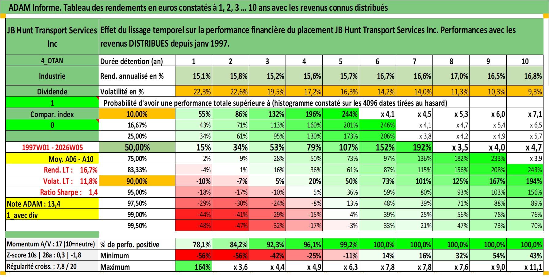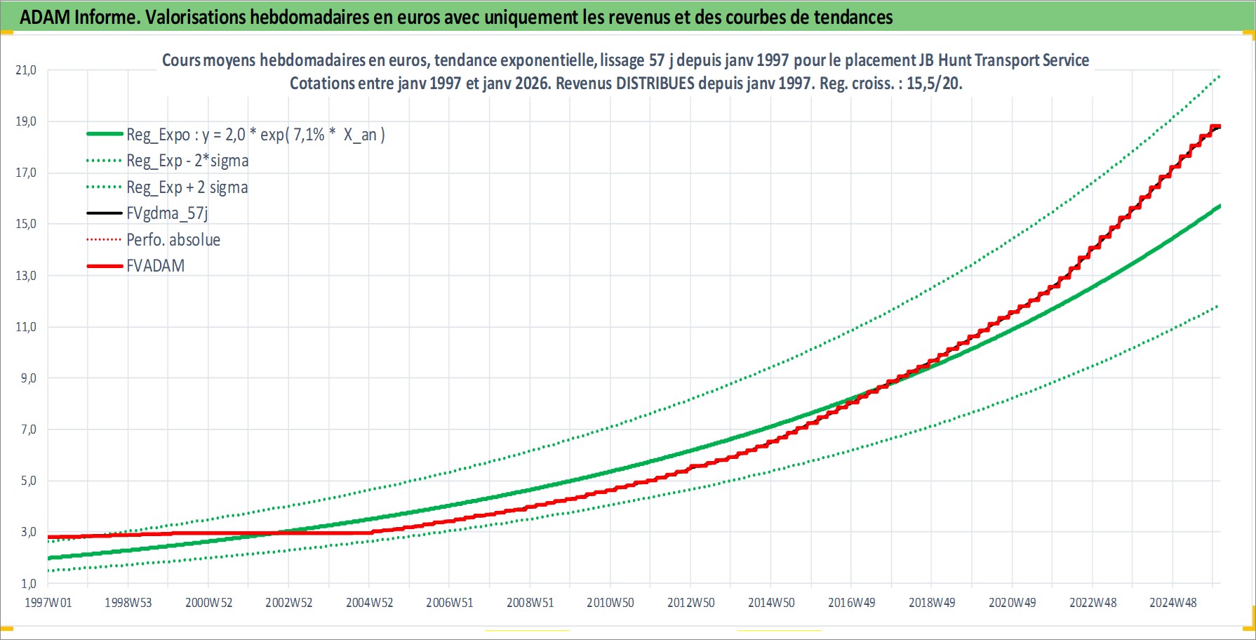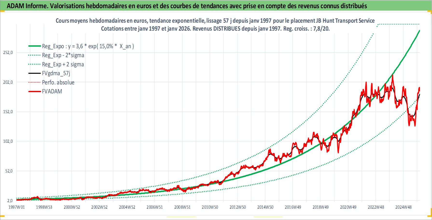 Site dédié aux investisseursPage dédiée sur site financeAnalyse des valorisations hebdomadaires de l'action JB Hunt Transport Services Inc. Cet actif est cote en USD. Les valorisations sont en contrevaleur EURO et couvrent les semaines 1997W01 a 2026W05. Les revenus de cet actif financier sont pris en compte depuis la semaine 1997W05. La note globale ESG de cet actif est estimee a 14.0 (apres rebasage entre 0 et 20).