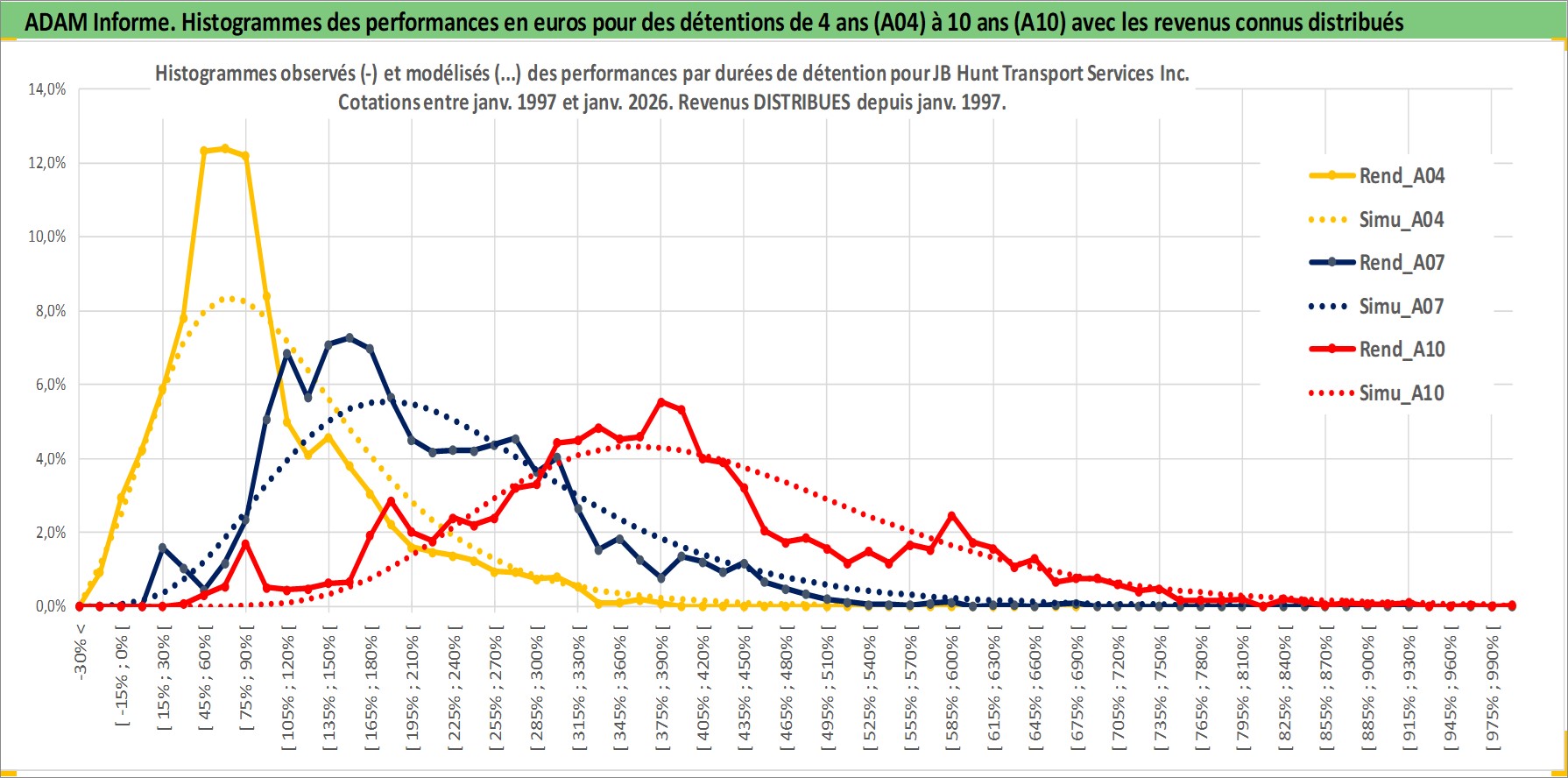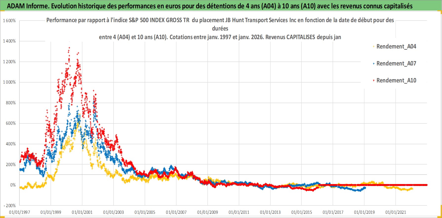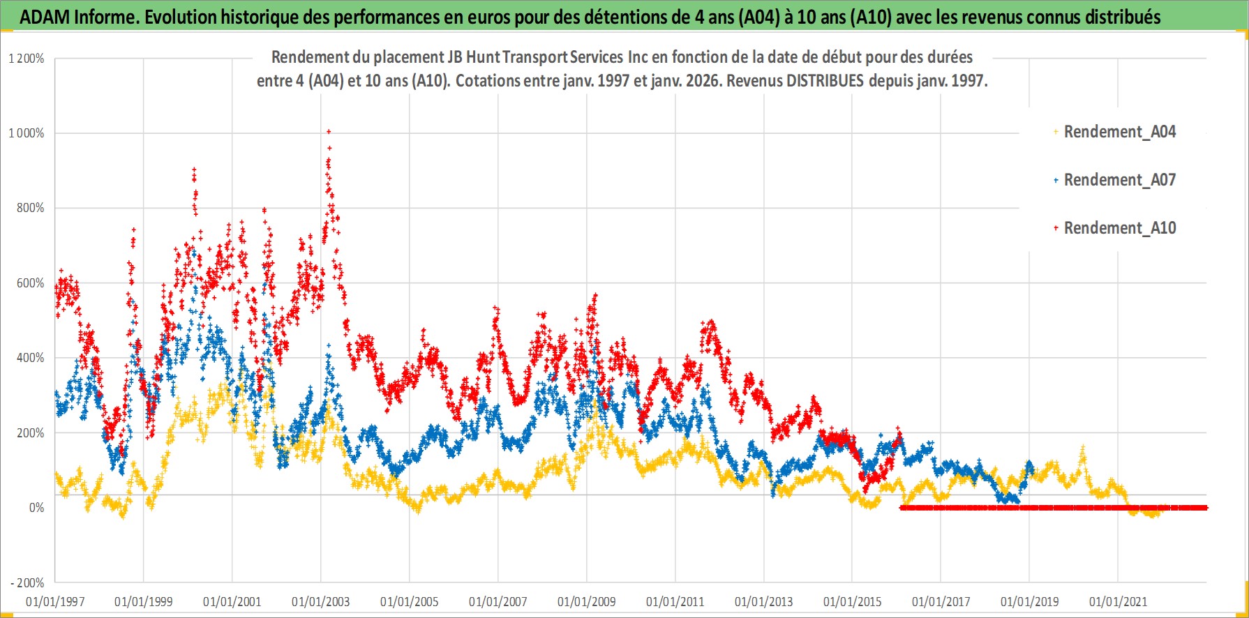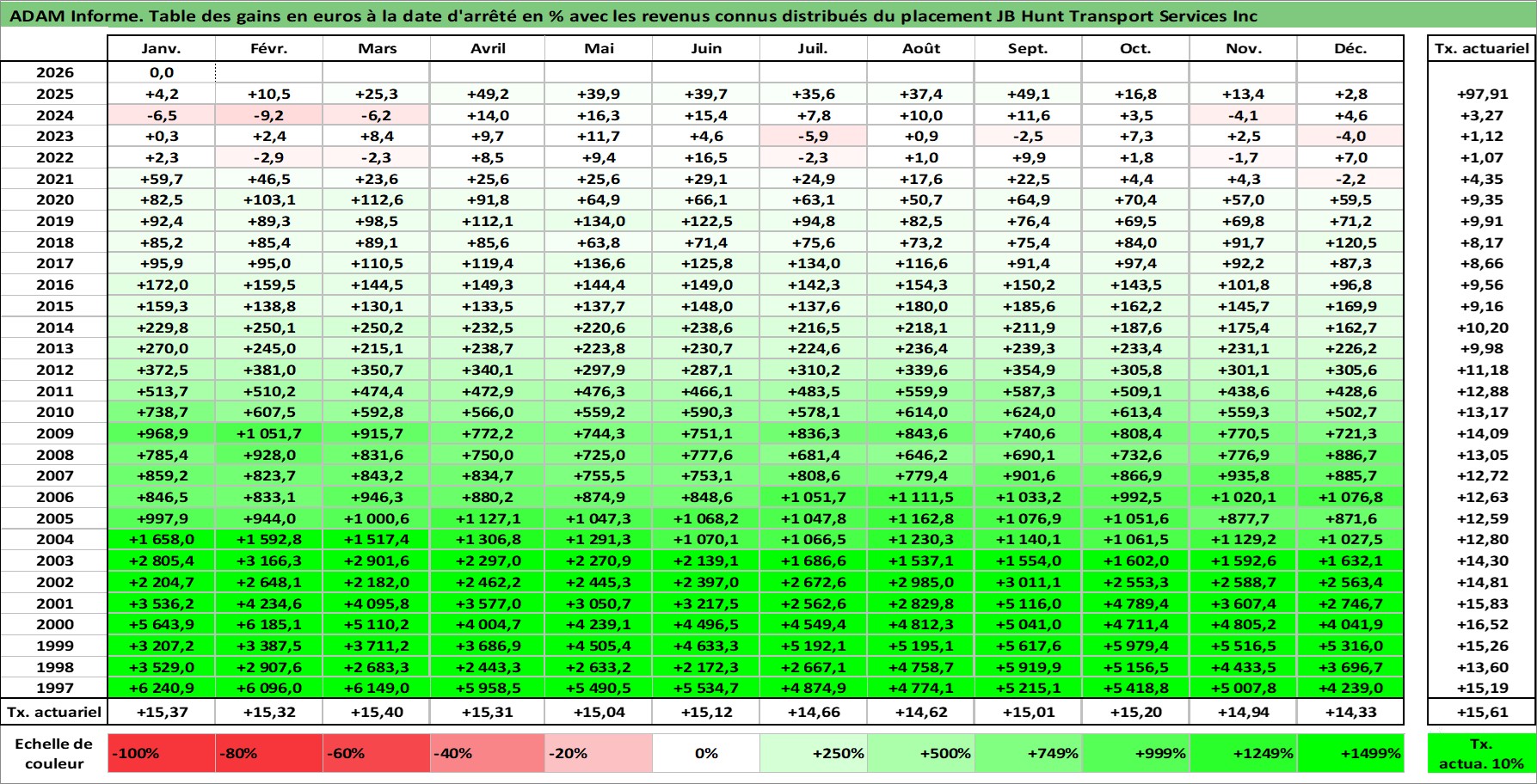 Site dédié aux investisseursPage dédiée sur site financeAnalyse des valorisations hebdomadaires de l'action JB Hunt Transport Services Inc. Cet actif est cote en USD. Les valorisations sont en contrevaleur EURO et couvrent les semaines 1997W01 a 2026W05. Les revenus de cet actif financier sont pris en compte depuis la semaine 1997W05. La note globale ESG de cet actif est estimee a 14.0 (apres rebasage entre 0 et 20).