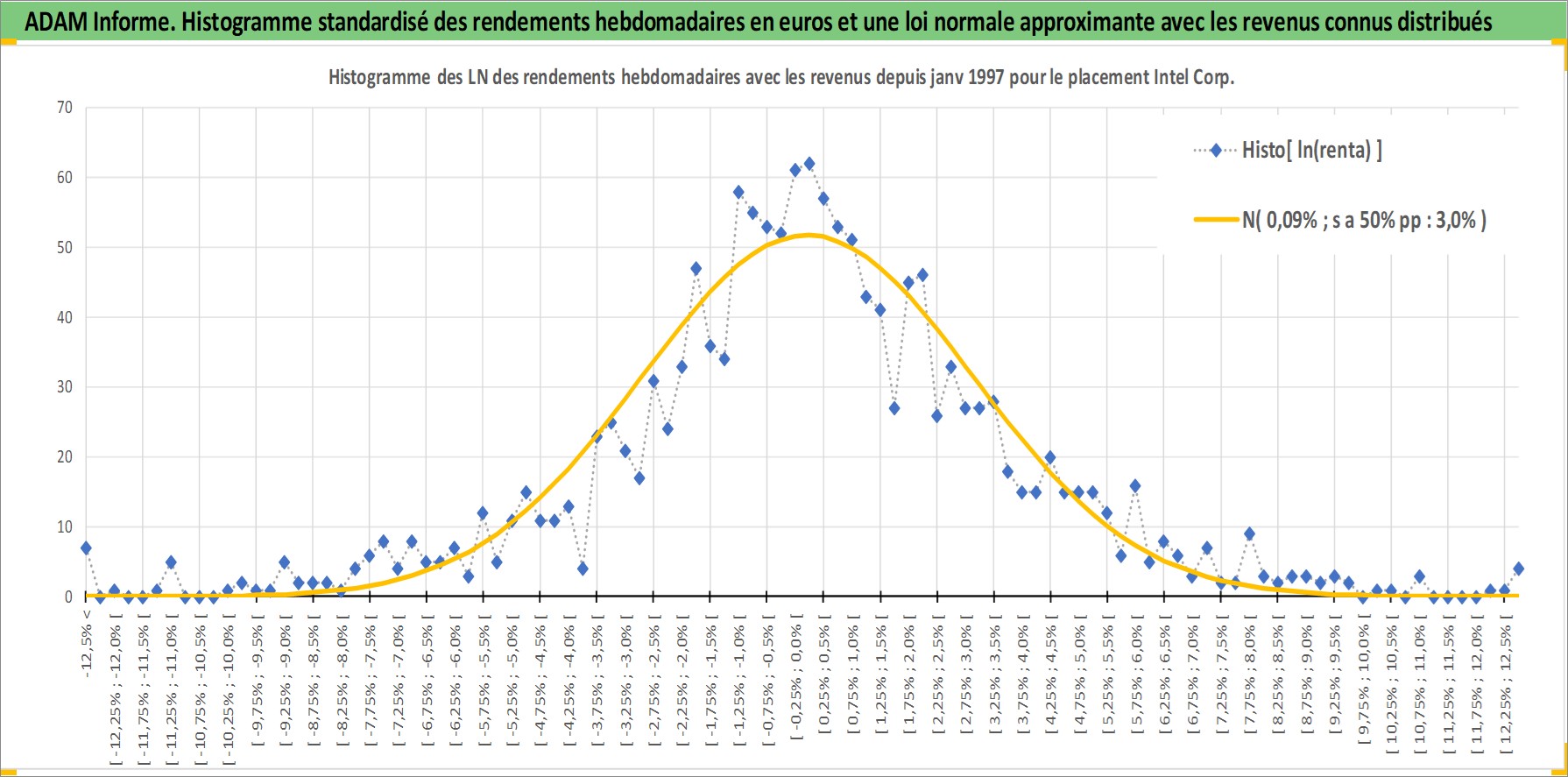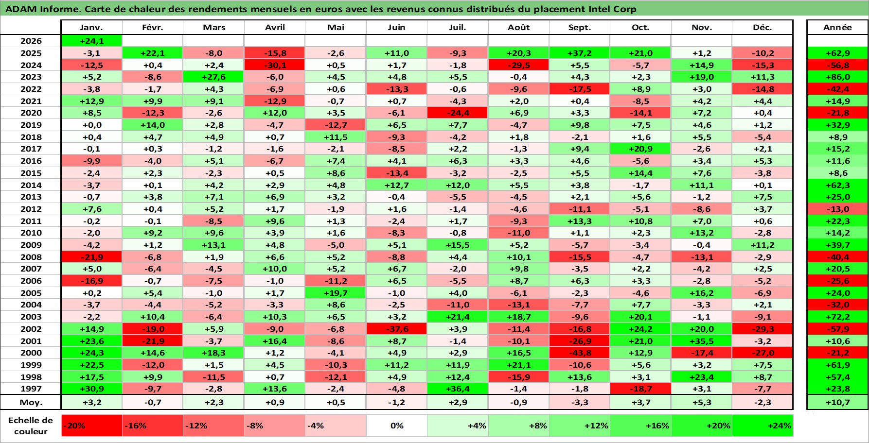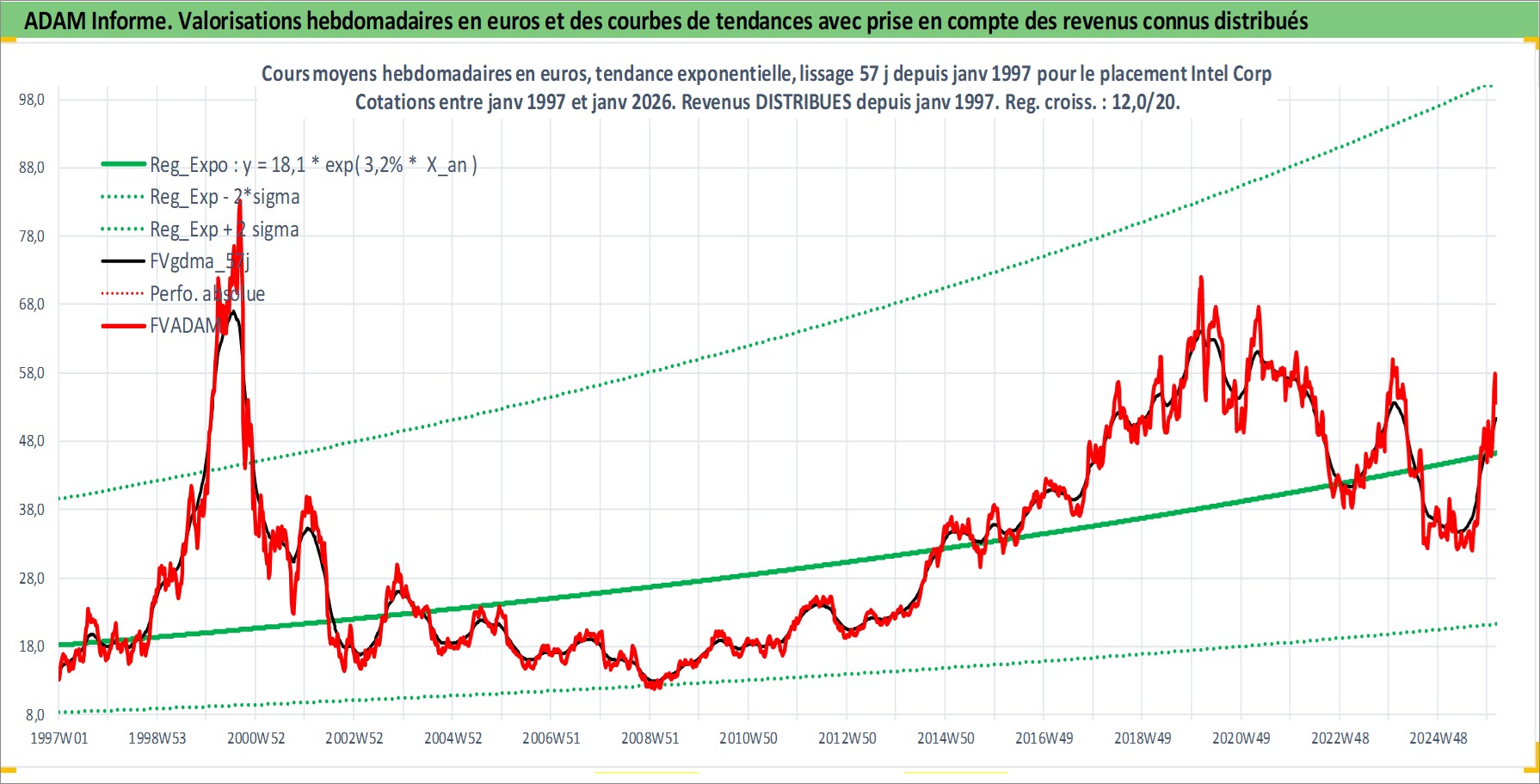 Site dédié aux investisseursPage dédiée sur site financeAnalyse des valorisations hebdomadaires de l'action Intel Corp. Cet actif est cote en USD. Les valorisations sont en contrevaleur EURO et couvrent les semaines 1997W01 a 2026W05. Les revenus de cet actif financier sont pris en compte depuis la semaine 1997W05. La note globale ESG de cet actif est estimee a 12.0 (apres rebasage entre 0 et 20).