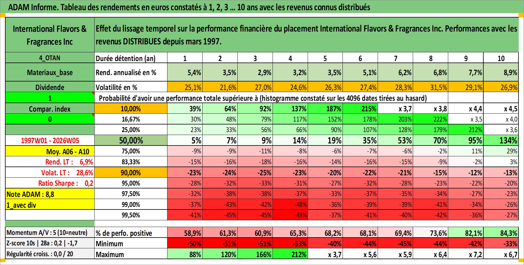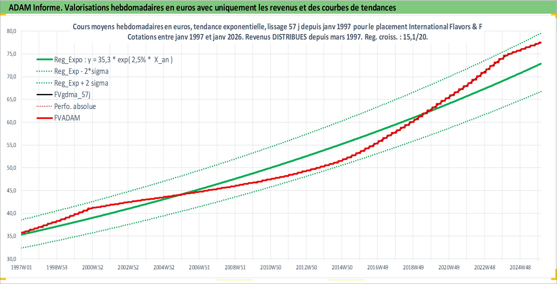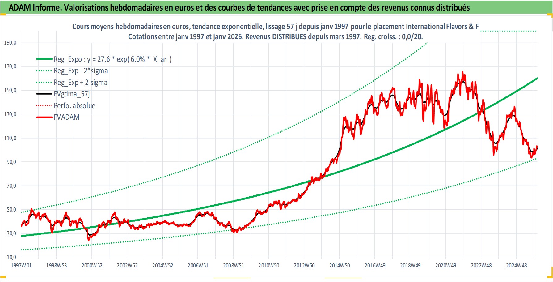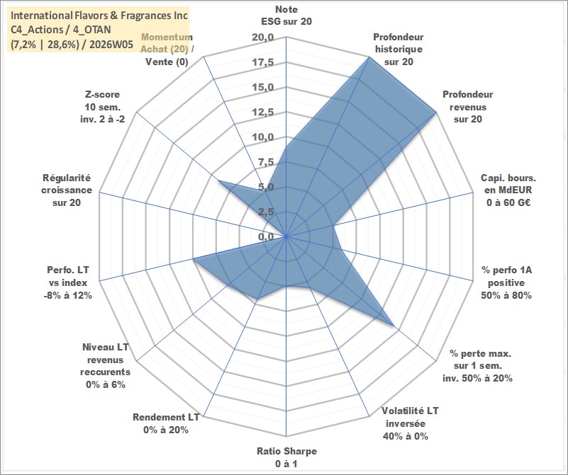 Site dédié aux investisseursPage dédiée sur site financeAnalyse des valorisations hebdomadaires de l'action International Flavors & Fragrances Inc. Cet actif est cote en USD. Les valorisations sont en contrevaleur EURO et couvrent les semaines 1997W01 a 2026W05. Les revenus de cet actif financier sont pris en compte depuis la semaine 1997W12. La note globale ESG de cet actif est estimee a 9.0 (apres rebasage entre 0 et 20).