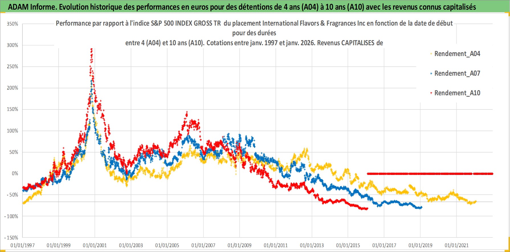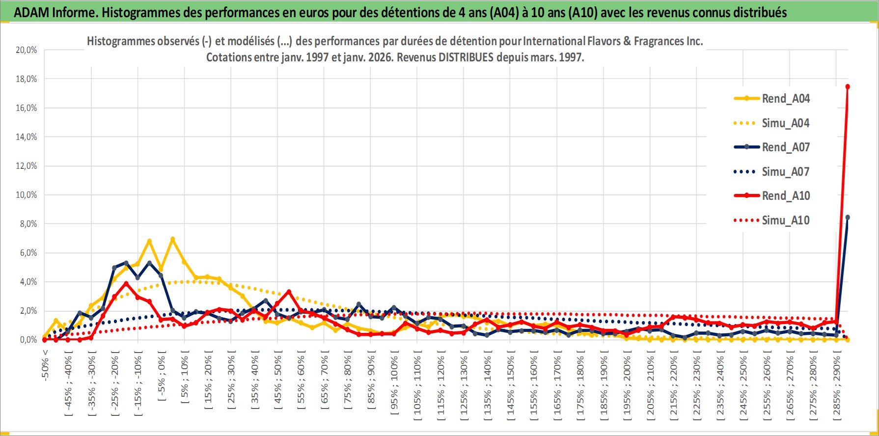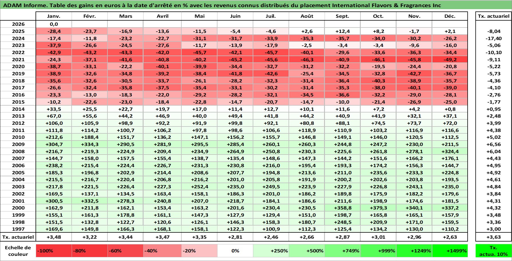 Site dédié aux investisseursPage dédiée sur site financeAnalyse des valorisations hebdomadaires de l'action International Flavors & Fragrances Inc. Cet actif est cote en USD. Les valorisations sont en contrevaleur EURO et couvrent les semaines 1997W01 a 2026W05. Les revenus de cet actif financier sont pris en compte depuis la semaine 1997W12. La note globale ESG de cet actif est estimee a 9.0 (apres rebasage entre 0 et 20).