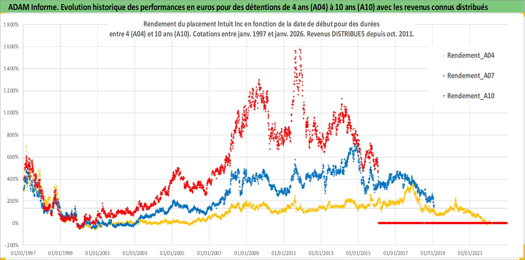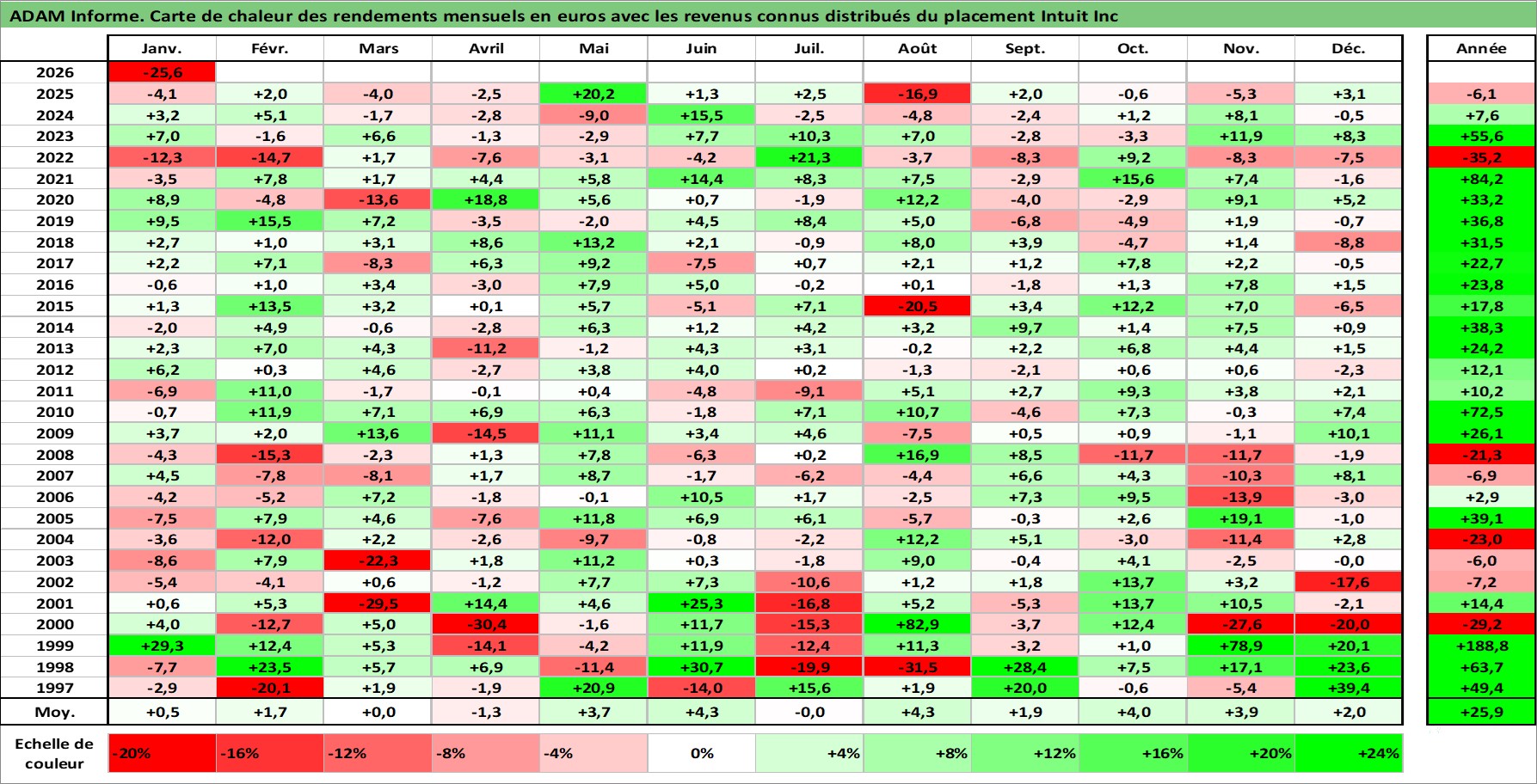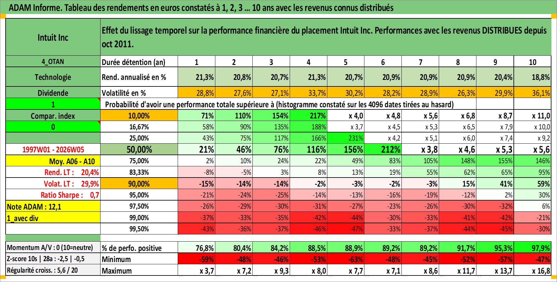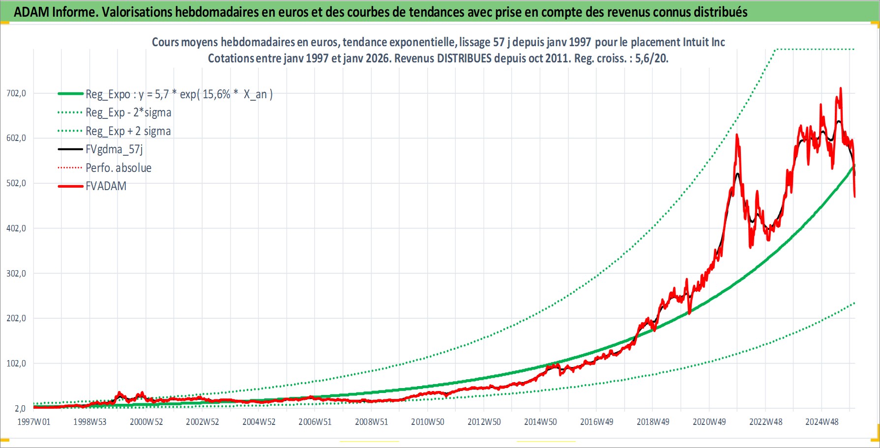 Site dédié aux investisseursPage dédiée sur site financeAnalyse des valorisations hebdomadaires de l'action Intuit Inc. Cet actif est cote en USD. Les valorisations sont en contrevaleur EURO et couvrent les semaines 1997W01 a 2026W05. Les revenus de cet actif financier sont pris en compte depuis la semaine 2011W40. La note globale ESG de cet actif est estimee a 13.0 (apres rebasage entre 0 et 20).