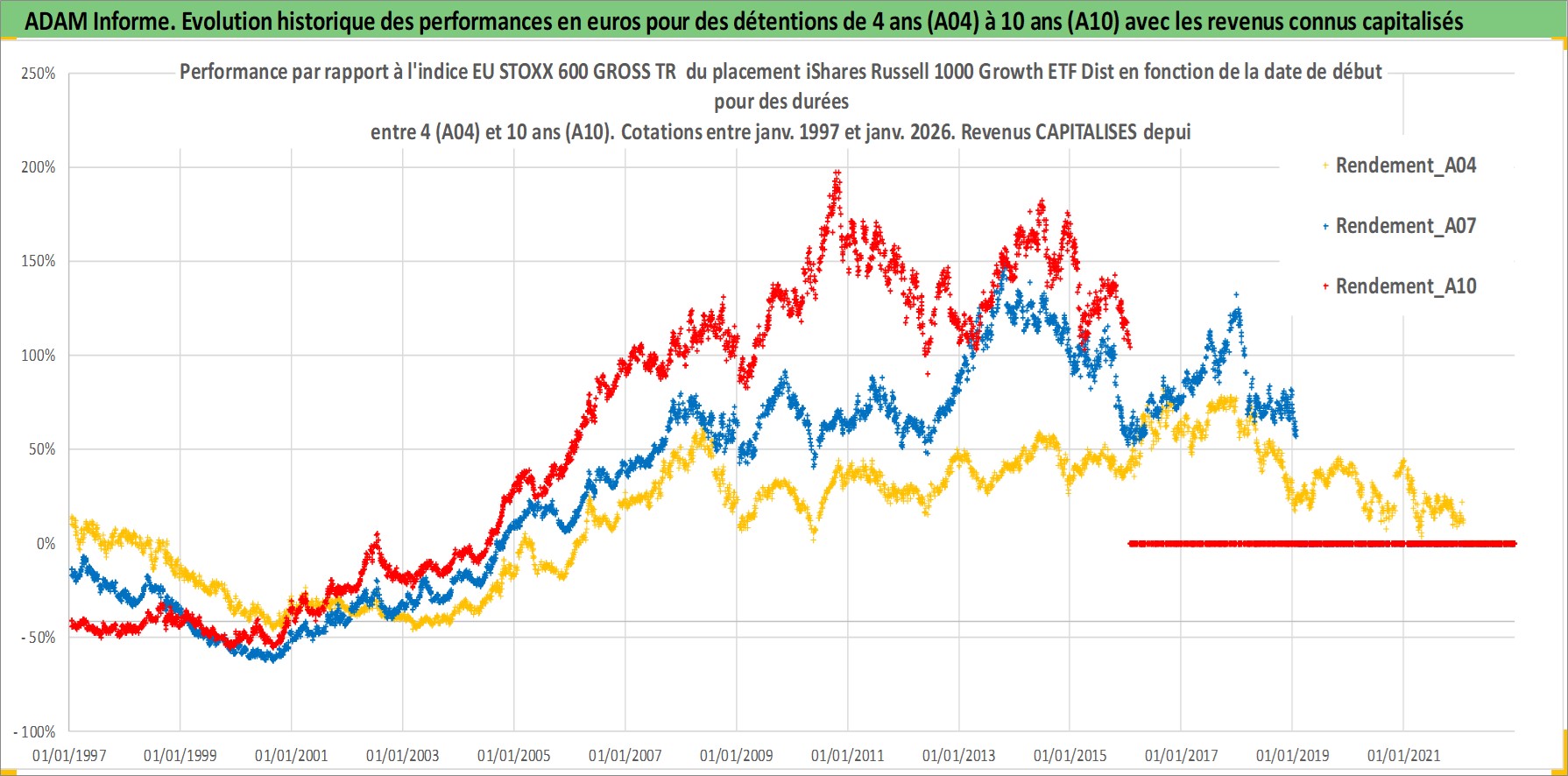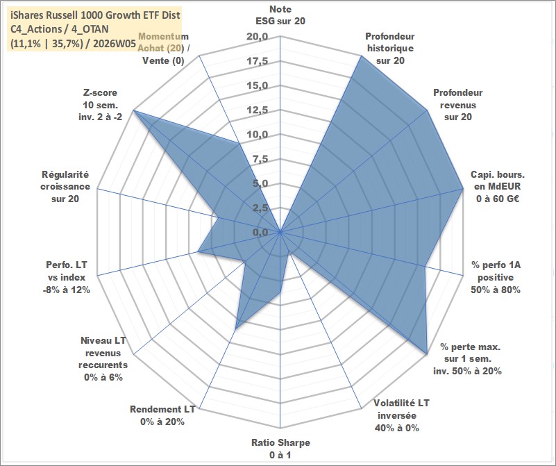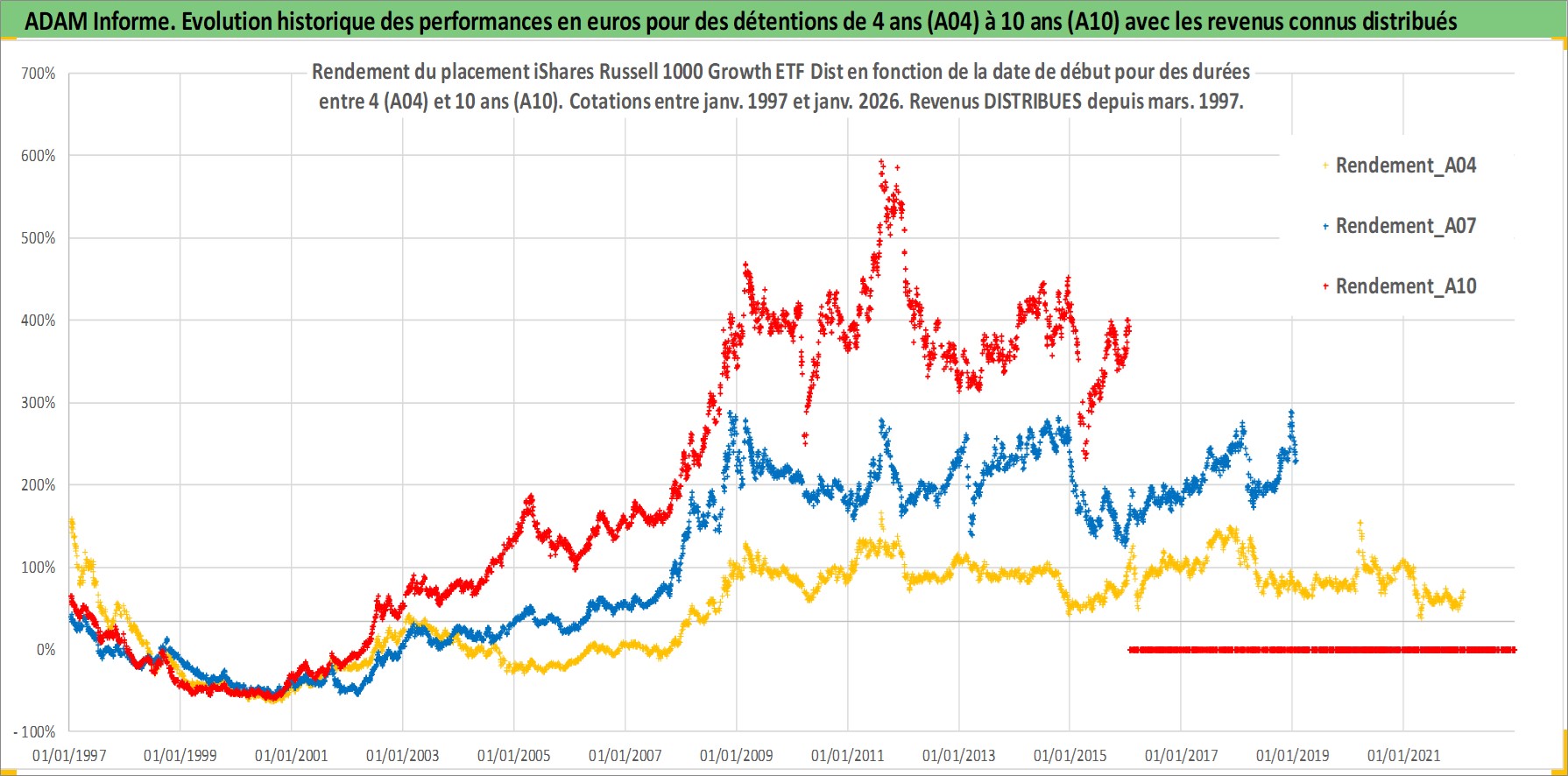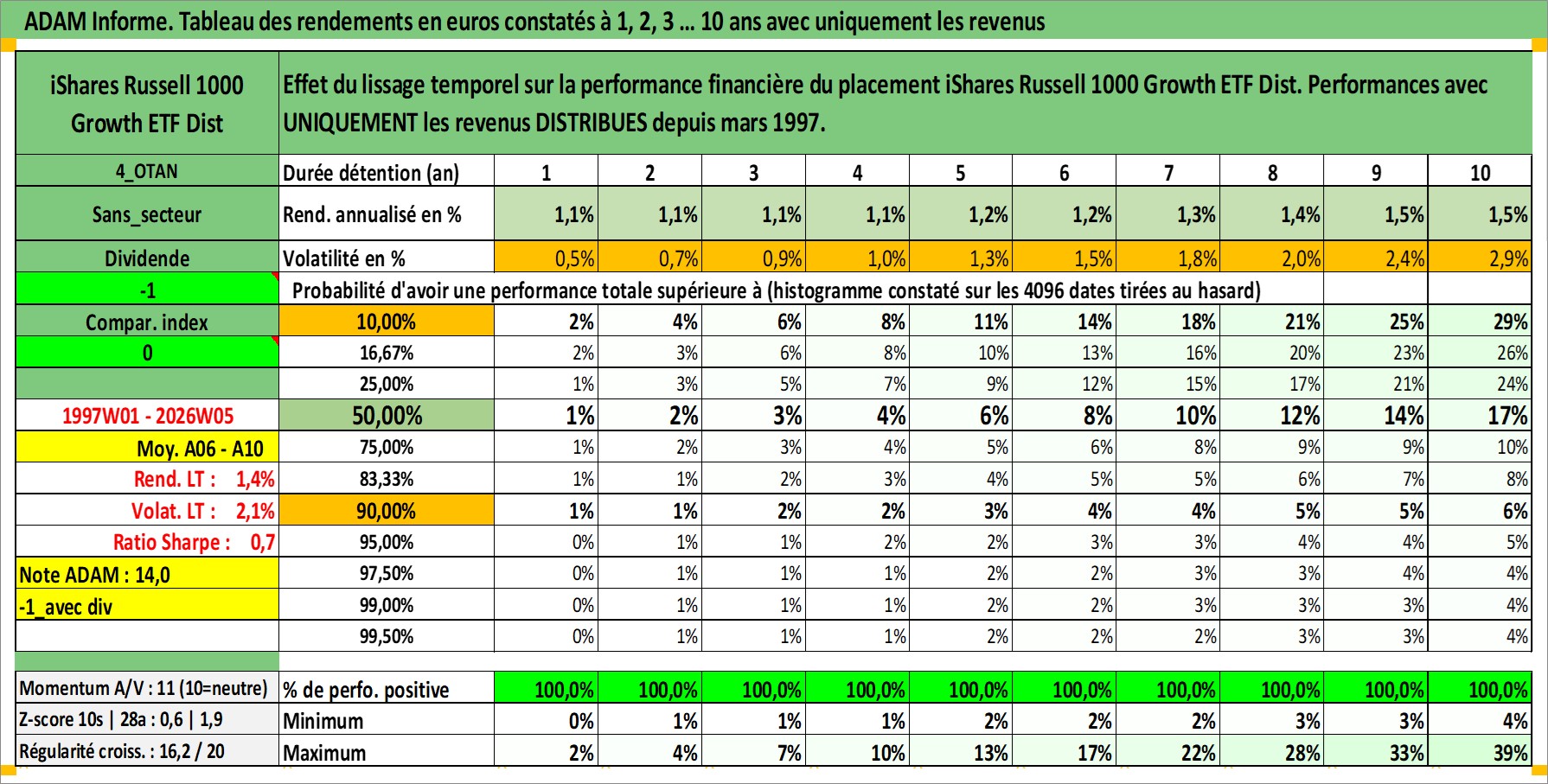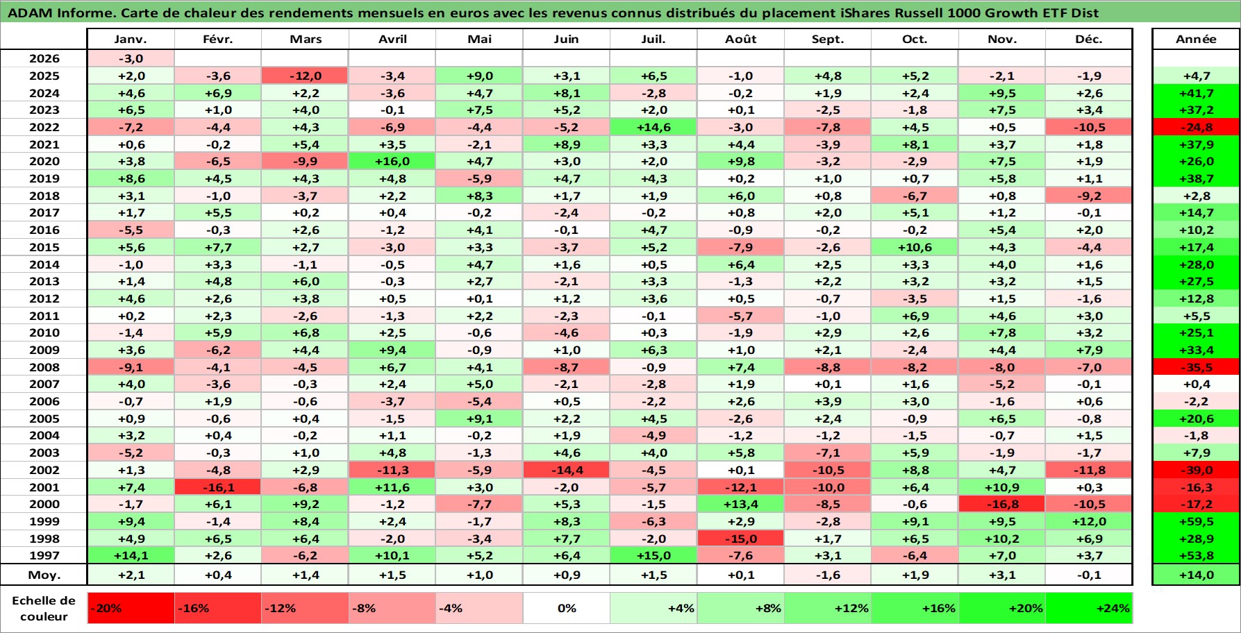 Site dédié aux investisseursPage dédiée sur site financeAnalyse des valorisations hebdomadaires du fonds iShares Russell 1000 Growth ETF Dist. Cet actif est cote en USD. Les valorisations sont en contrevaleur EURO et couvrent les semaines 1997W01 a 2026W05. Les revenus de cet actif financier sont pris en compte depuis la semaine 1997W13. La note ESG de cet actif n'est pas connue.