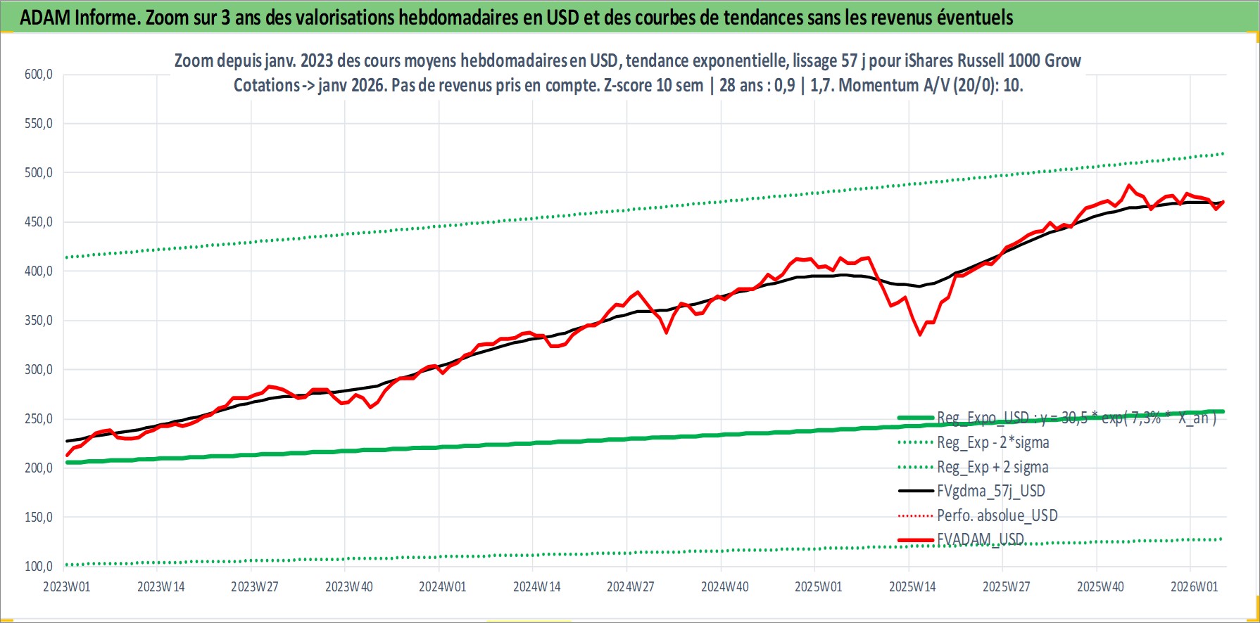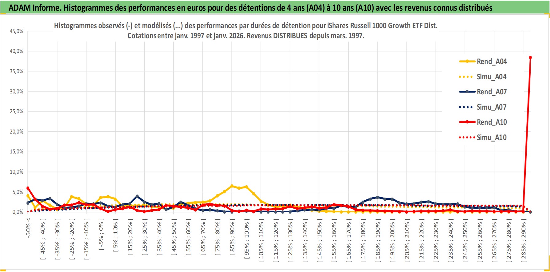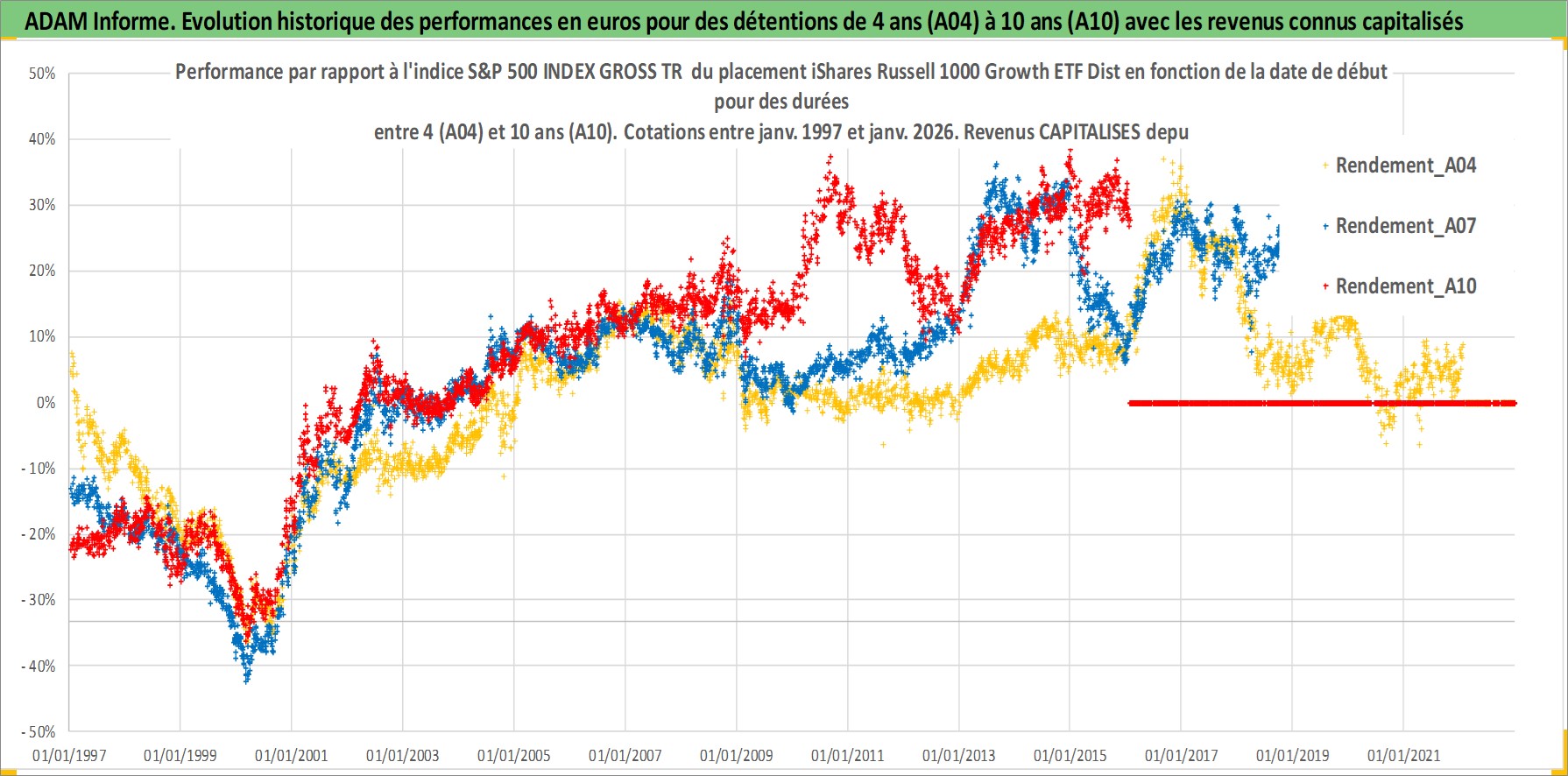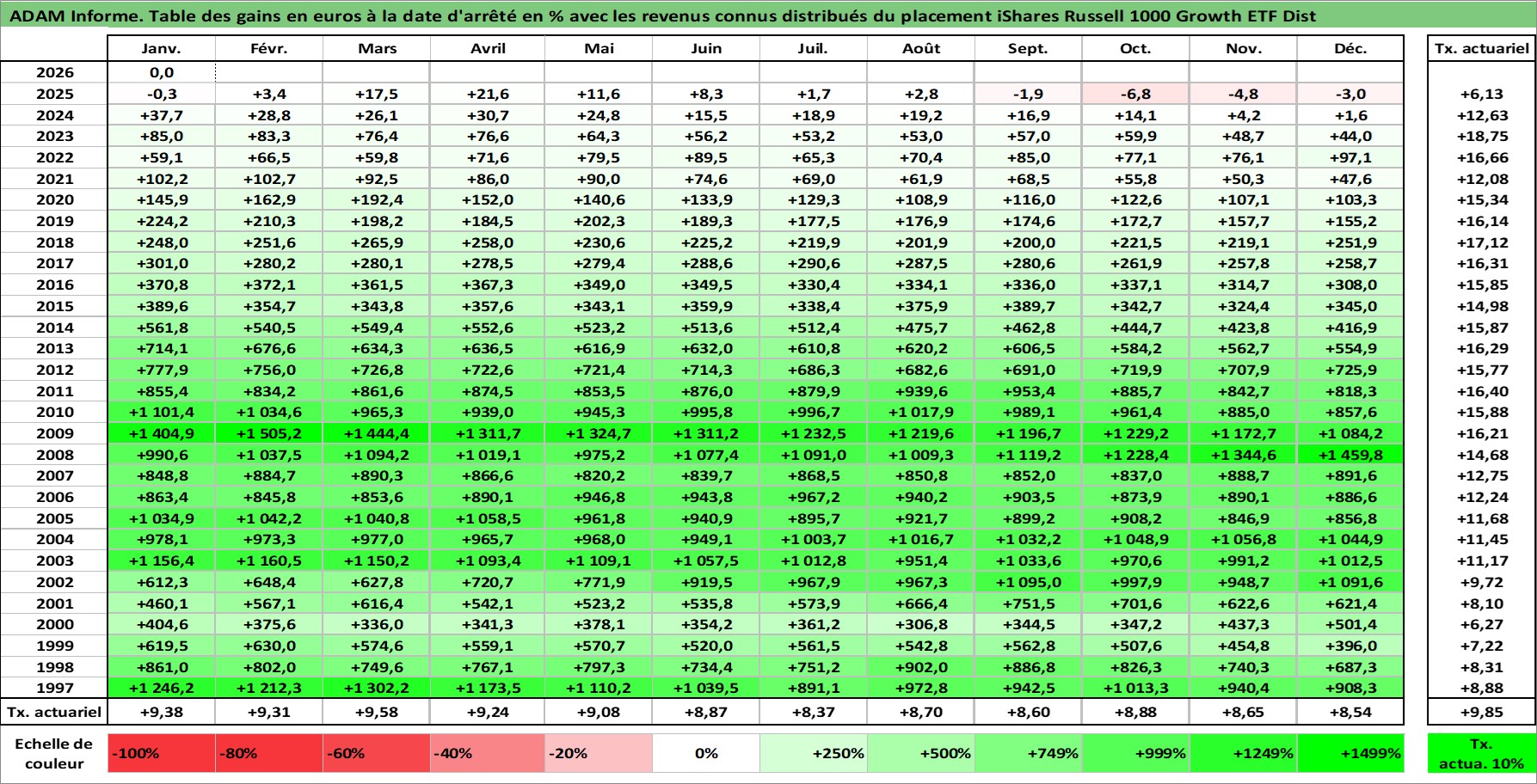 Site dédié aux investisseursPage dédiée sur site financeAnalyse des valorisations hebdomadaires du fonds iShares Russell 1000 Growth ETF Dist. Cet actif est cote en USD. Les valorisations sont en contrevaleur EURO et couvrent les semaines 1997W01 a 2026W05. Les revenus de cet actif financier sont pris en compte depuis la semaine 1997W13. La note ESG de cet actif n'est pas connue.