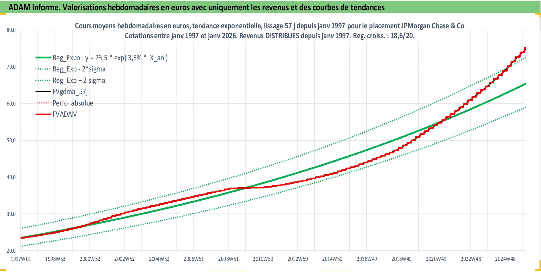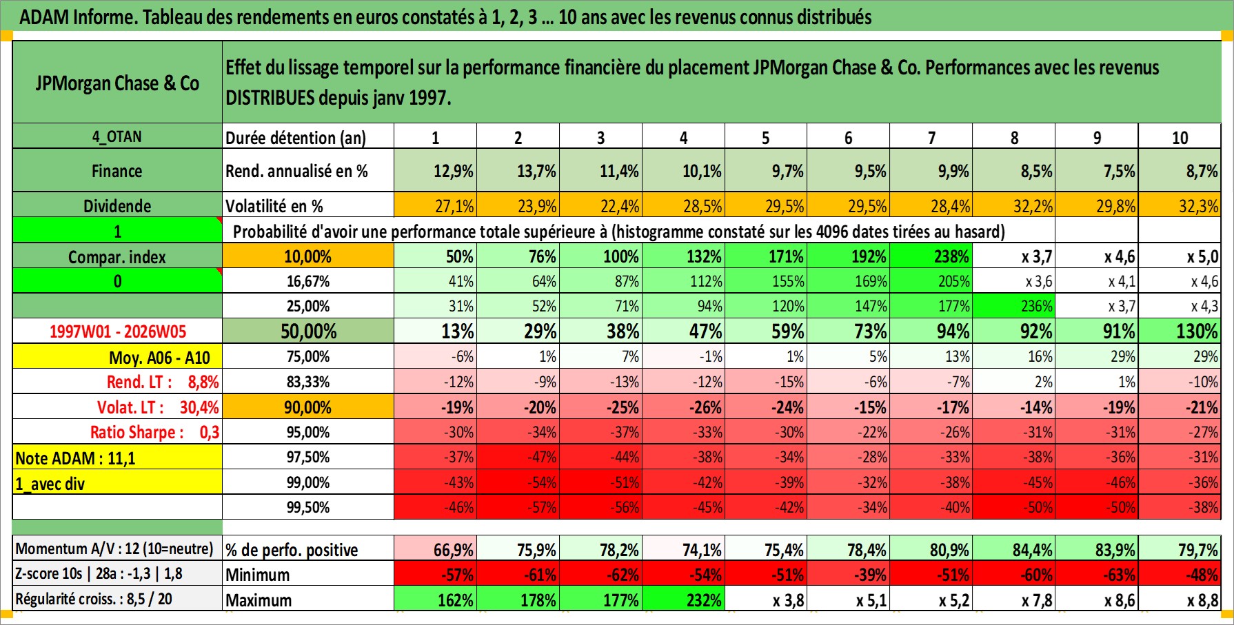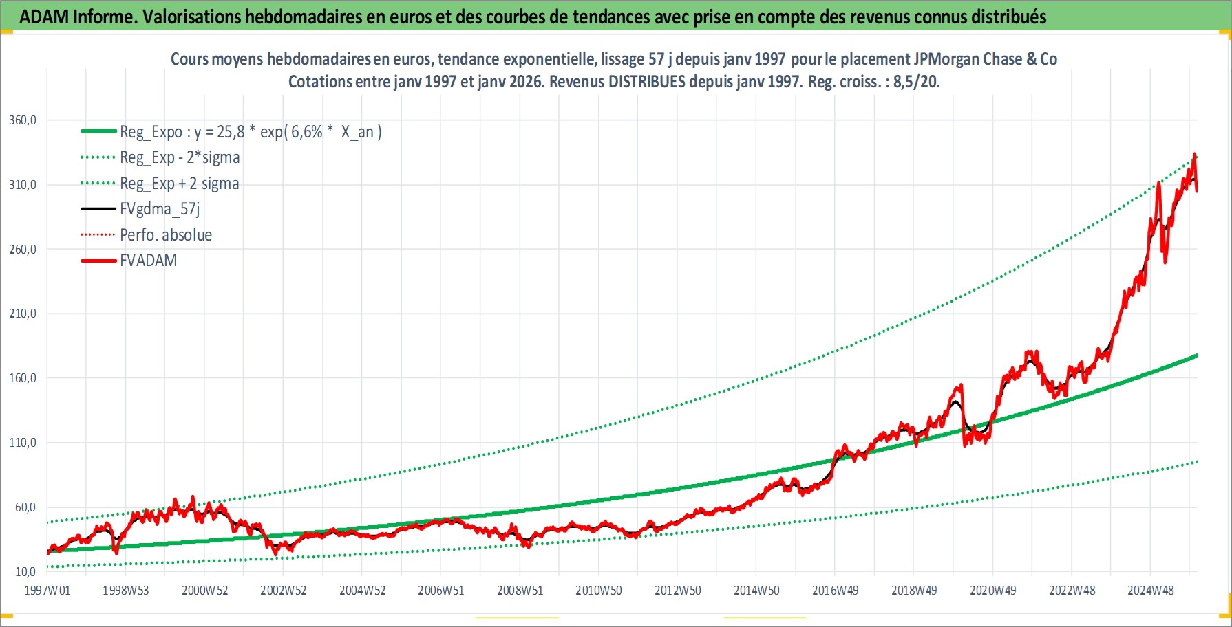 Site dédié aux investisseursPage dédiée sur site financeAnalyse des valorisations hebdomadaires de l'action JPMorgan Chase & Co. Cet actif est cote en USD. Les valorisations sont en contrevaleur EURO et couvrent les semaines 1997W01 a 2026W05. Les revenus de cet actif financier sont pris en compte depuis la semaine 1997W01. La note globale ESG de cet actif est estimee a 6.0 (apres rebasage entre 0 et 20).