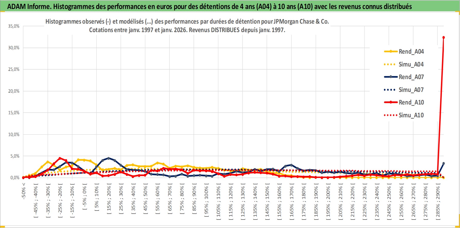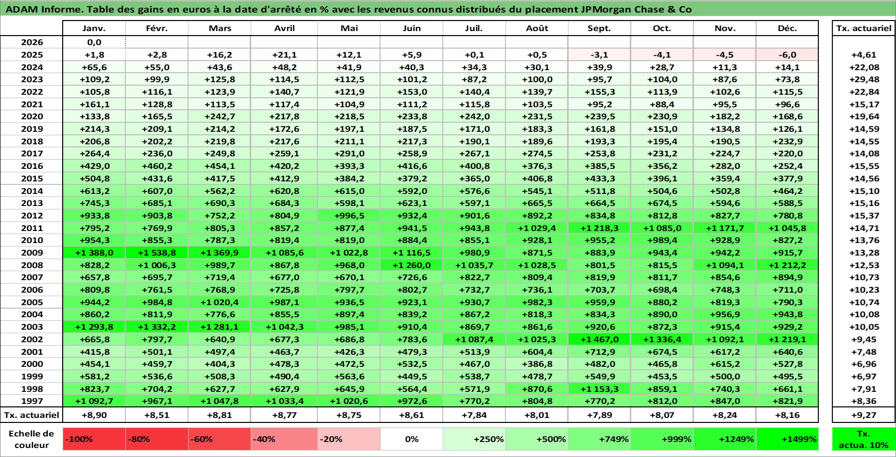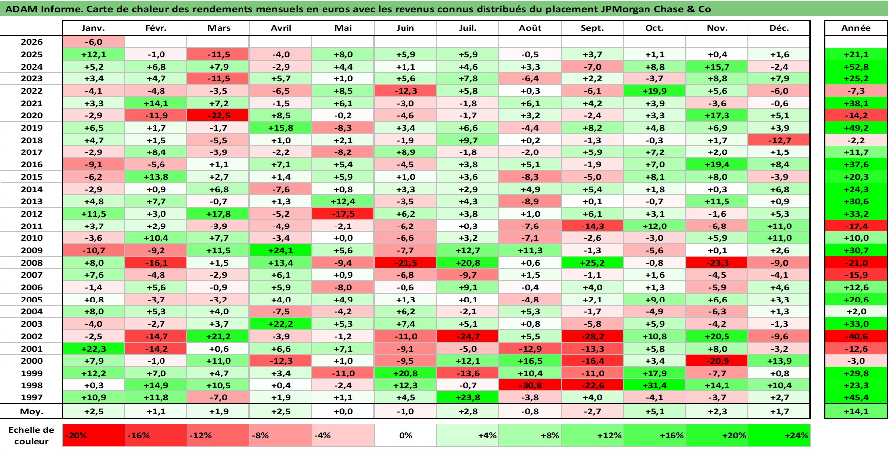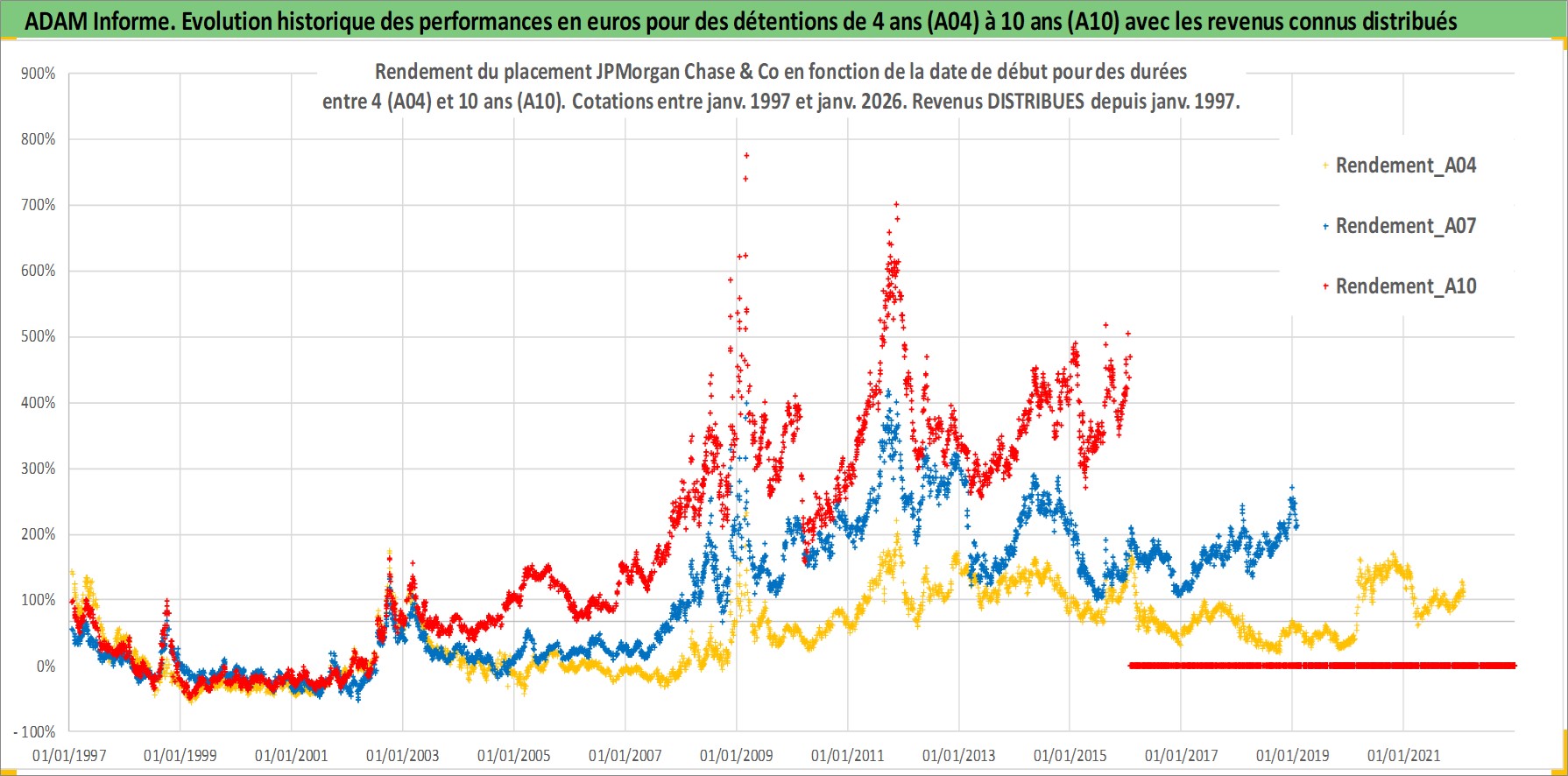 Site dédié aux investisseursPage dédiée sur site financeAnalyse des valorisations hebdomadaires de l'action JPMorgan Chase & Co. Cet actif est cote en USD. Les valorisations sont en contrevaleur EURO et couvrent les semaines 1997W01 a 2026W05. Les revenus de cet actif financier sont pris en compte depuis la semaine 1997W01. La note globale ESG de cet actif est estimee a 6.0 (apres rebasage entre 0 et 20).