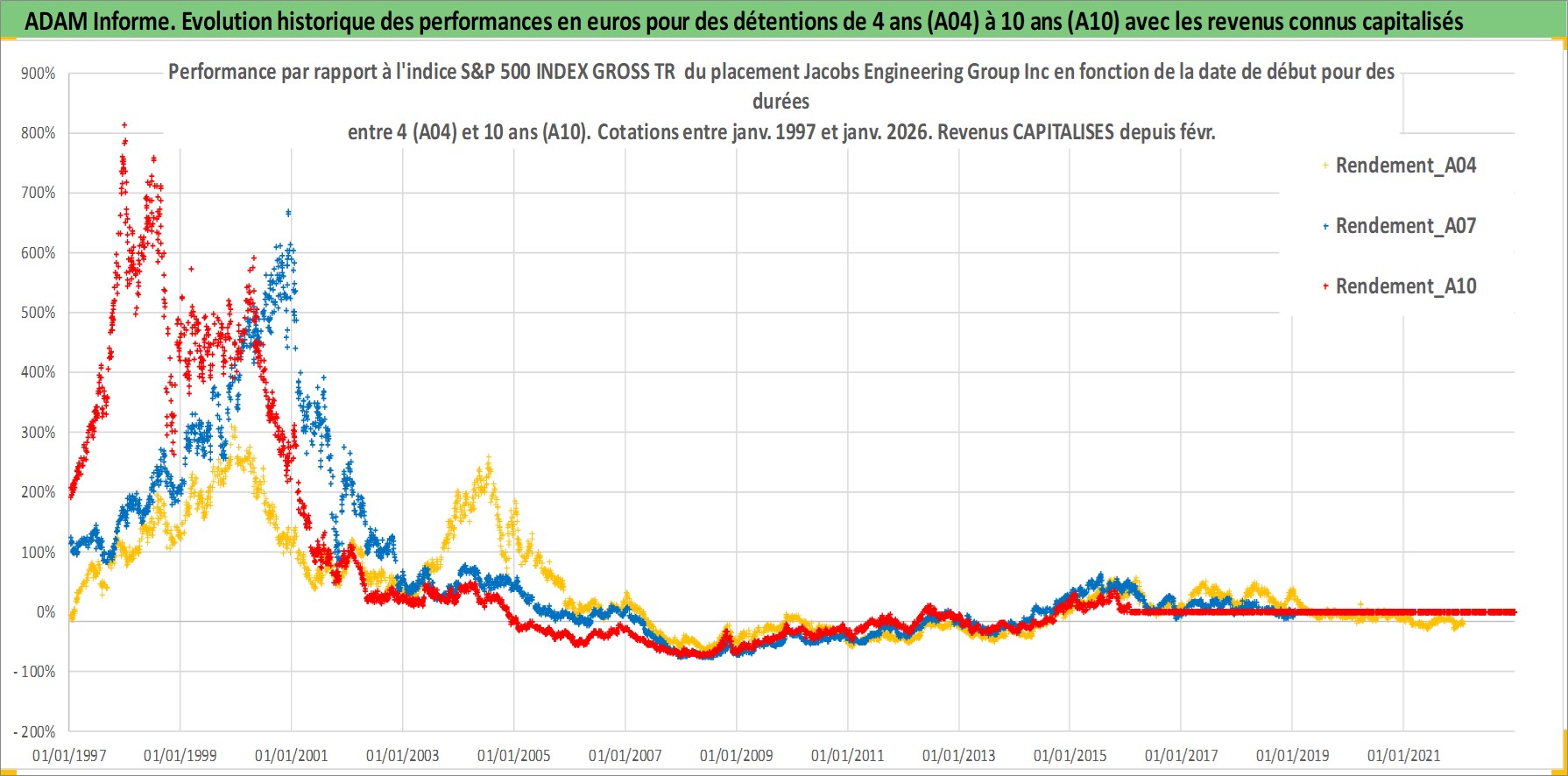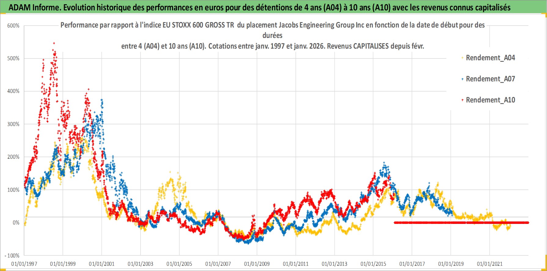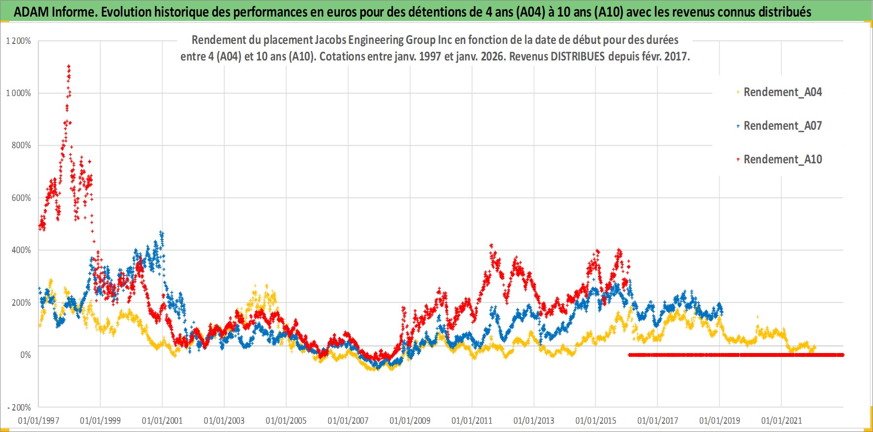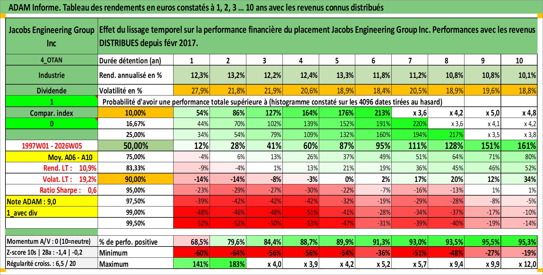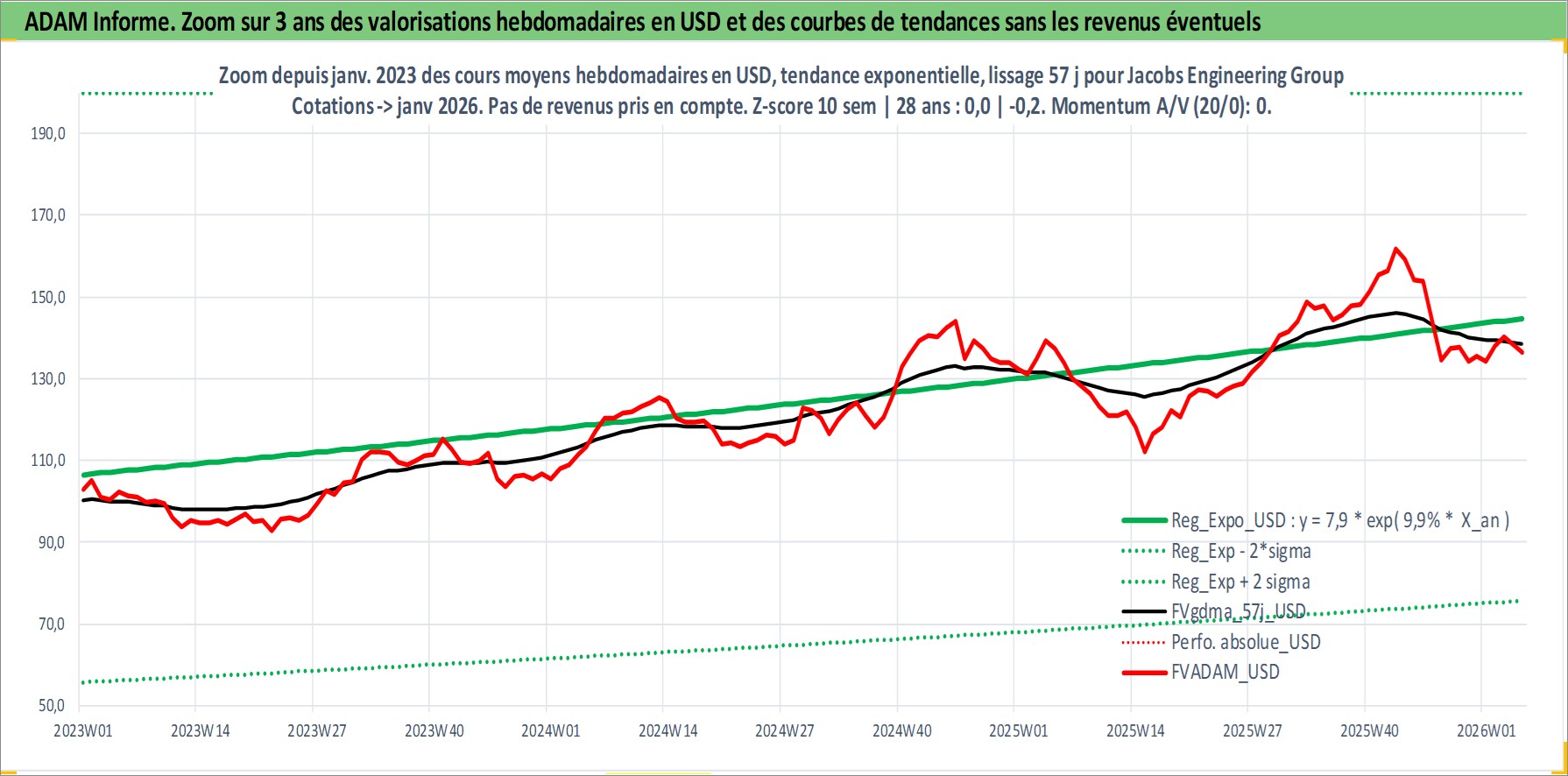 Site dédié aux investisseursPage dédiée sur site financeAnalyse des valorisations hebdomadaires de l'action Jacobs Engineering Group Inc. Cet actif est cote en USD. Les valorisations sont en contrevaleur EURO et couvrent les semaines 1997W01 a 2026W05. Les revenus de cet actif financier sont pris en compte depuis la semaine 2017W07. La note globale ESG de cet actif est estimee a 9.0 (apres rebasage entre 0 et 20).
