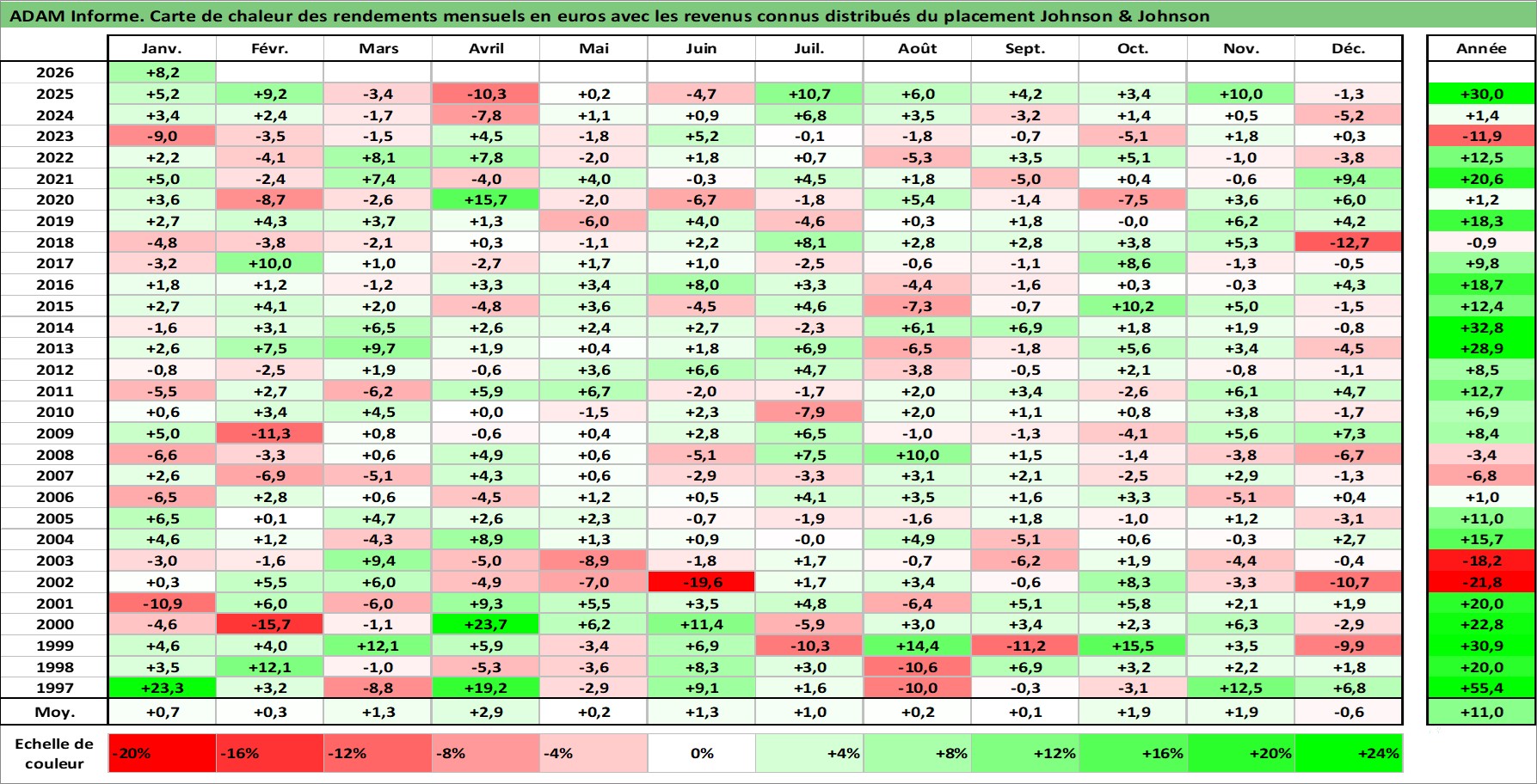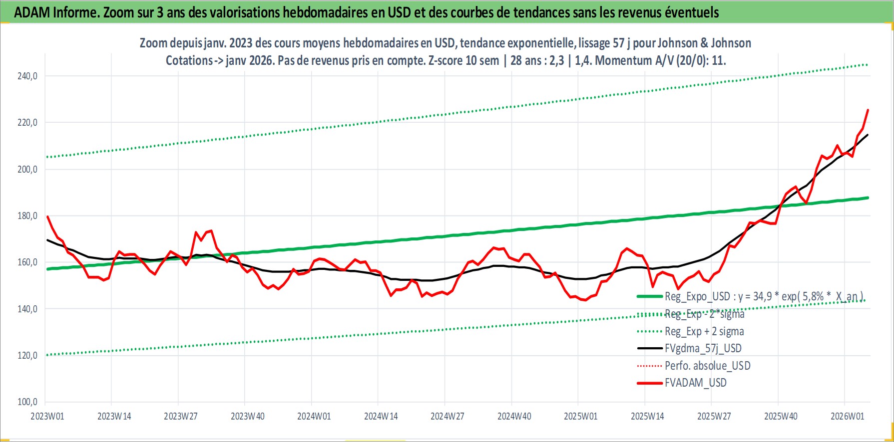 Site dédié aux investisseursPage dédiée sur site financeAnalyse des valorisations hebdomadaires de l'action Johnson & Johnson. Cet actif est cote en USD. Les valorisations sont en contrevaleur EURO et couvrent les semaines 1997W01 a 2026W05. Les revenus de cet actif financier sont pris en compte depuis la semaine 1997W07. La note globale ESG de cet actif est estimee a 7.0 (apres rebasage entre 0 et 20).