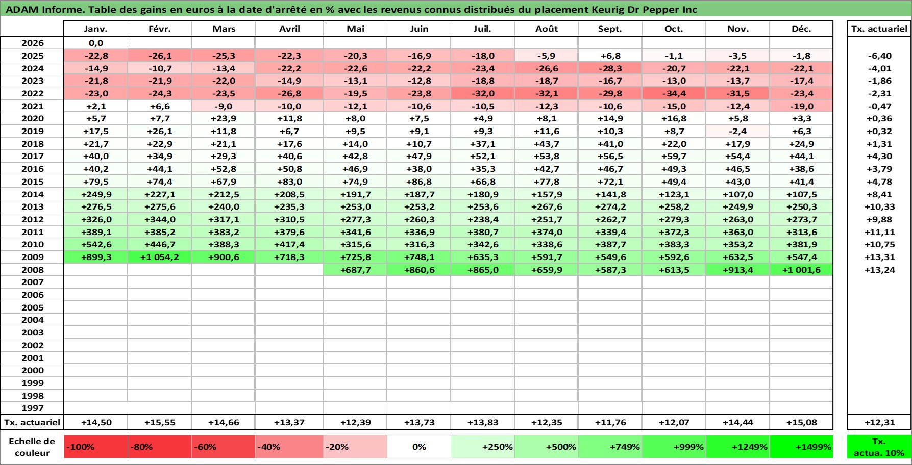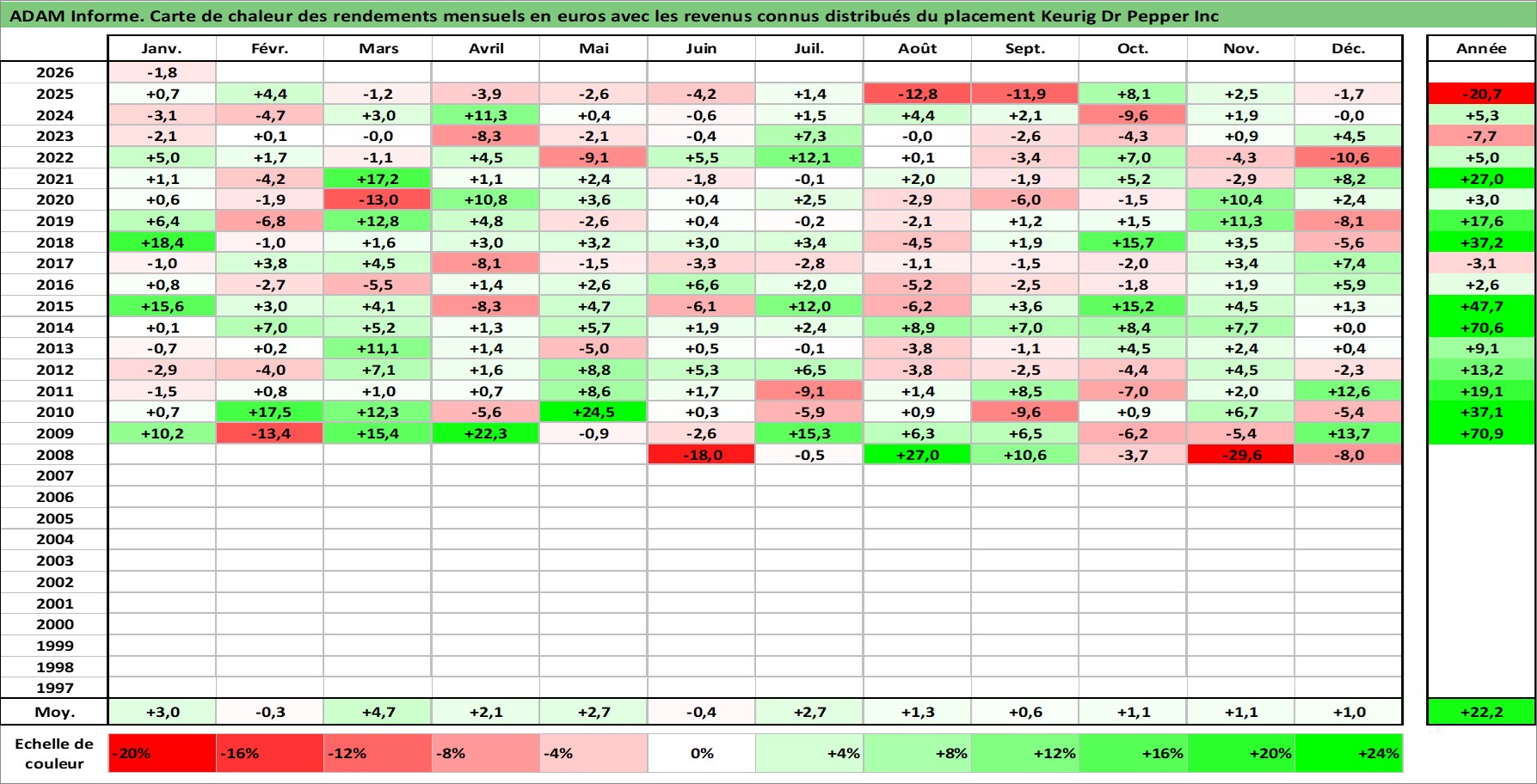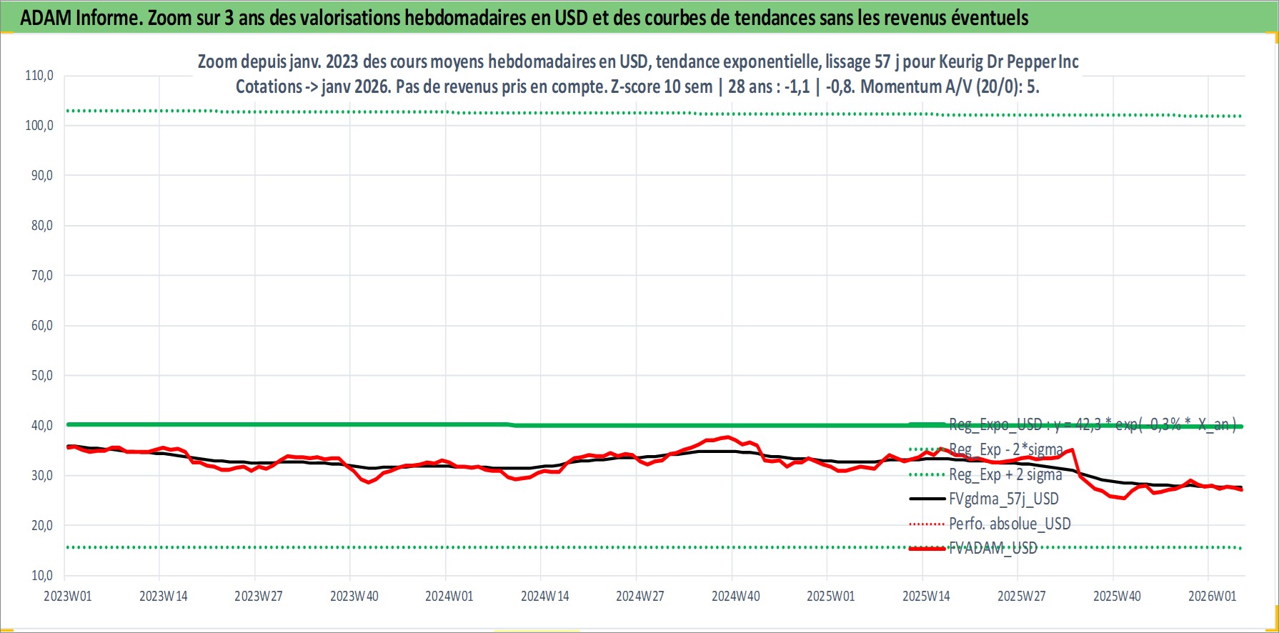 Site dédié aux investisseursPage dédiée sur site financeAnalyse des valorisations hebdomadaires de l'action Keurig Dr Pepper Inc. Cet actif est cote en USD. Les valorisations sont en contrevaleur EURO et couvrent les semaines 2008W19 a 2026W05. Les revenus de cet actif financier sont pris en compte depuis la semaine 2009W51. La note ESG de cet actif n'est pas connue.