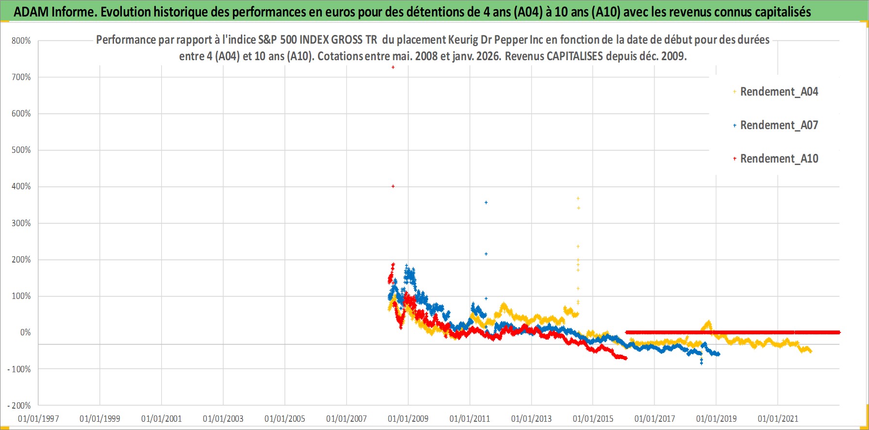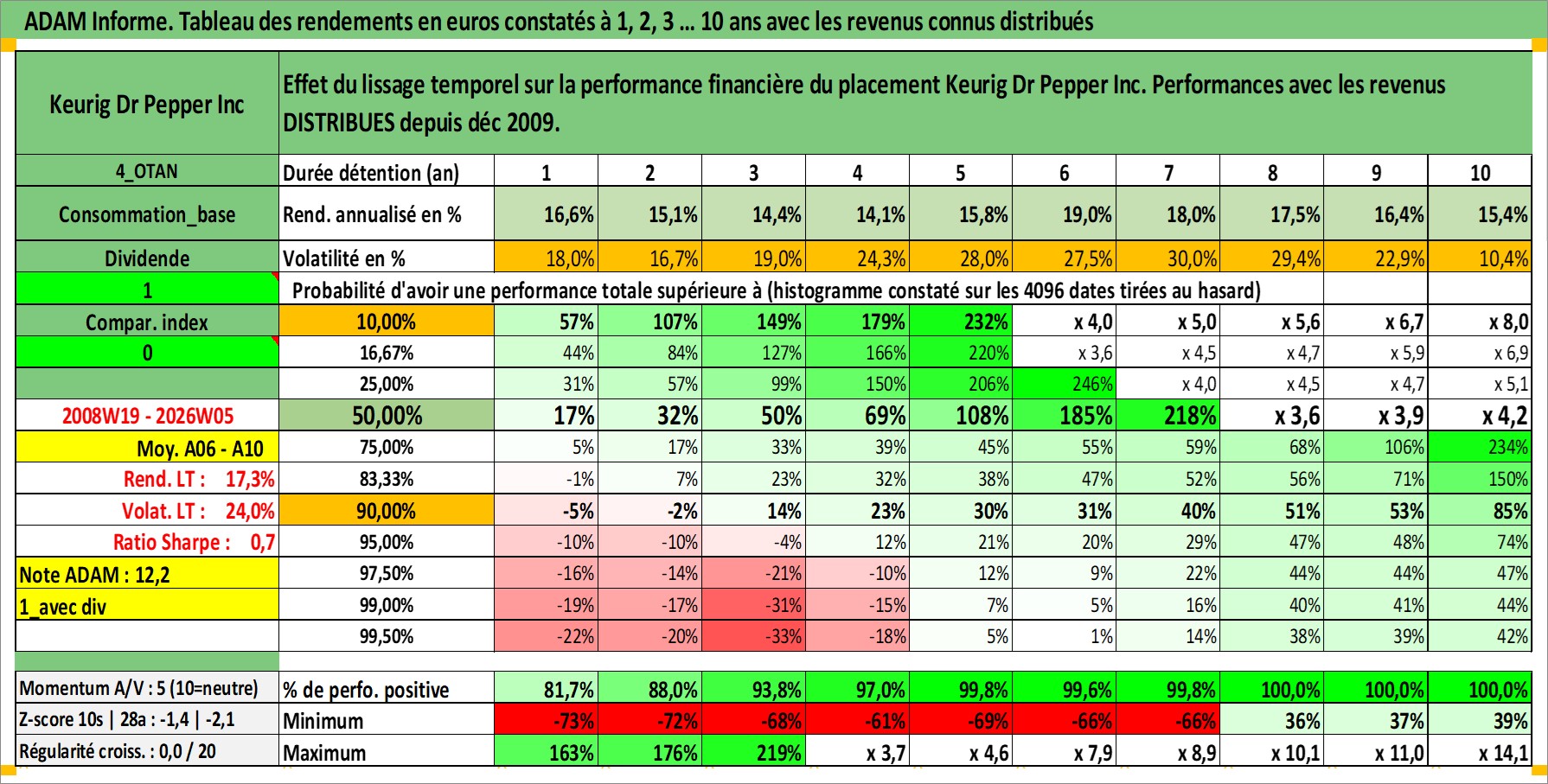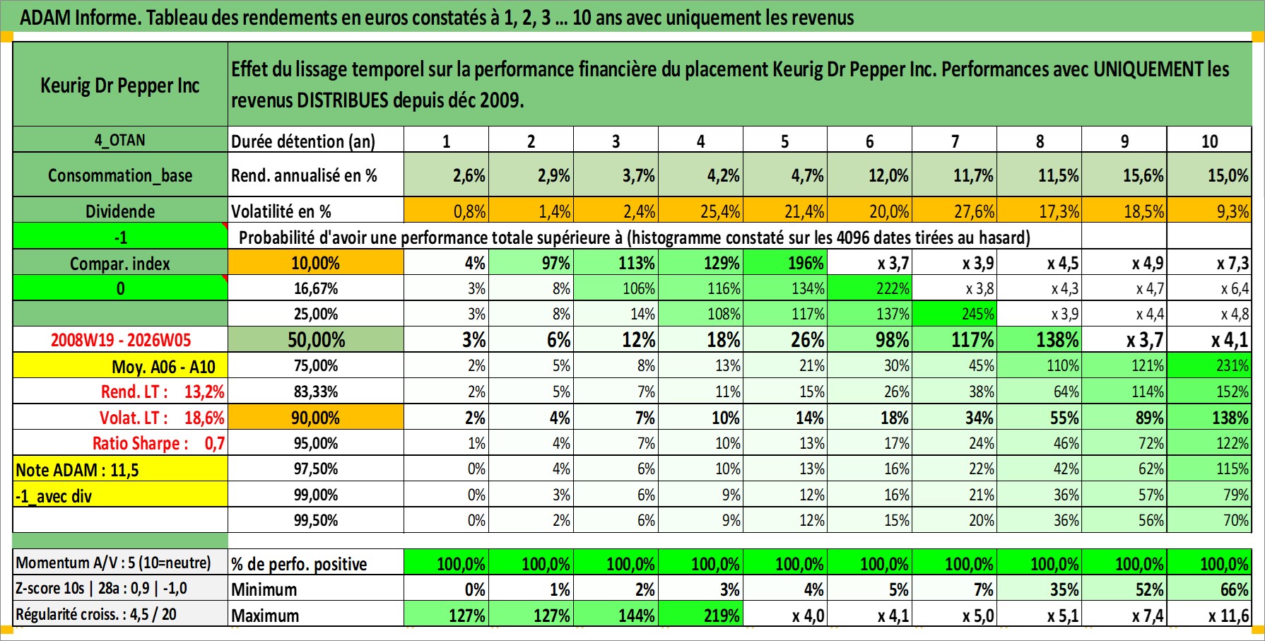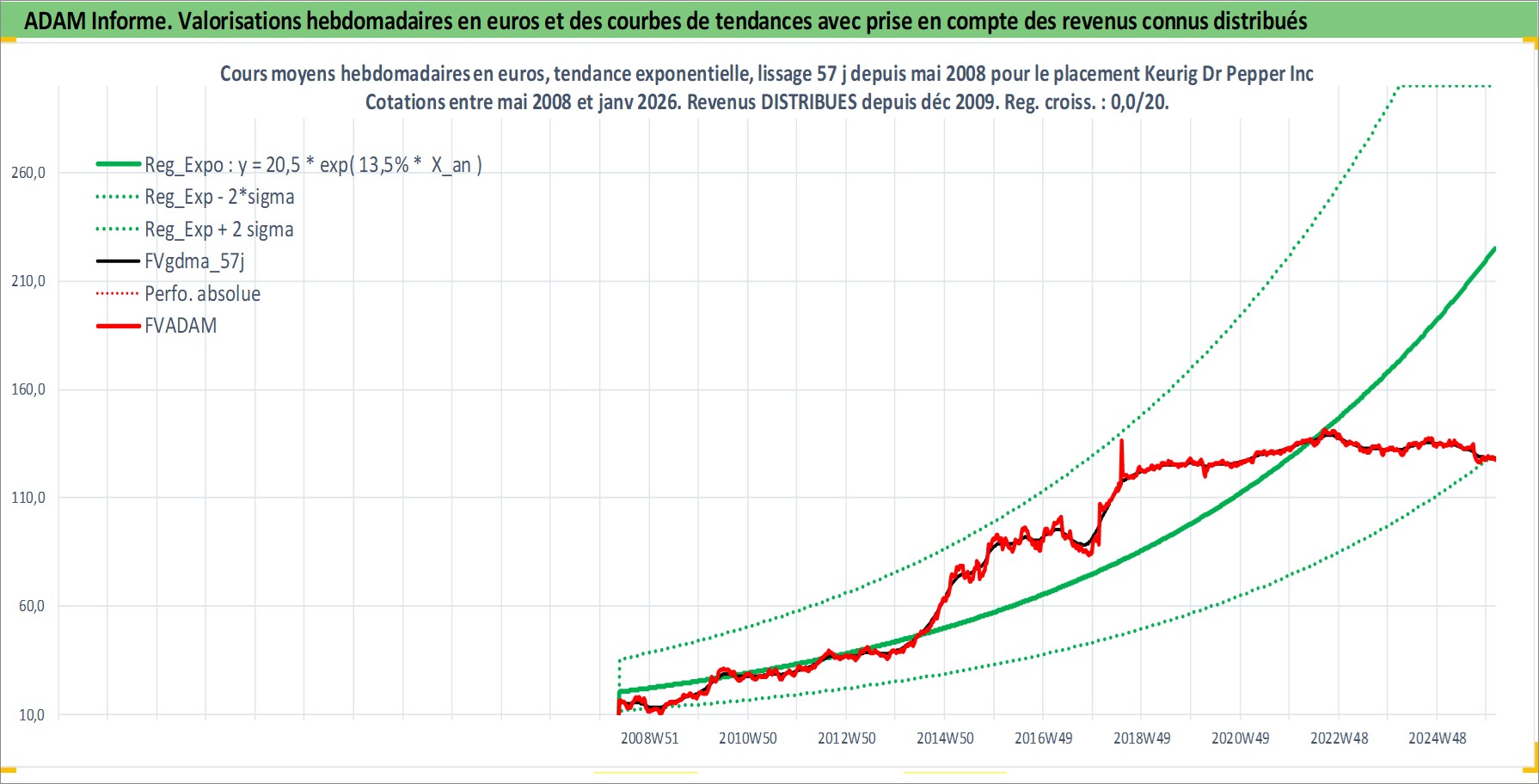 Site dédié aux investisseursPage dédiée sur site financeAnalyse des valorisations hebdomadaires de l'action Keurig Dr Pepper Inc. Cet actif est cote en USD. Les valorisations sont en contrevaleur EURO et couvrent les semaines 2008W19 a 2026W05. Les revenus de cet actif financier sont pris en compte depuis la semaine 2009W51. La note ESG de cet actif n'est pas connue.