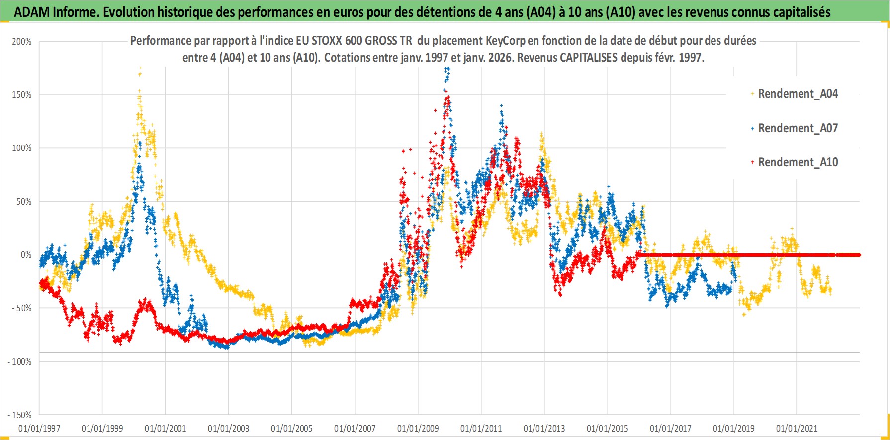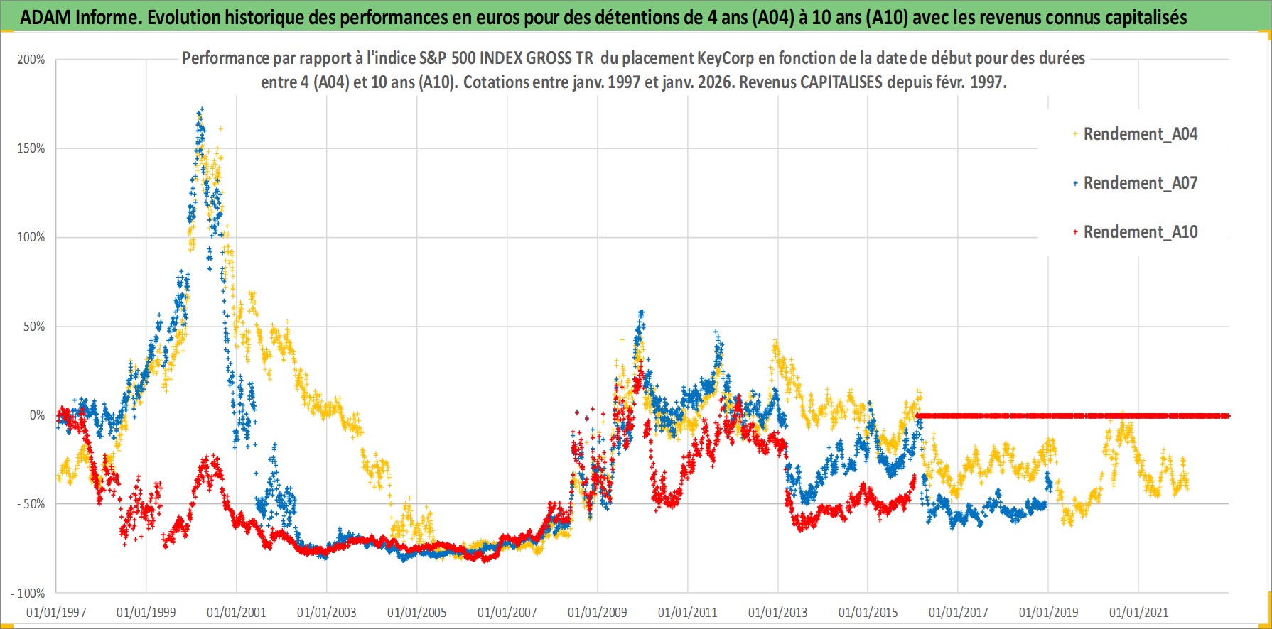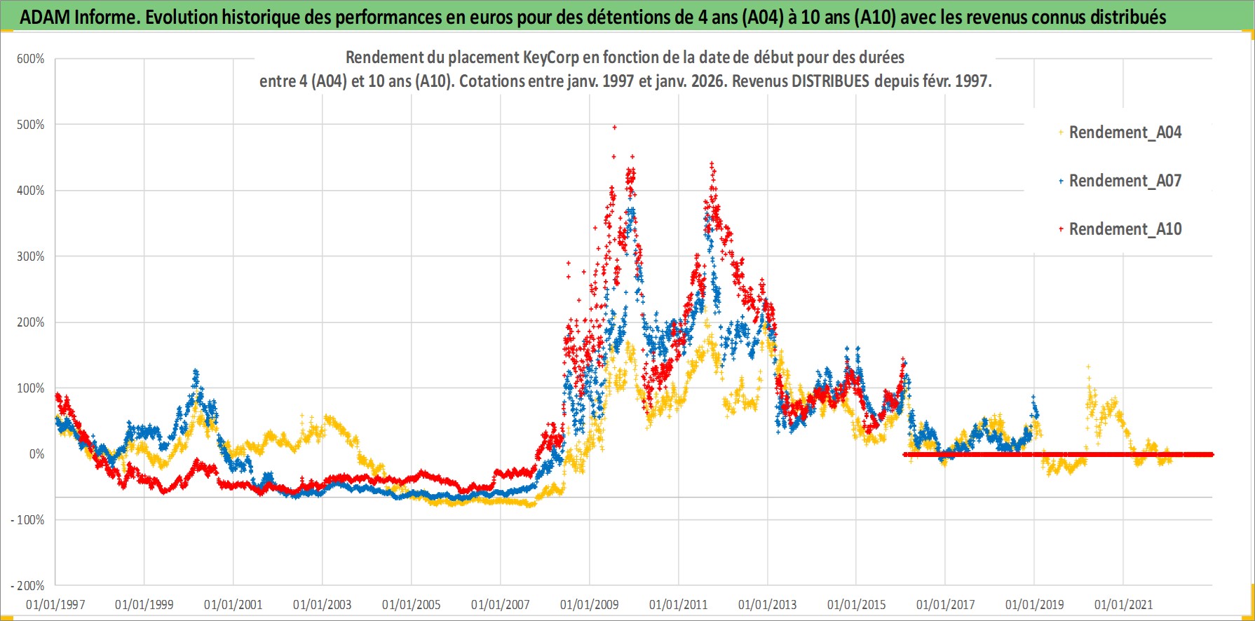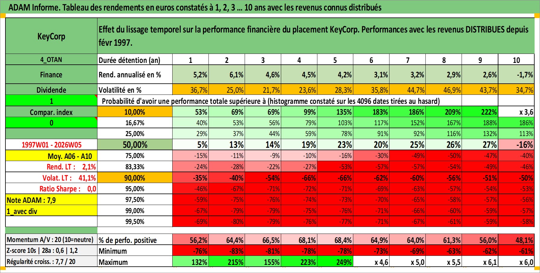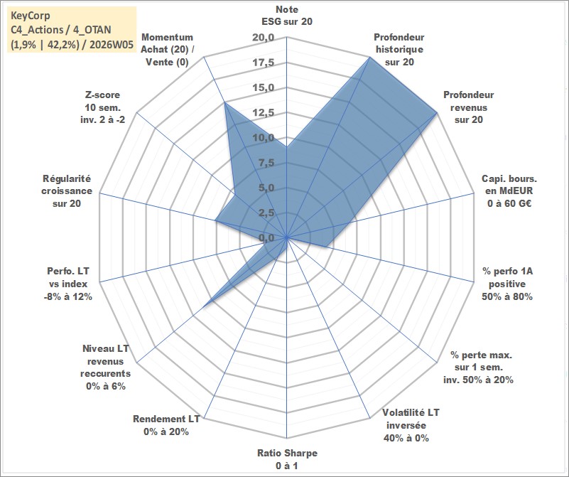 Site dédié aux investisseursPage dédiée sur site financeAnalyse des valorisations hebdomadaires de l'action KeyCorp. Cet actif est cote en USD. Les valorisations sont en contrevaleur EURO et couvrent les semaines 1997W01 a 2026W05. Les revenus de cet actif financier sont pris en compte depuis la semaine 1997W09. La note globale ESG de cet actif est estimee a 9.0 (apres rebasage entre 0 et 20).