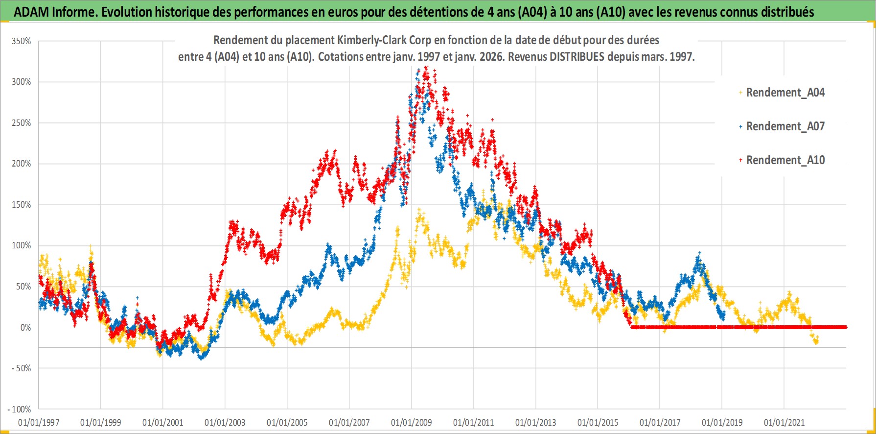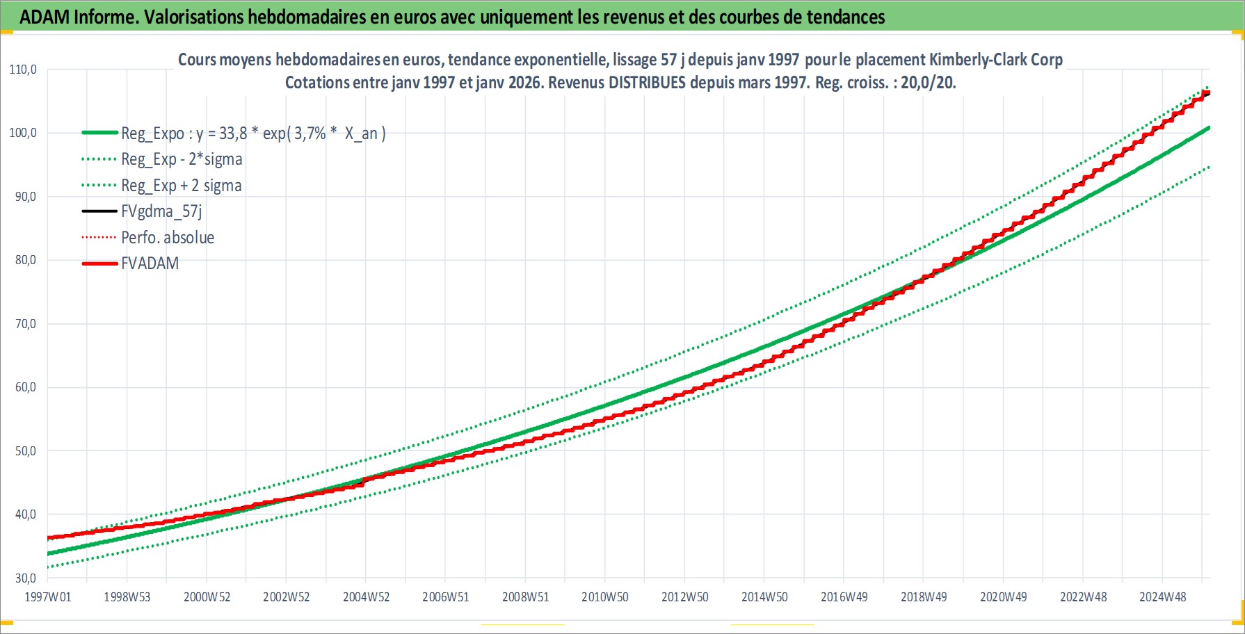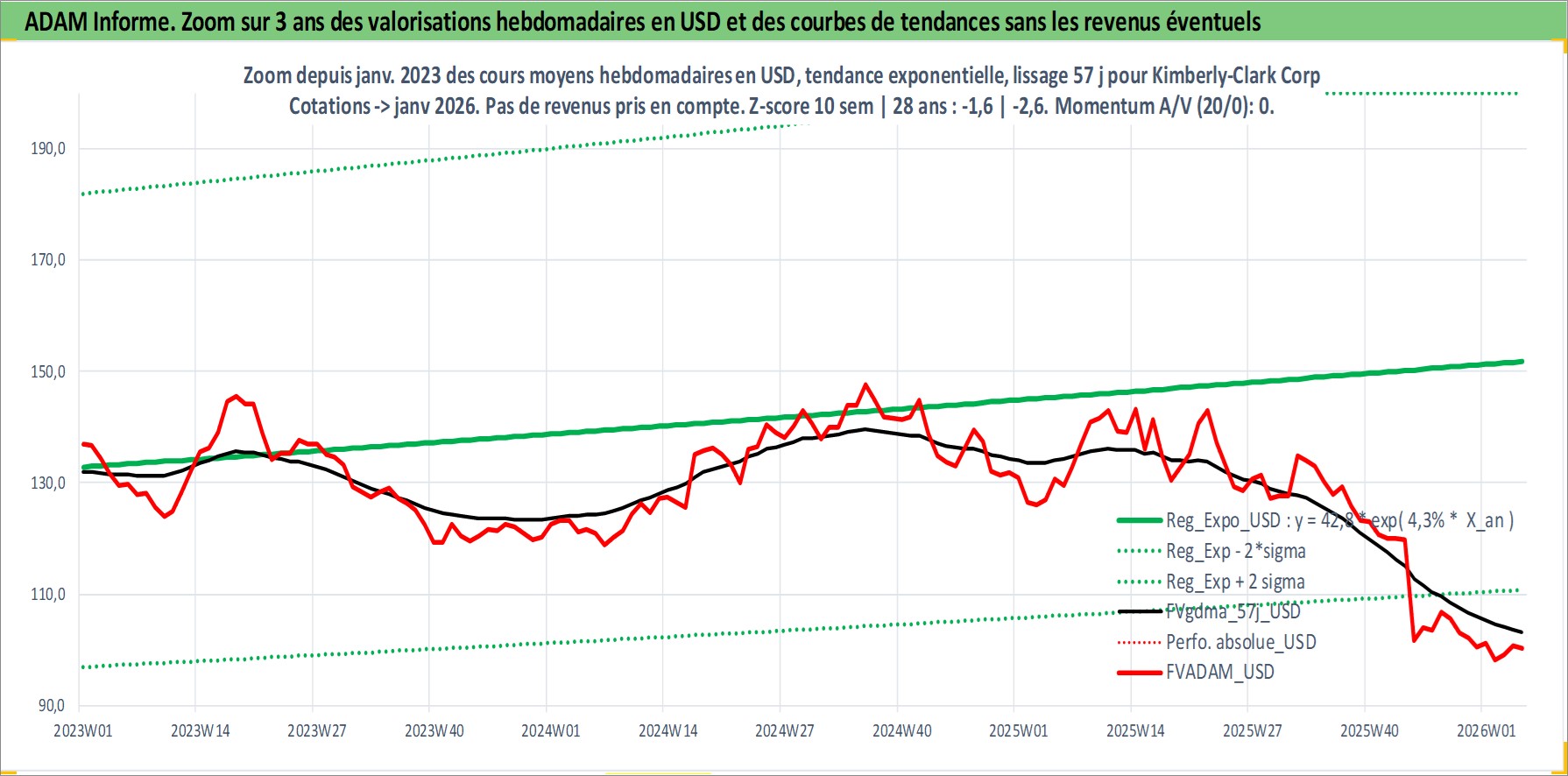 Site dédié aux investisseursPage dédiée sur site financeAnalyse des valorisations hebdomadaires de l'action Kimberly-Clark Corp. Cet actif est cote en USD. Les valorisations sont en contrevaleur EURO et couvrent les semaines 1997W01 a 2026W05. Les revenus de cet actif financier sont pris en compte depuis la semaine 1997W10. La note globale ESG de cet actif est estimee a 9.0 (apres rebasage entre 0 et 20).